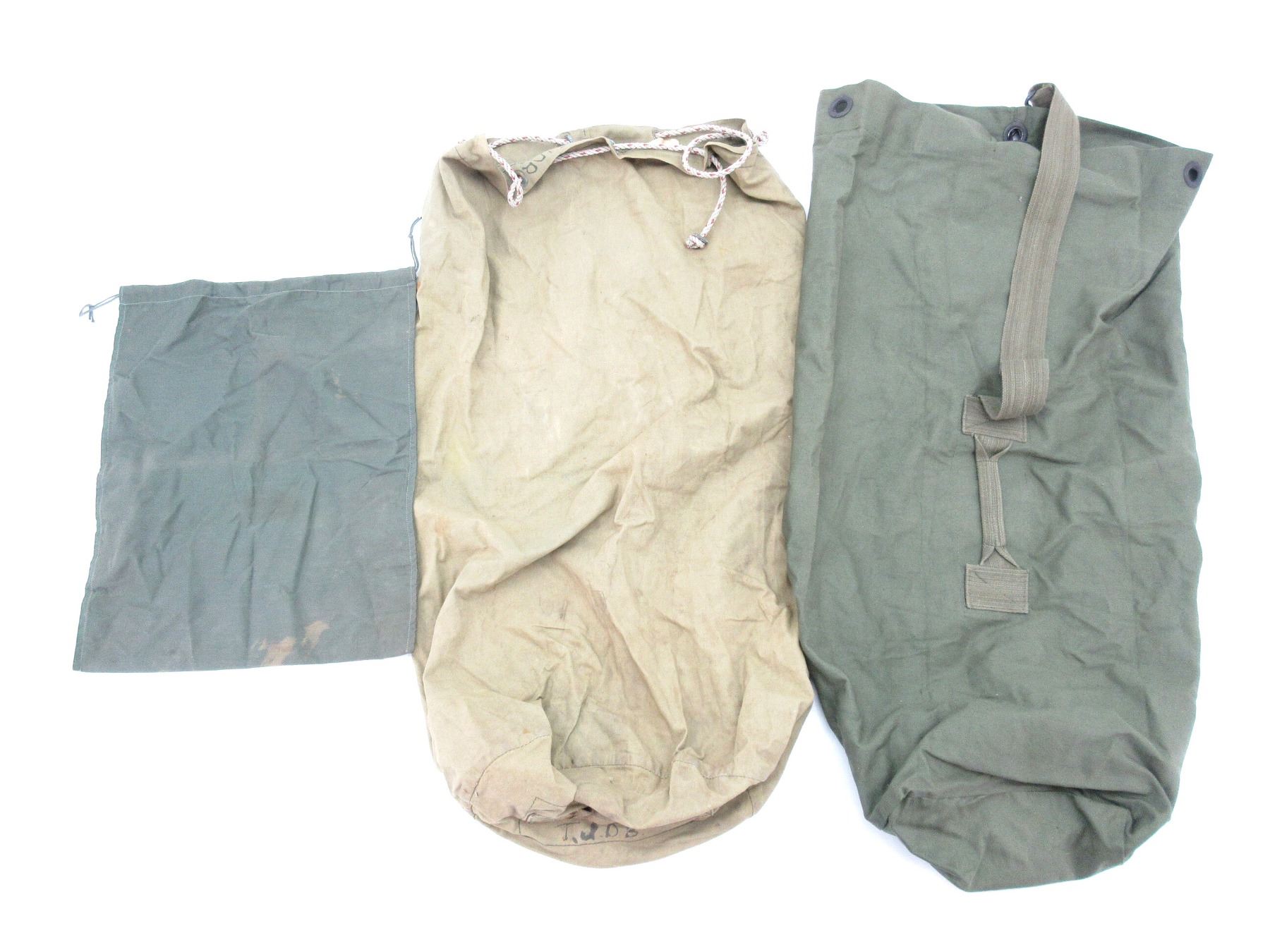 LOT INCLUDES; (1) CANADIAN MILITARY TAN CANVAS DUFFLE BAG, MARKED: "FALCON BRAND, BY S.E. WOODS LTD. HULL, QUE." & "14 X 36, 53", SHOWS AGE / WEAR, (1) U.S. MILITARY GREEN DUFFLE BAG, MARKED: "MADE IN KOREA", CANVAS SHOULDER STRAP & CARRY HANDLE, OAL APPROX. 36" & (1) CANADIAN MILITARY GREEN CANVAS DRAWSTRING BAG, MARKED: "15G/1 COVERALLS, ANTI-G, PNEUMATIC, TYPE G4B, R.C.A.F." ETC., OAL APPROX. 19". SEE PHOTOS.
