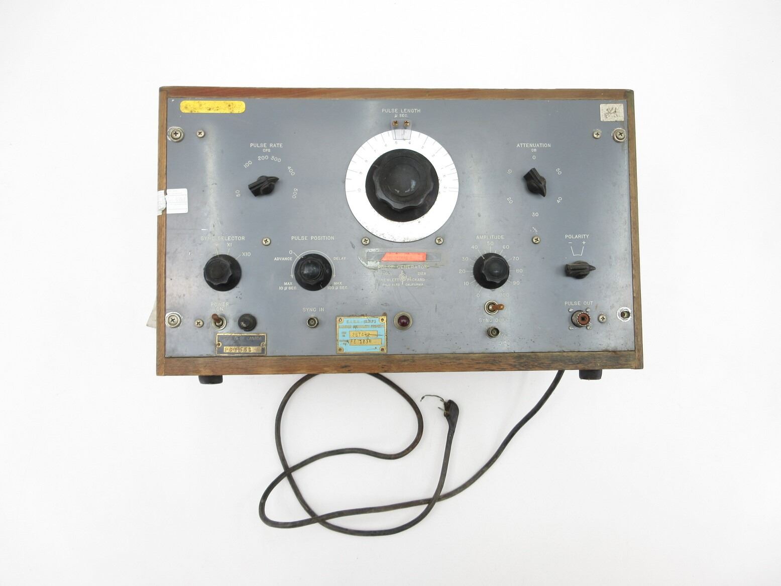 LOT INCLUDES; (1) PULSE GENERATOR, MODEL 212A, MARKED: "HEWLETT PACKARD" & "SPARTON OF CANADA" ETC., VARIOUS DATA PLATES / MARKINGS, UN-TESTED, VARIOUS DIALS / SWITCHES, METAL CARRY HANDLES, PLUG CORD INTACT, WOODEN BOX CRADLING UNIT & APPROX. 20" X 13" X 12.25". SEE PHOTOS.