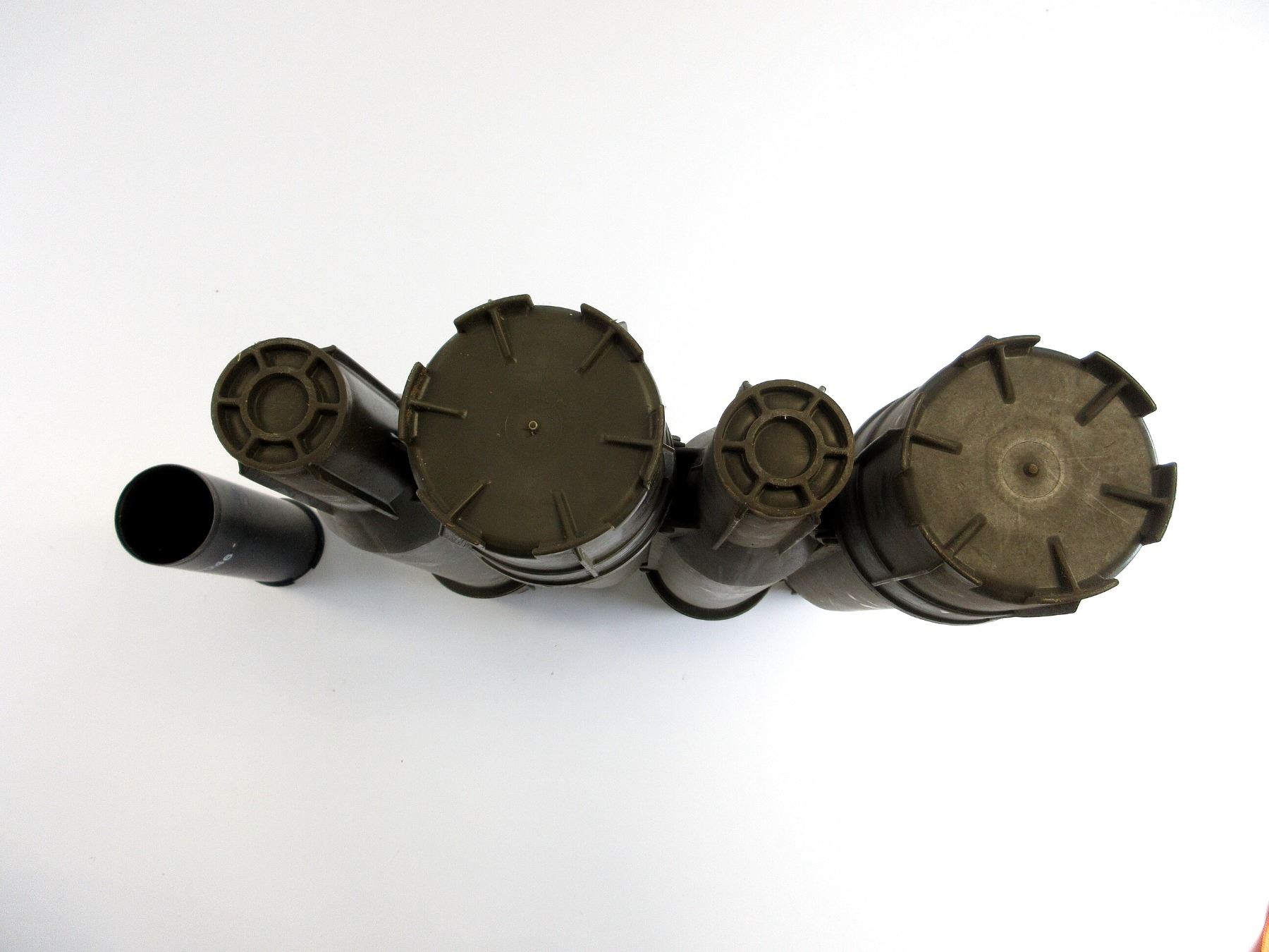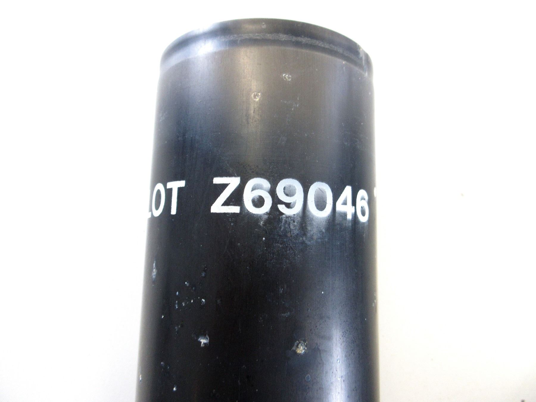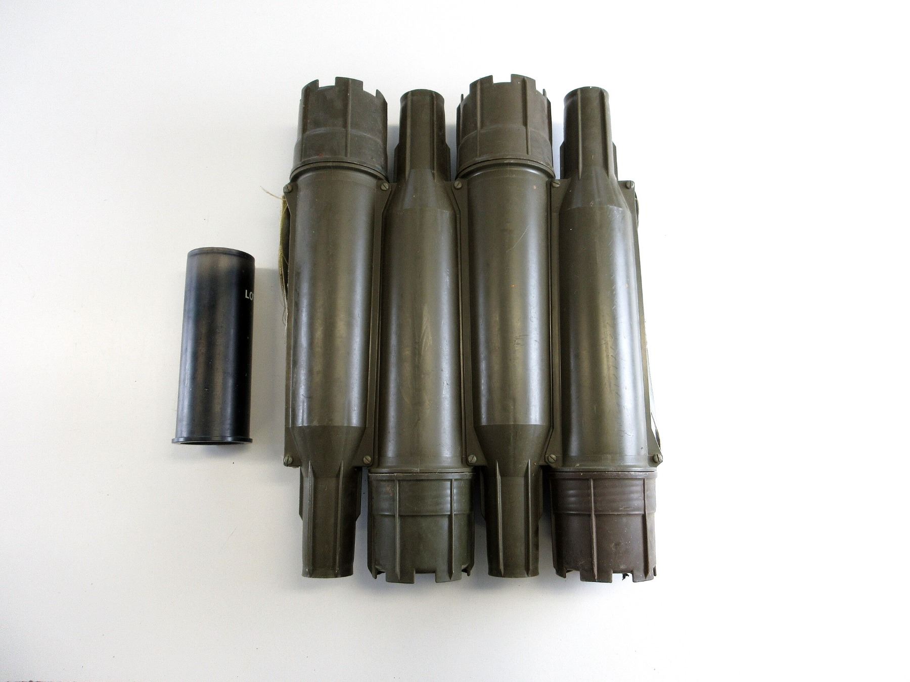 LOT INCLUDES; (1) GREEN POLYMER ROCKET TUBES, SET OF FOUR ATTACHED TOGETHER WITH CARRYING STRAPS, FOR 84MM RECOILLESS ROUNDS, NO VISIBLE MARKINGS, OAL APPROX. 24" & (1) BLACK PAINTED 84MM ROCKET CASING, NON-MAGNETIC, MARKED: "LOT Z69046", APPROX. 3.75" DIA. & OAL APPROX. 9 5/8". SEE PHOTOS.