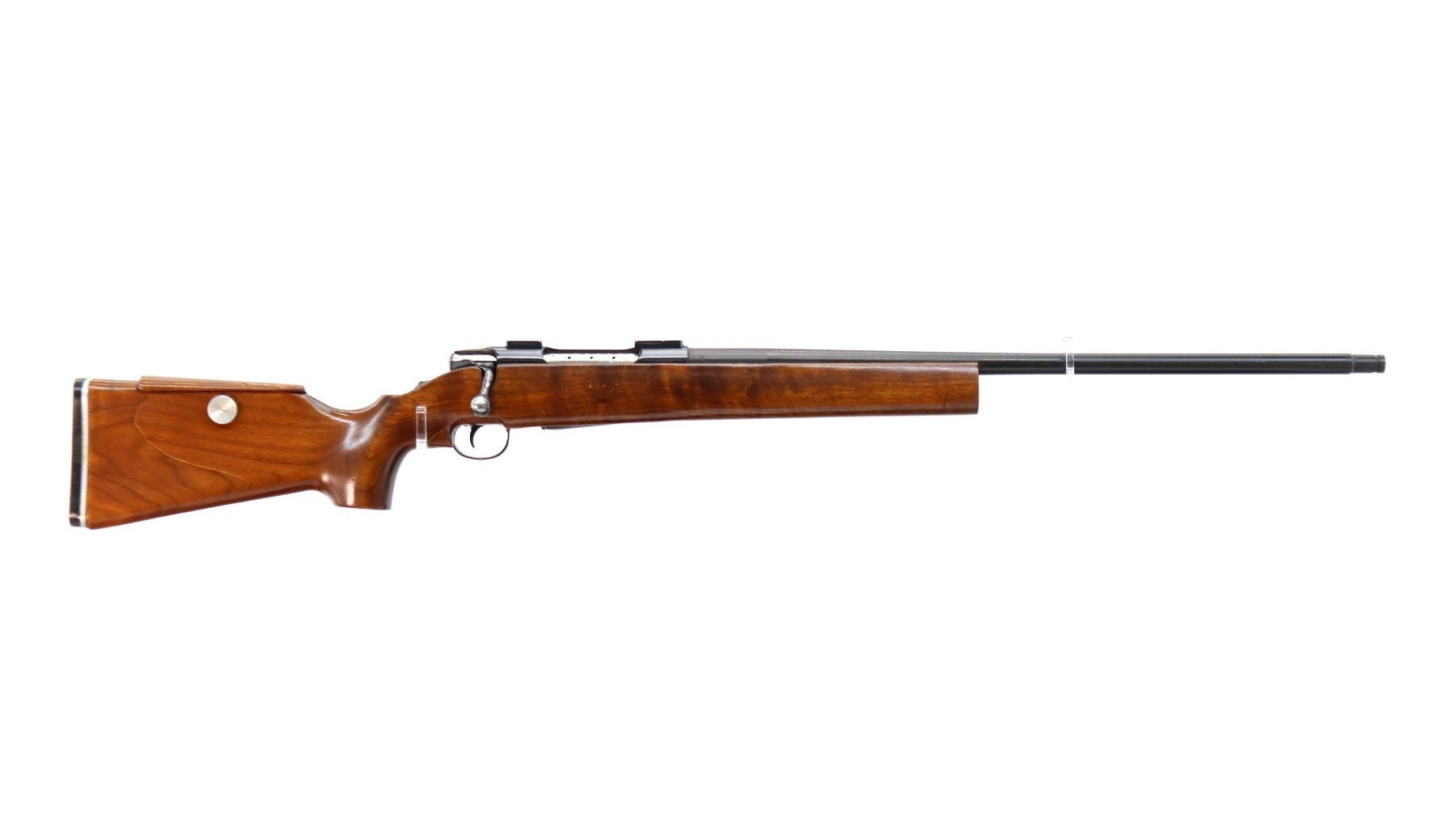 Main Description: No sights, Parkerized hammer forged barrel with rebated muzzle, blued receiver with two piece scope bases installed, smooth bolt knob, tang safety. One piece wood target stock, heavy forend, thumb rest pistol grip with right hand palm swell, adjustable wood cheek rest, grooved black polymer butt plate with alloy spacer, 14.25" LOP, adjustable trigger.