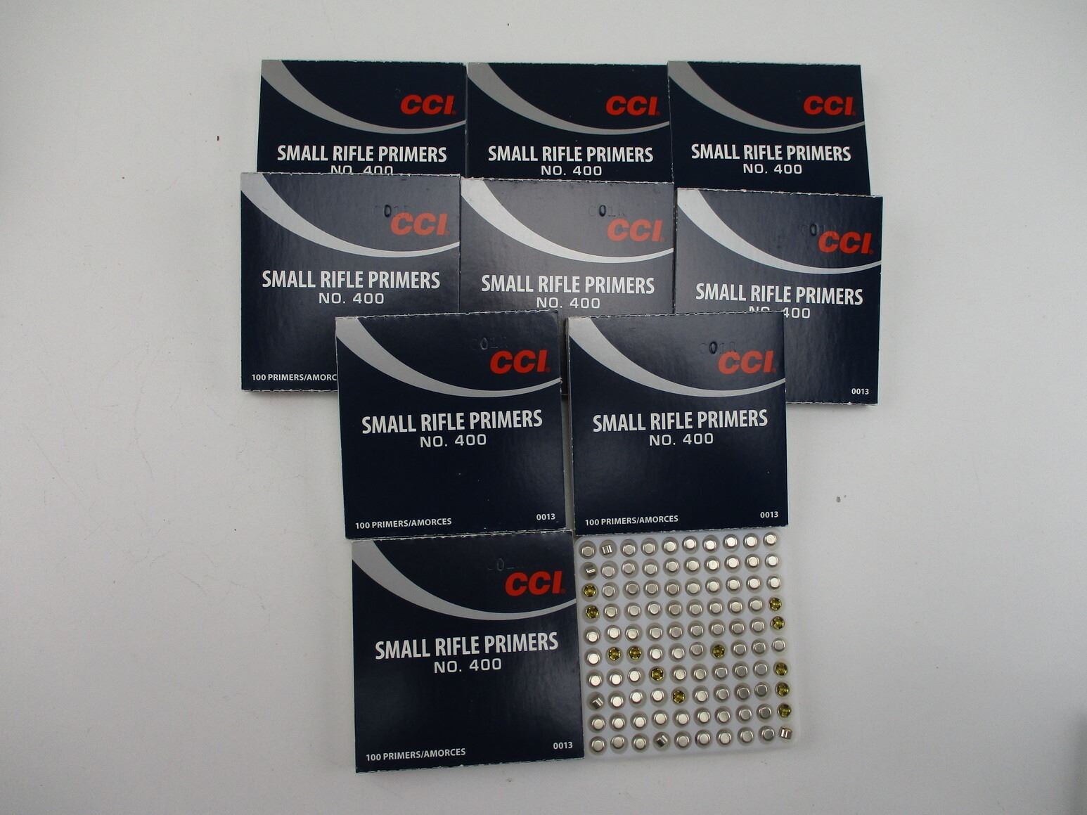 CCI SMALL RIFLE PRIMERS , APPROX 900 PRIMERS, NO.400 , THERE ARE NEW SHIPPING RESTRICTIONS, PLEASE MAKE SURE YOU HAVE READ AND CONFIRMED WE CAN SHIP TO YOU BEFORE BIDDING ON THIS LOT. PLEASE SEE LOT 0 IN THIS SESSION. NO REFUNDS WILL BE ISSUED, OR BIDS RETRACTED.