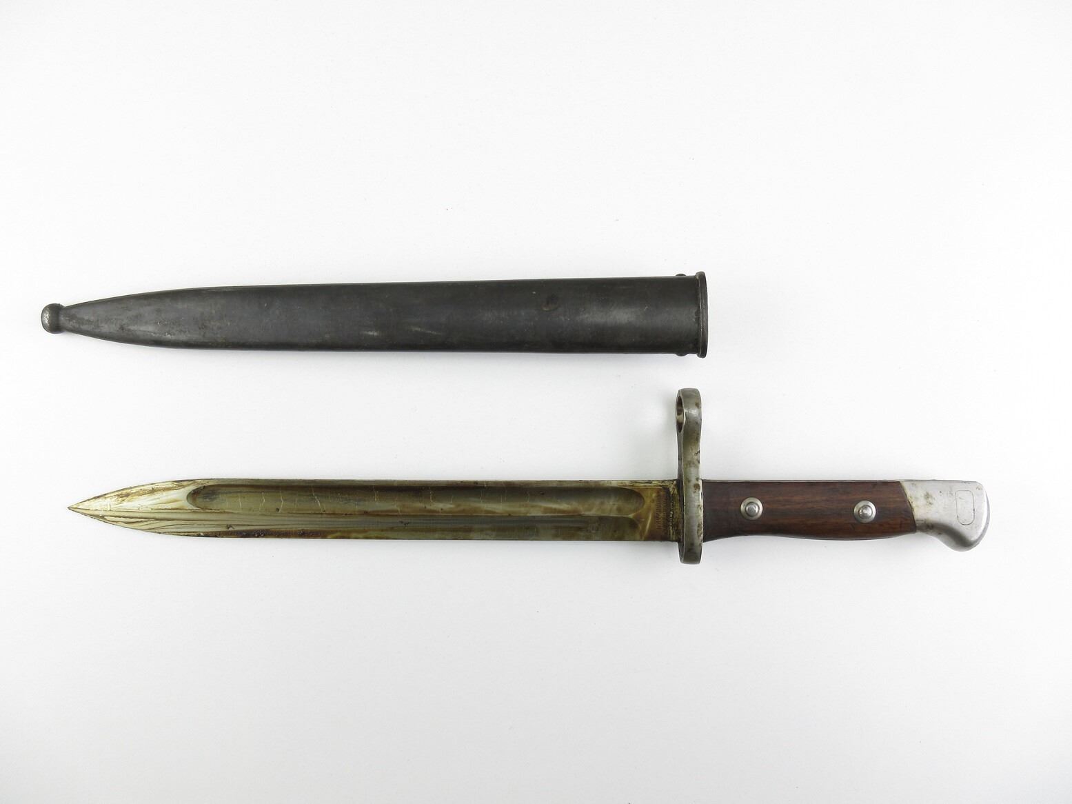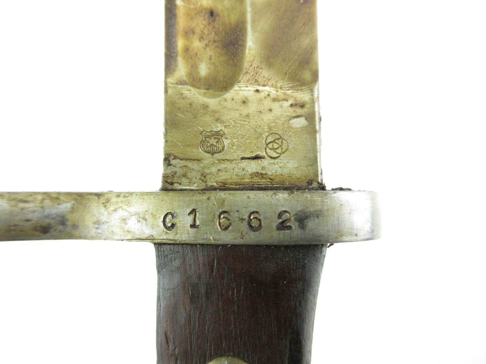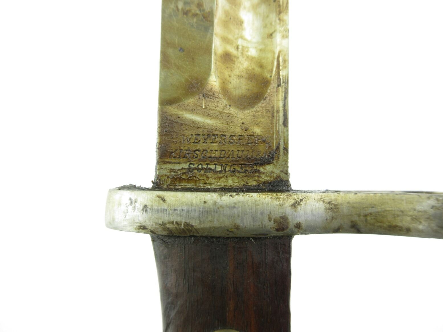 CHILEAN M1895 BAYONET. (1) FITS 7MM M1895 MAUSER RIFLES, RICASSO MARKED: CHILEAN CREST & OTHER PROOF MARK, OTHER-SIDE MARKED: "WEYERSBERG KIRSCHBAUM & CO., SOLINGEN", CROSS-PIECE MARKED: "C1662", 2-PIECE WOOD GRIP, METAL POMMEL, NO VISIBLE MARKINGS, STEEL SCABBARD STUD MARKED: "C1662" & PROOF MARK ON BALL TIP, BLADE APPROX. 10" & OAL APPROX. 14.75". SEE PHOTOS. *BLADE COVERED IN GREASE*