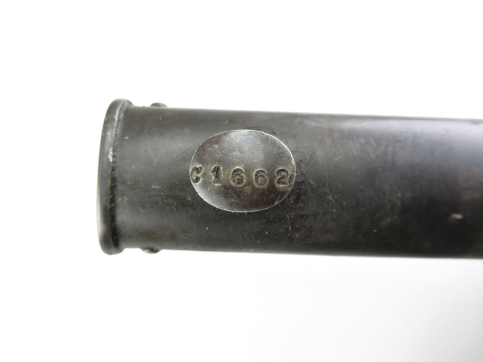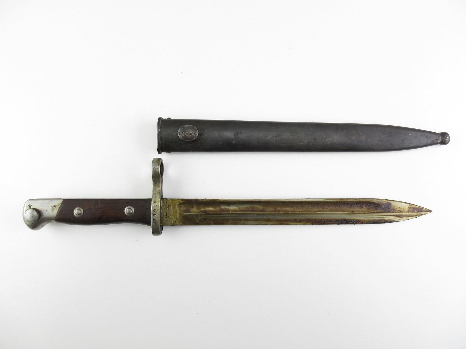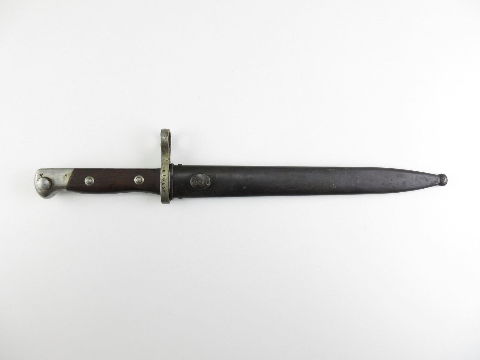 CHILEAN M1895 BAYONET. (1) FITS 7MM M1895 MAUSER RIFLES, RICASSO MARKED: CHILEAN CREST & OTHER PROOF MARK, OTHER-SIDE MARKED: "WEYERSBERG KIRSCHBAUM & CO., SOLINGEN", CROSS-PIECE MARKED: "C1662", 2-PIECE WOOD GRIP, METAL POMMEL, NO VISIBLE MARKINGS, STEEL SCABBARD STUD MARKED: "C1662" & PROOF MARK ON BALL TIP, BLADE APPROX. 10" & OAL APPROX. 14.75". SEE PHOTOS. *BLADE COVERED IN GREASE*