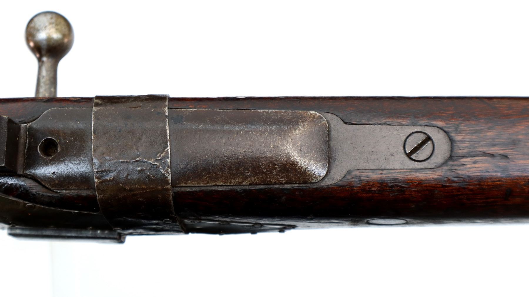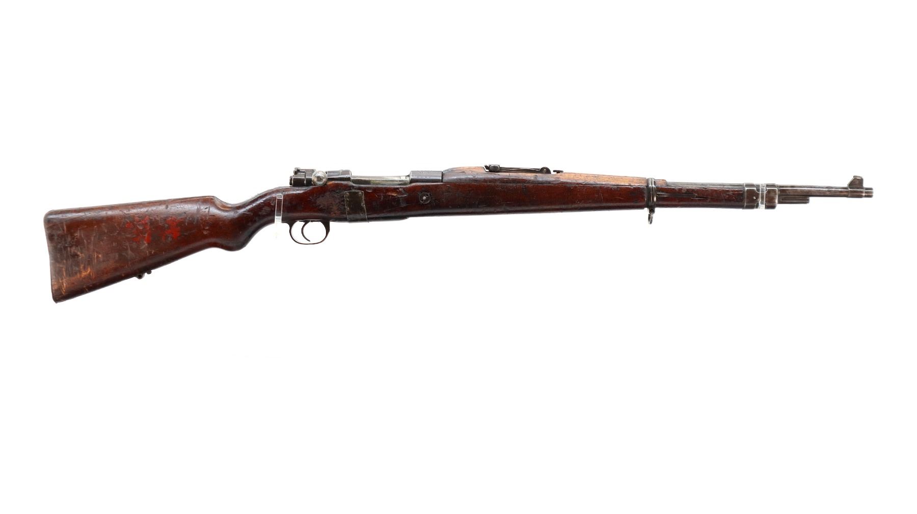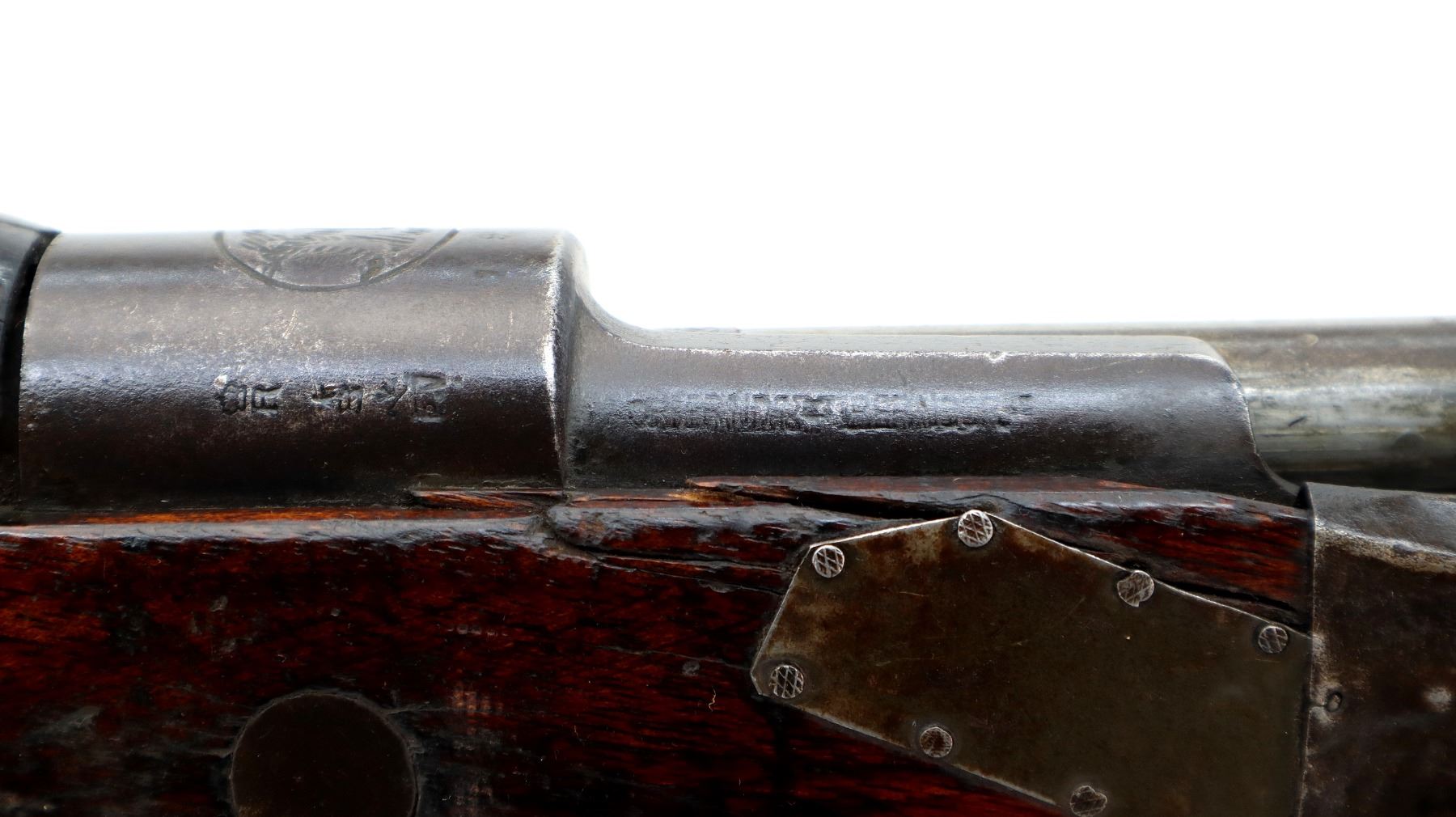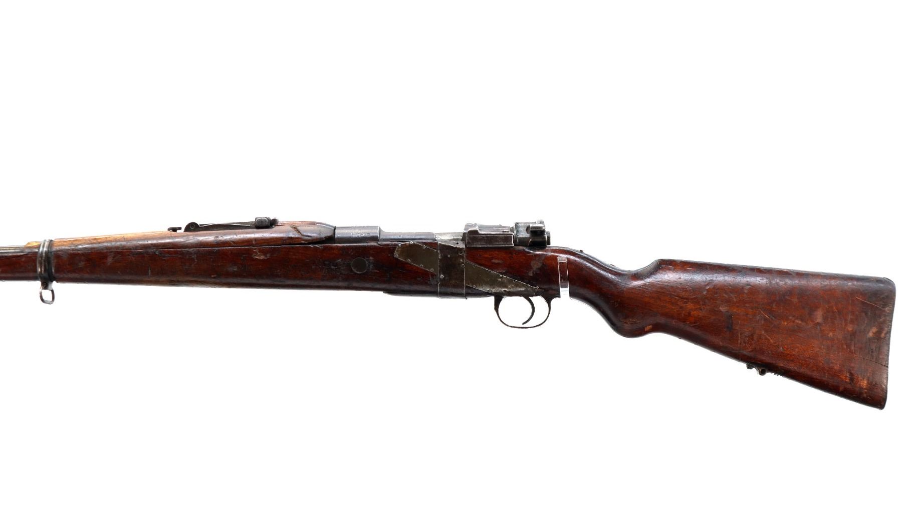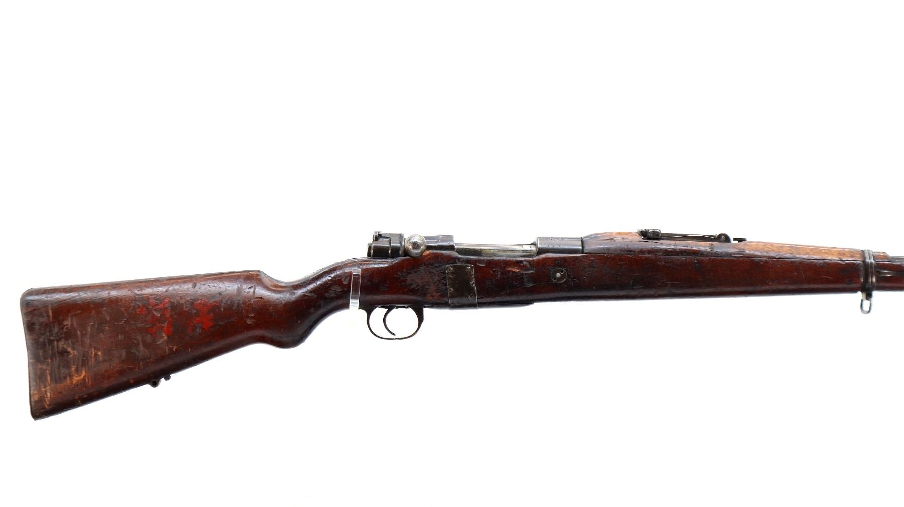 Main Description: Note: This rifle is a copy of an FN Belgian Mauser with incorrect FN logo and proof marks with red painted Chinese Characters on right side of stock, Numbers mismatched. This rifle has a unique repair around the stock, using sheet steel and nails which is coming loose. Barley corn front sight with ramp, adjustable u notched rear sight, FN crest on receiver ring, straight bolt handle. Two piece full military wood stocks, handguard is chipped and cracked, forearm is chipped and cracked, pistol grip, cracked behind receiver, smooth steel butt plate, stock cracked at toe, missing rear swivel and cleaning rod, has a front swivel and bayonet lug.