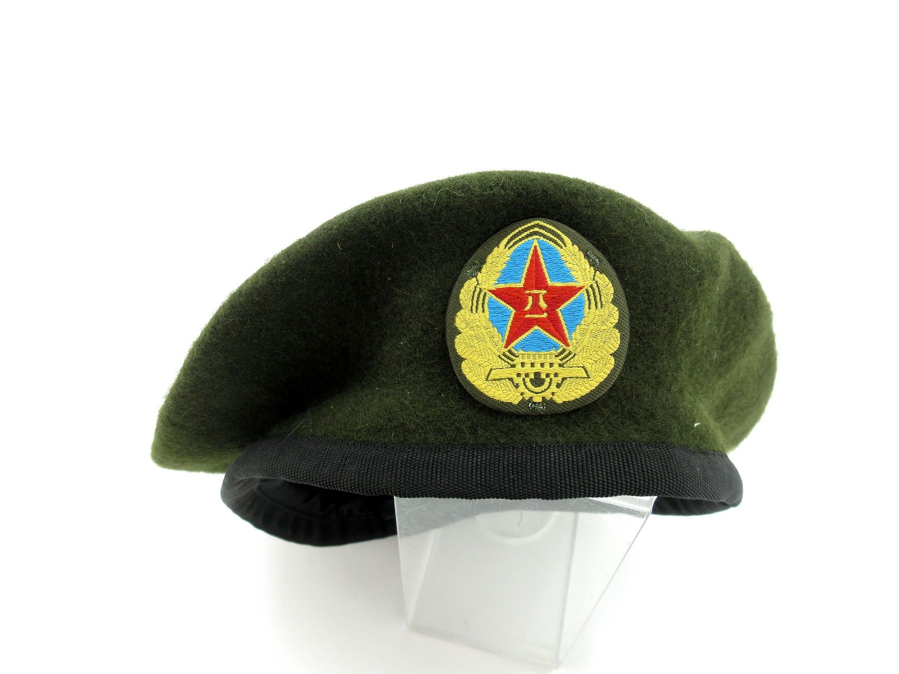 (1) GREEN WOOL BERET WITH FABRIC CAP BADGE, VARIOUS CHINESE CHARACTERS INSIDE BERET, DRAWSTRING TIES ON BACK. SEE PHOTOS.