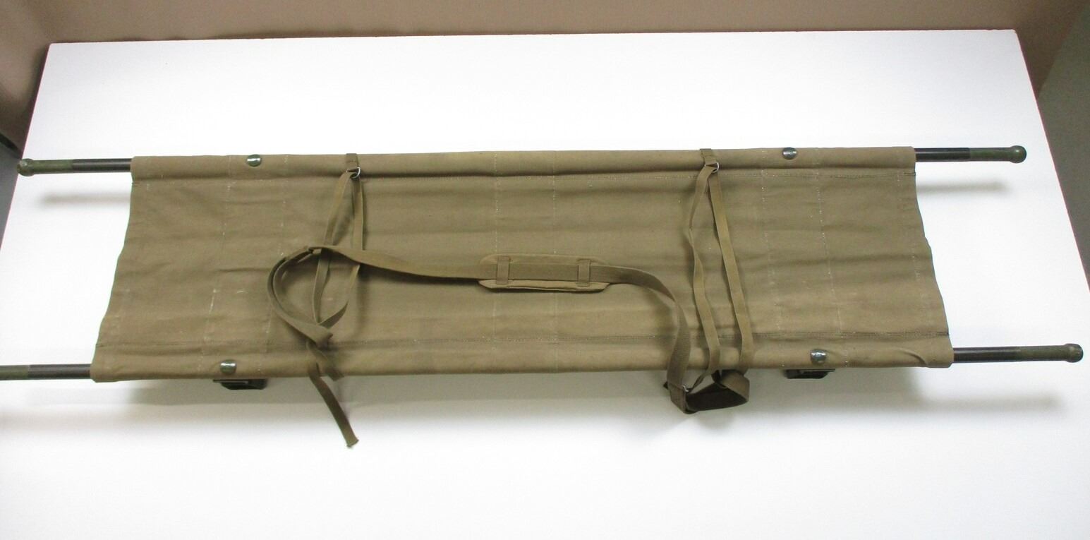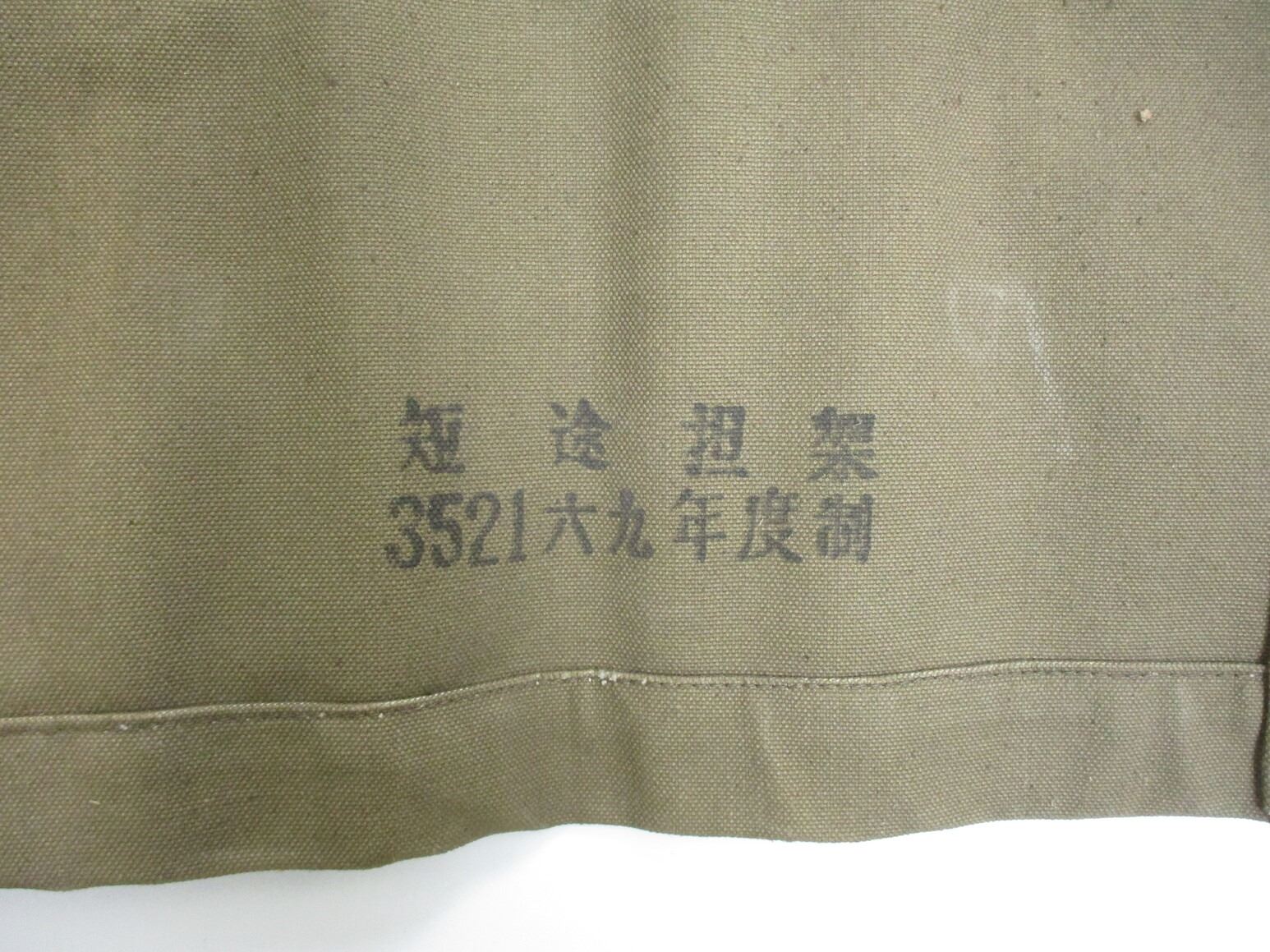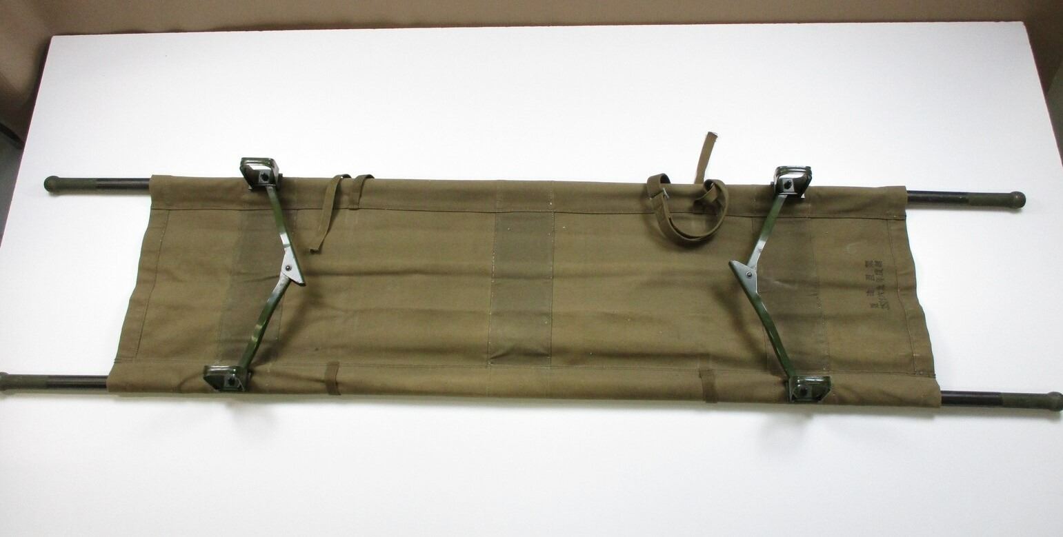 CHINESE TYPE MILITARY STRETCHER , LIGHT BROWN CANVAS MATERIAL WITH CANVAS STRAPS, WOODEN HANDLES, METAL FRAME. VARIOUS CHINESE WRITING ON BOTTOM OF CANVAS MATERIAL. APPROXIMATELY 89" OVERALL LENGTH.