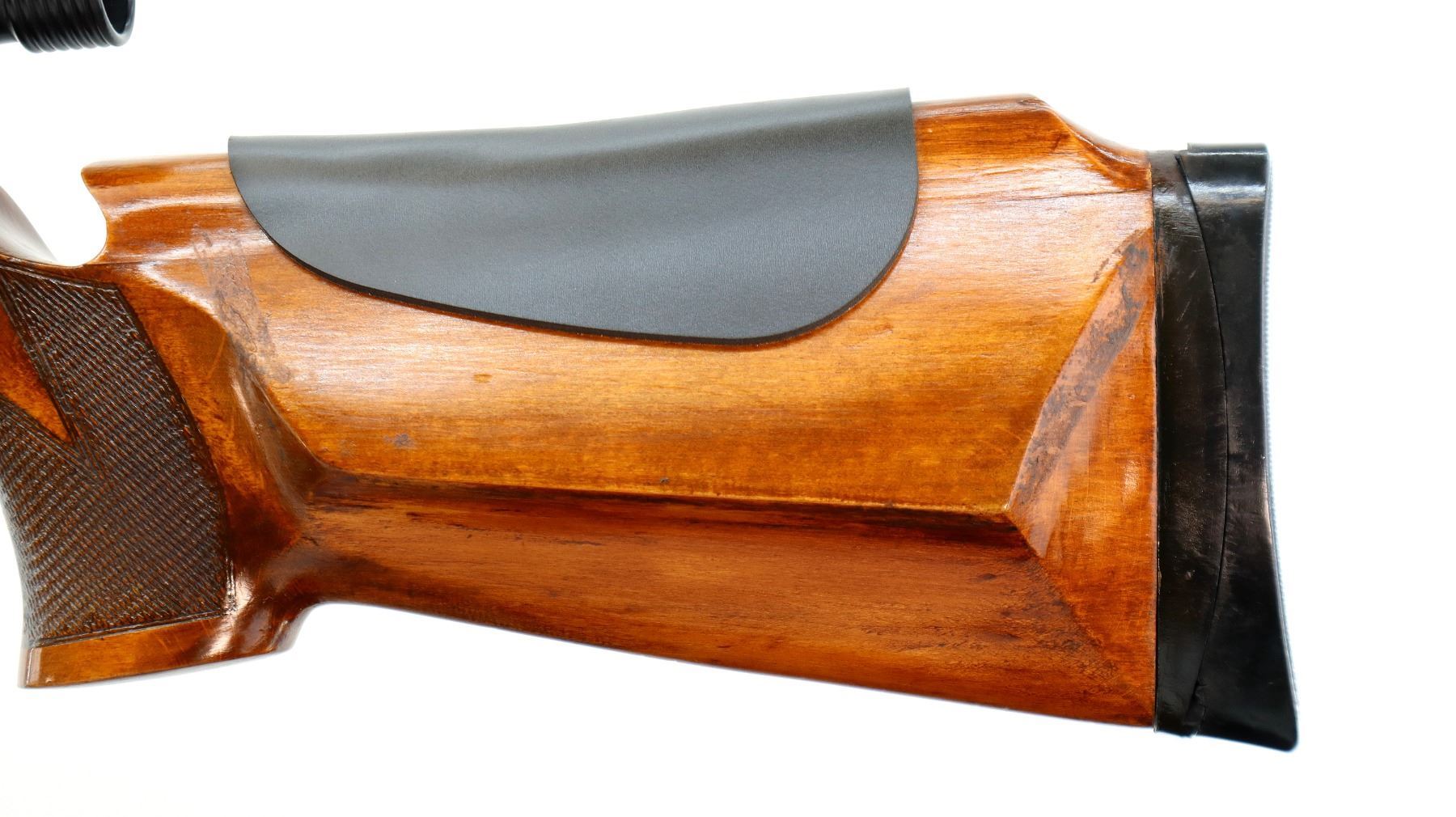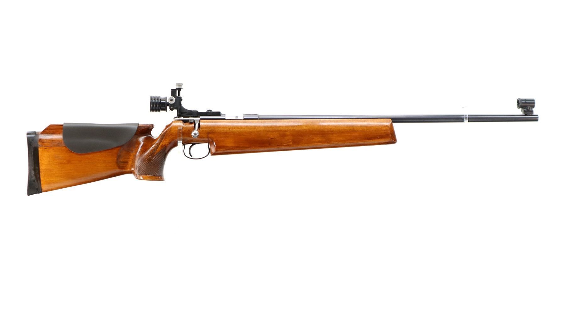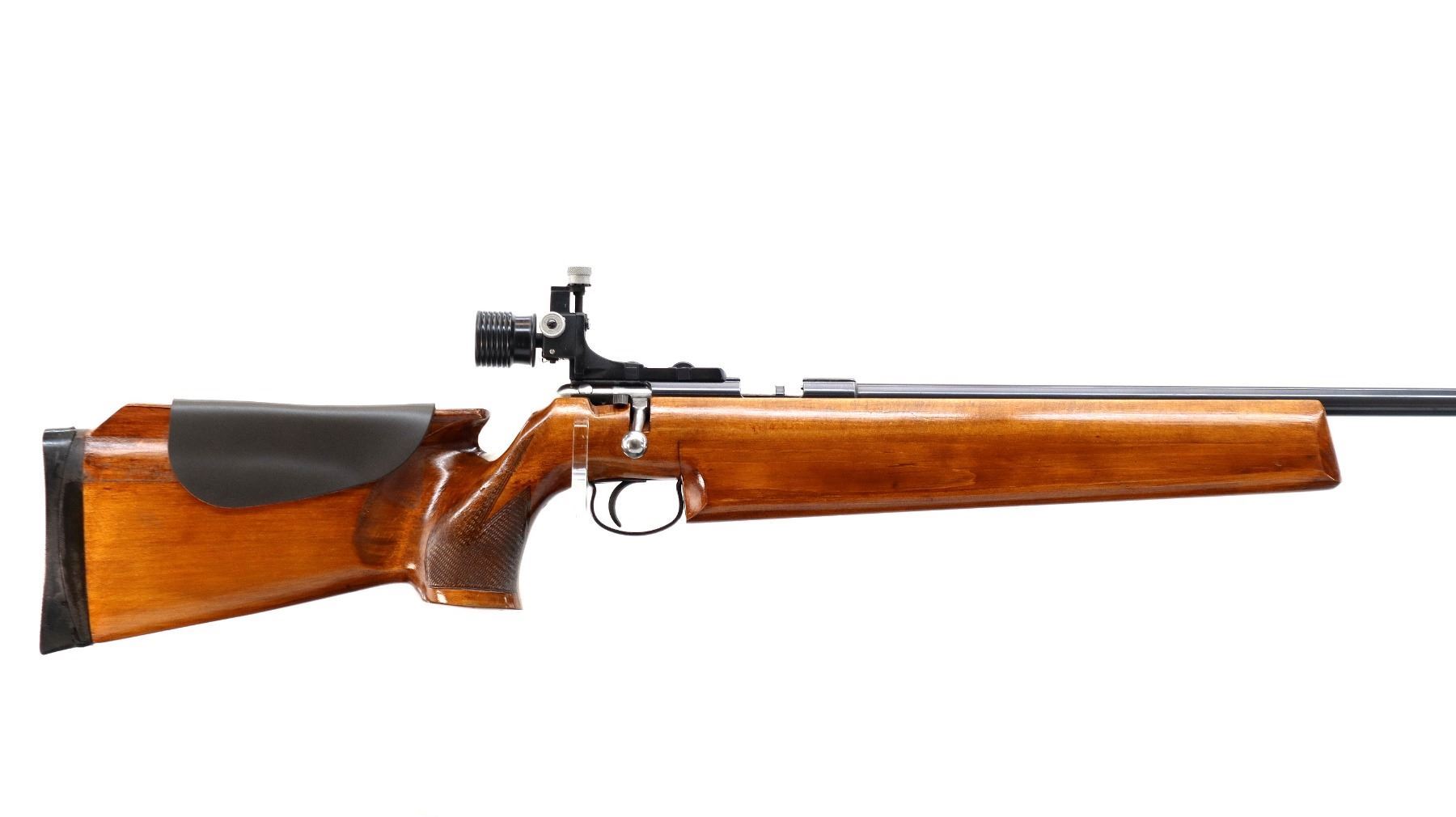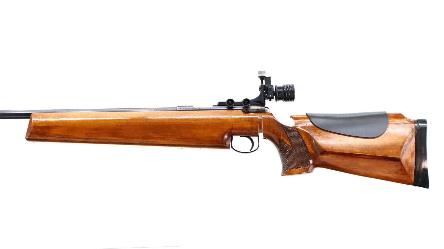 Main Description: Globe front sight with insert and ramp, adjustable Anschutz rear peep sight with black rubber eye cup, blued finish, grooved receiver also drilled and tapped on left side. One piece modified target stock, checkered thumb rest pistol grip, cheek rest with black foam pad, adjustable checkered black polymer butt plate, stock cracked at heel, 13" LOP, missing swivels holes are present.