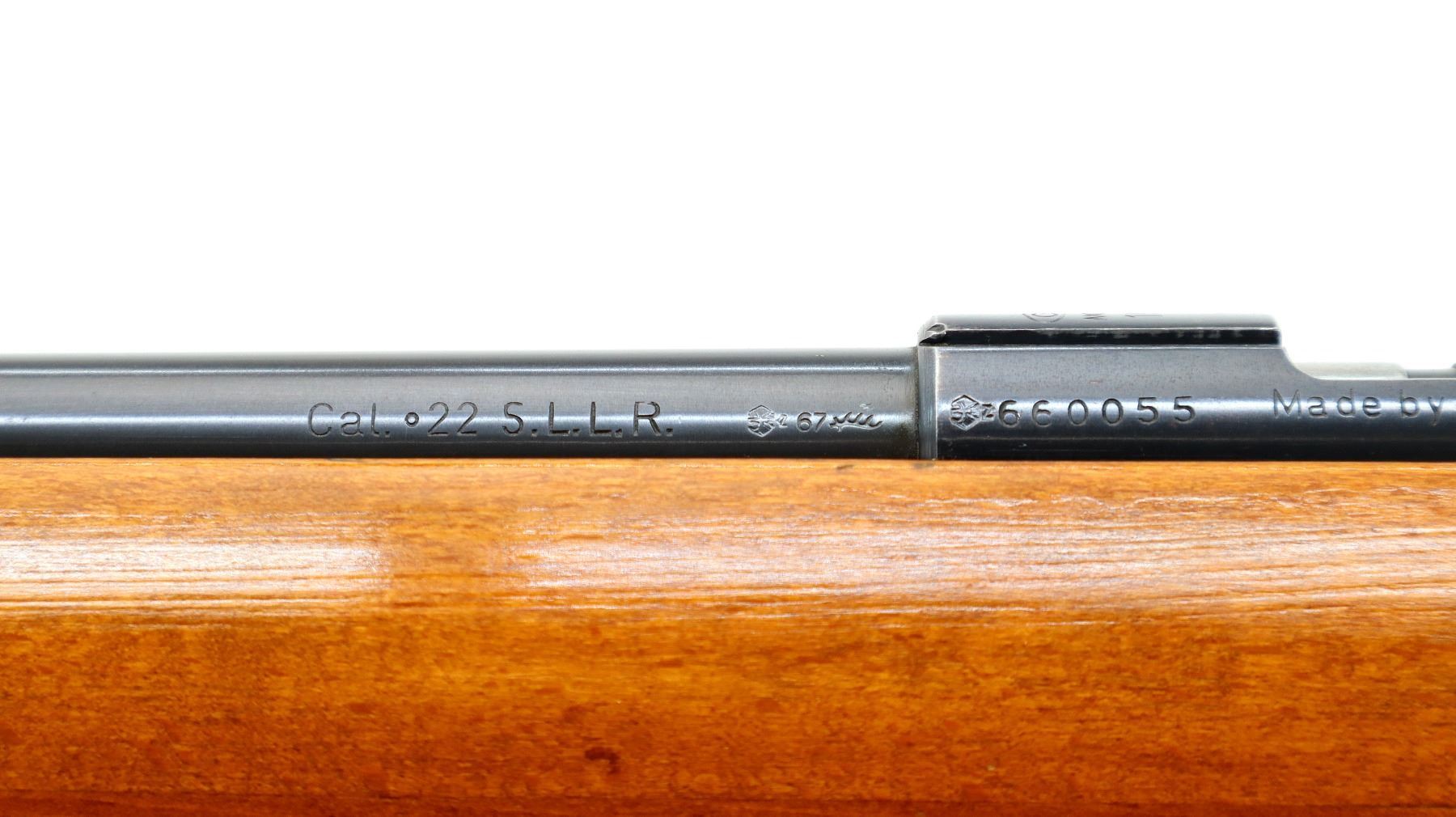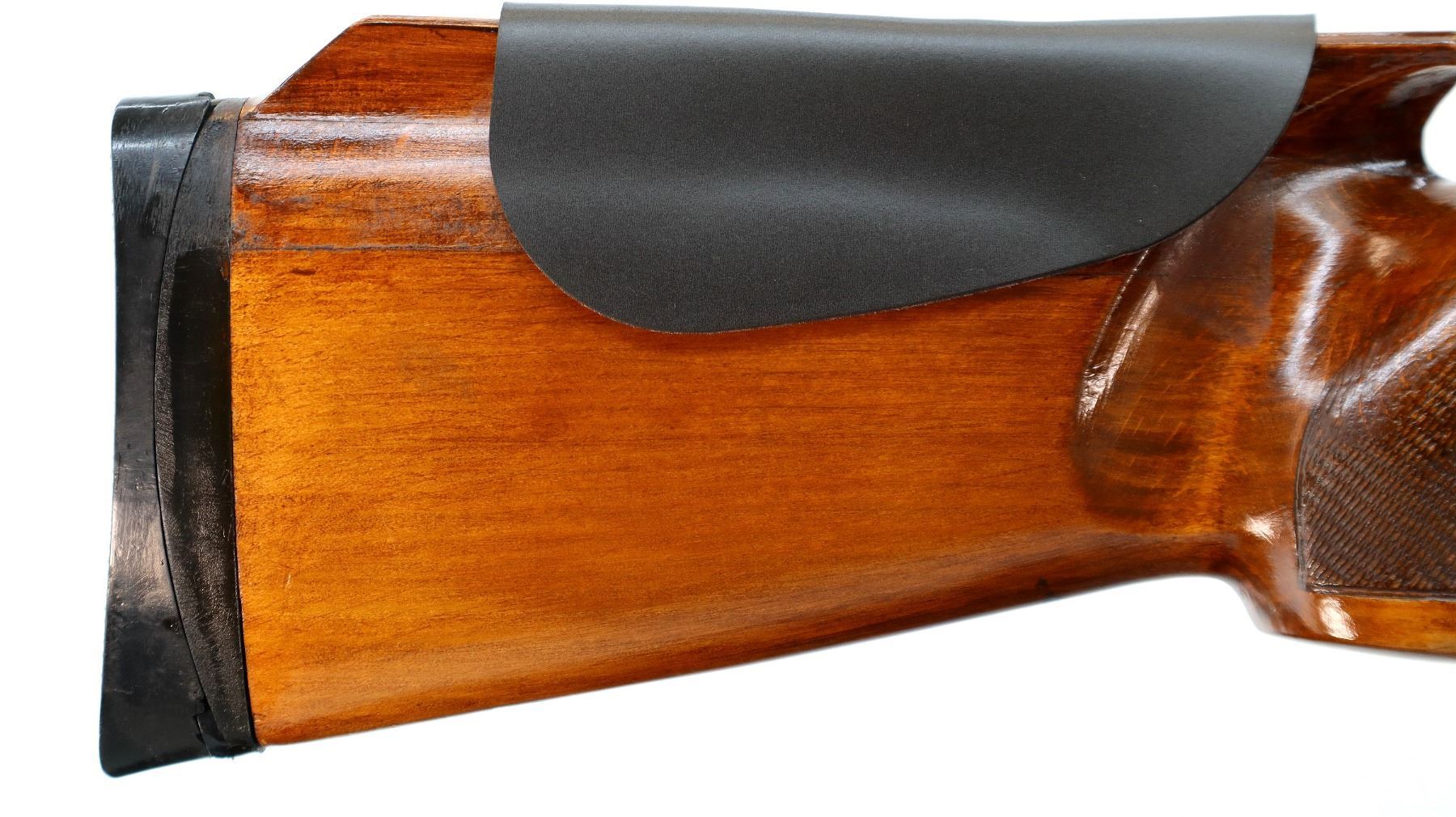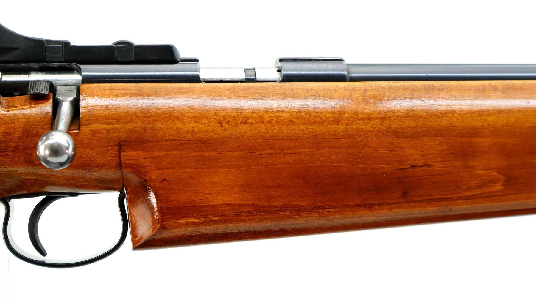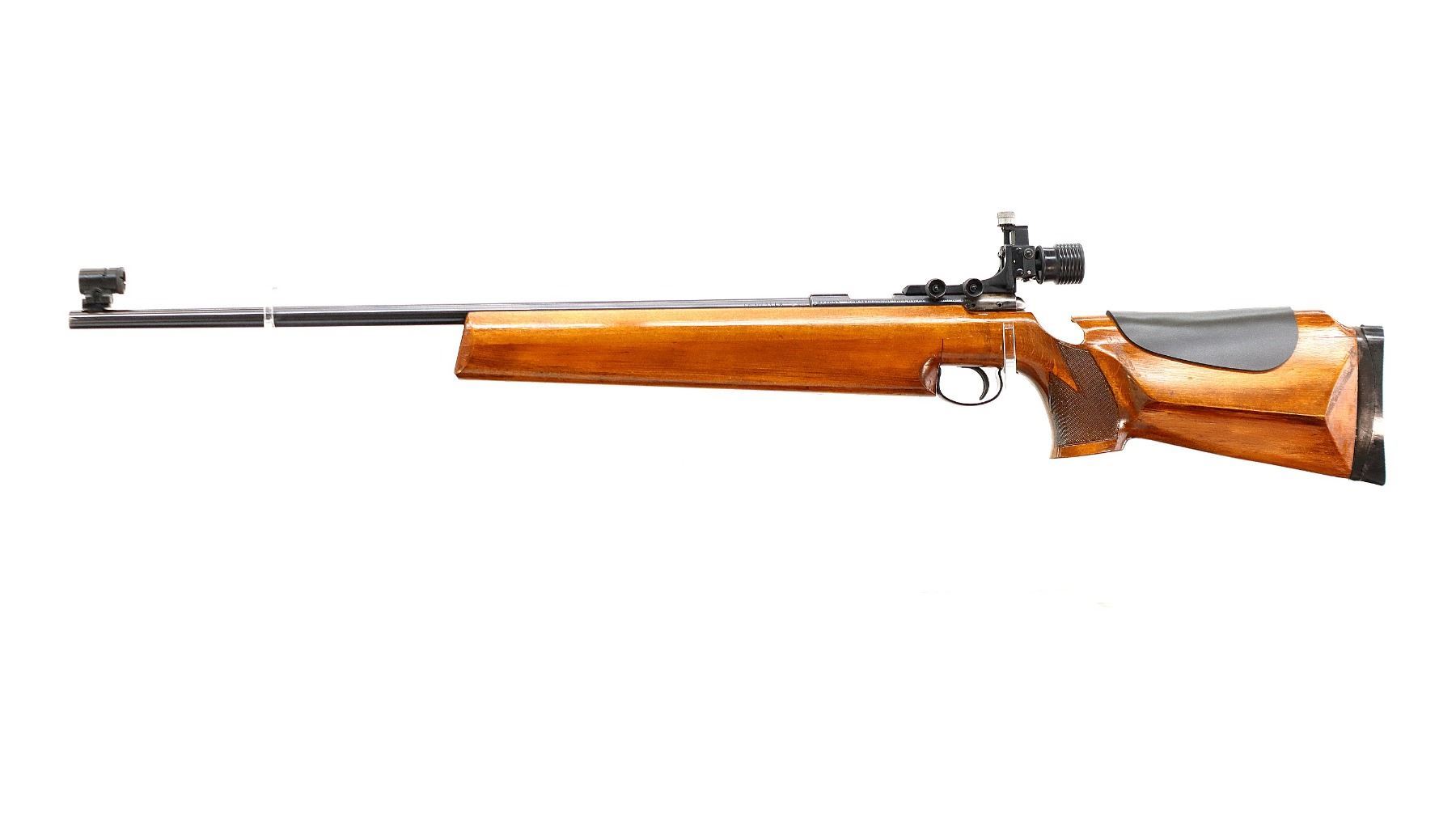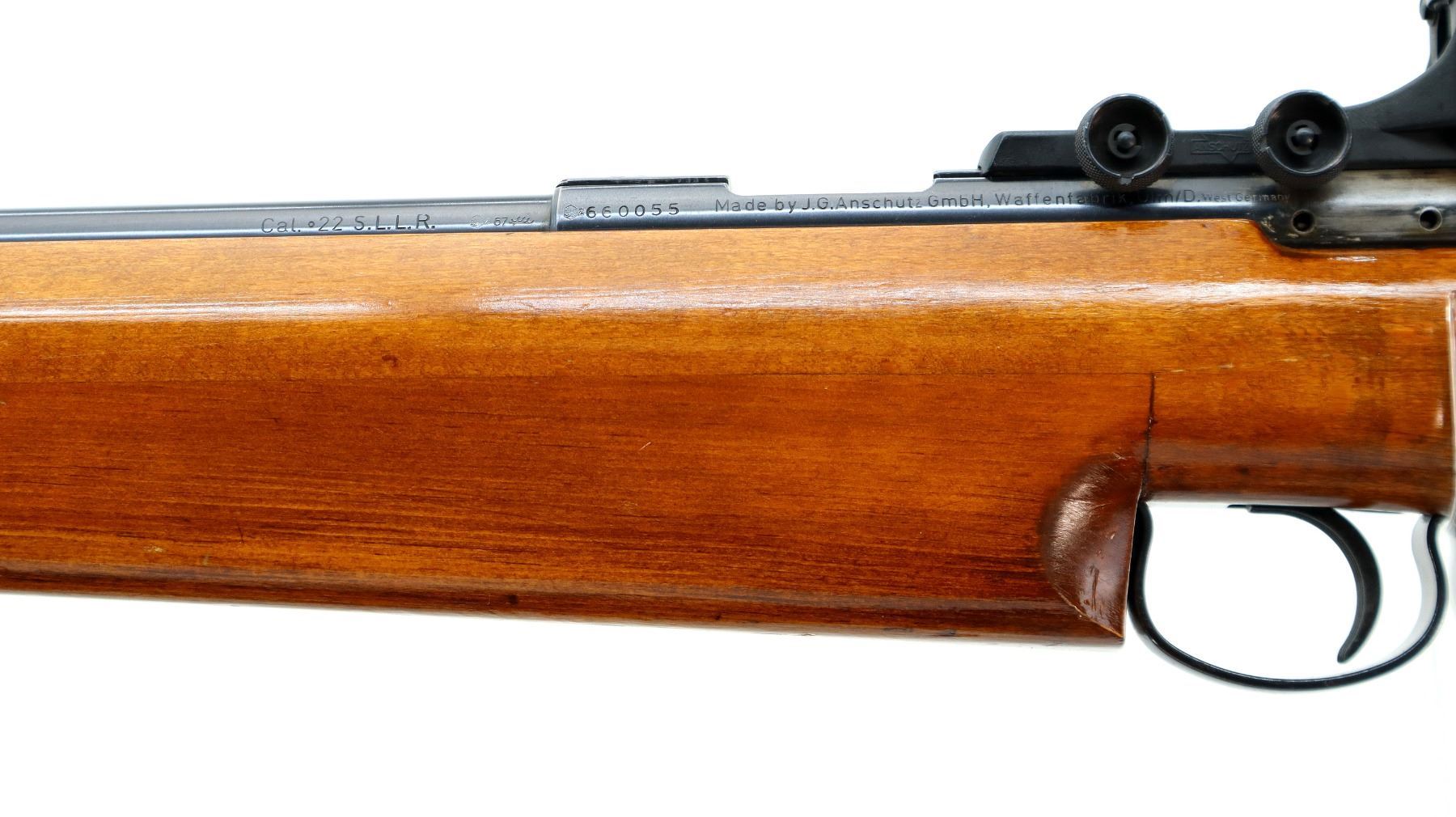 Main Description: Globe front sight with insert and ramp, adjustable Anschutz rear peep sight with black rubber eye cup, blued finish, grooved receiver also drilled and tapped on left side. One piece modified target stock, checkered thumb rest pistol grip, cheek rest with black foam pad, adjustable checkered black polymer butt plate, stock cracked at heel, 13" LOP, missing swivels holes are present.