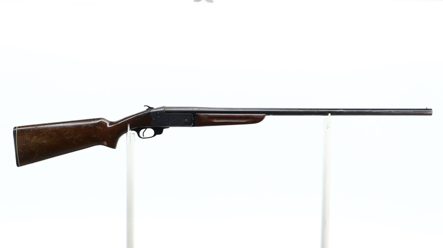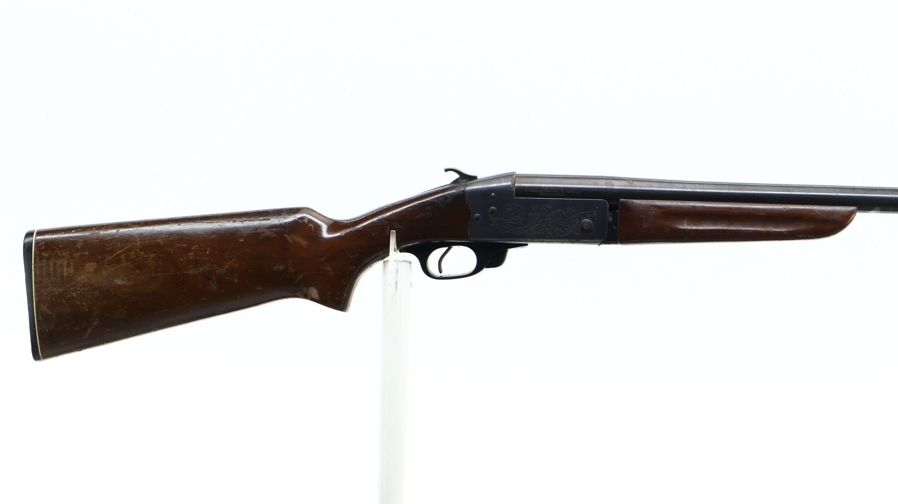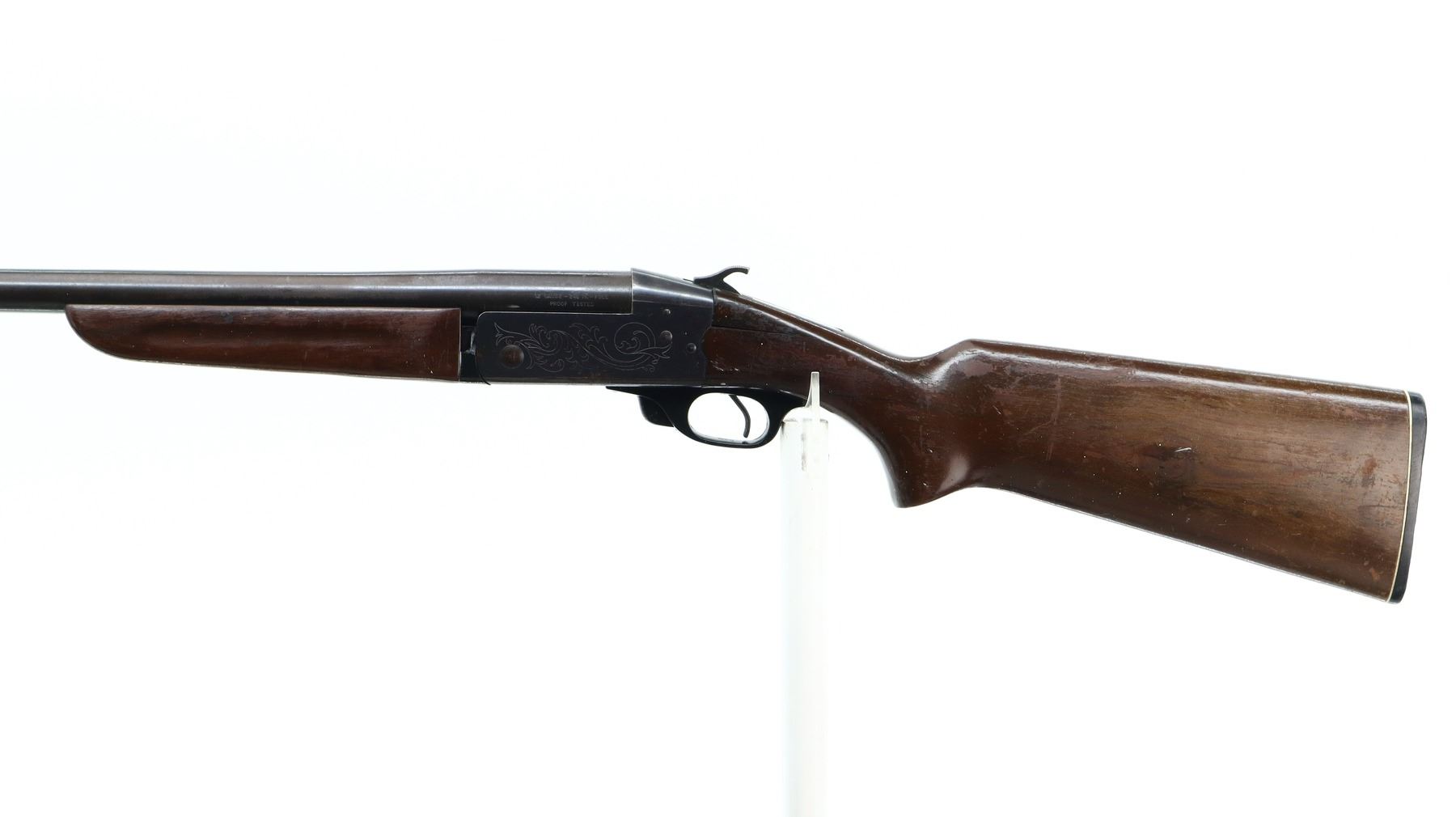 3+/10 , CIL , MODEL: 402 , CALIBER: 12 GA X 2 3/4" , BORE IS VERY GOOD. FIXED FULL CHOKE. BRASS BEAD, ROUND BARREL, ENGRAVED RECEIVER, EJECTOR. TWO PIECE WOOD STOCKS, PISTOL GRIP, FOREARM SPACER CRACKED IN FRONT OF RECEIVER, STOCK CRACKED BEHIND RECEIVER, GROOVED BLACK POLYMER BUTT PLATE. METAL FINISH SHOWS LIGHT RUST SPECKLES, HANDLING MARKS AND WEAR. STOCKS SHOW DINGS, SCRATCHES AND FINISH WEAR.. ACTION: HINGE SINGLE SHOT SHOTGUN. BARREL LENGTH: 29.75". CONDITION: 3+/10. SERIAL # 76853. CLASS: CANADIAN NON RESTRICTED CLASS