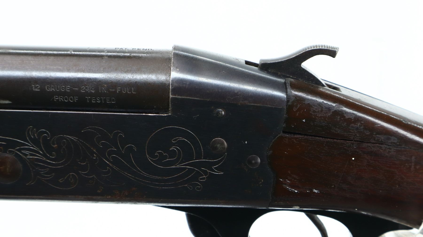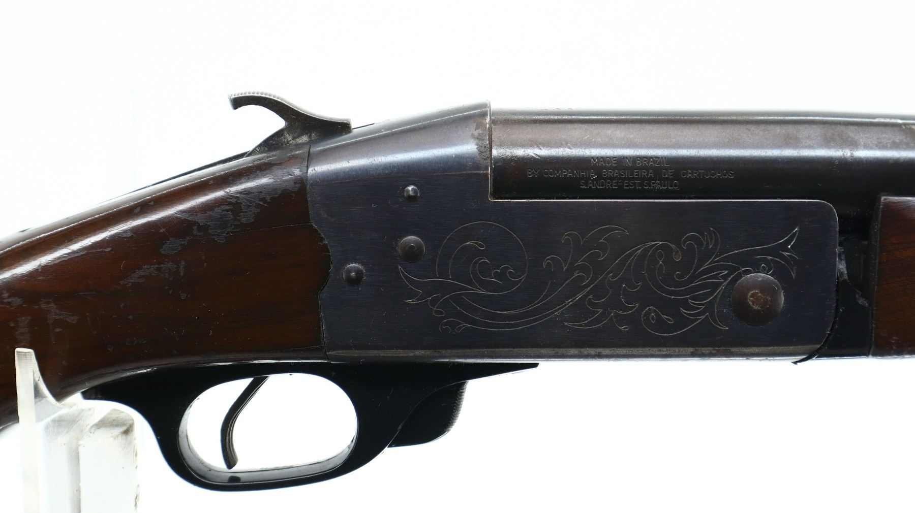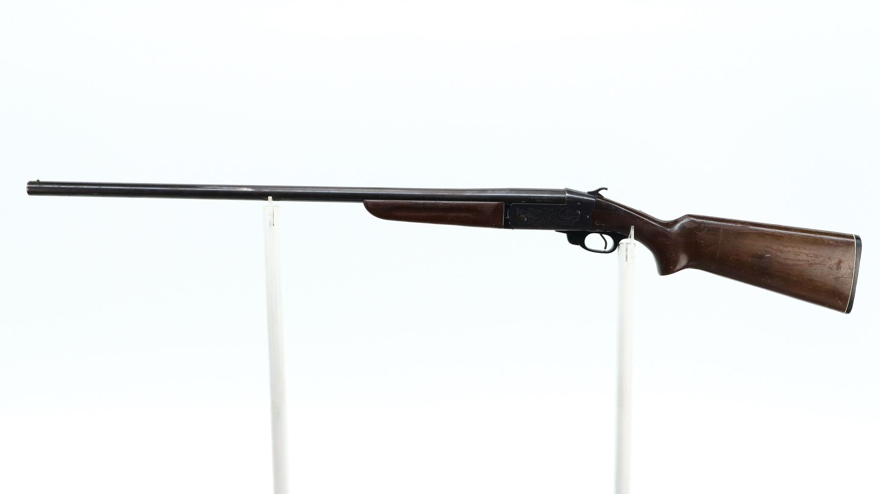 3+/10 , CIL , MODEL: 402 , CALIBER: 12 GA X 2 3/4" , BORE IS VERY GOOD. FIXED FULL CHOKE. BRASS BEAD, ROUND BARREL, ENGRAVED RECEIVER, EJECTOR. TWO PIECE WOOD STOCKS, PISTOL GRIP, FOREARM SPACER CRACKED IN FRONT OF RECEIVER, STOCK CRACKED BEHIND RECEIVER, GROOVED BLACK POLYMER BUTT PLATE. METAL FINISH SHOWS LIGHT RUST SPECKLES, HANDLING MARKS AND WEAR. STOCKS SHOW DINGS, SCRATCHES AND FINISH WEAR.. ACTION: HINGE SINGLE SHOT SHOTGUN. BARREL LENGTH: 29.75". CONDITION: 3+/10. SERIAL # 76853. CLASS: CANADIAN NON RESTRICTED CLASS