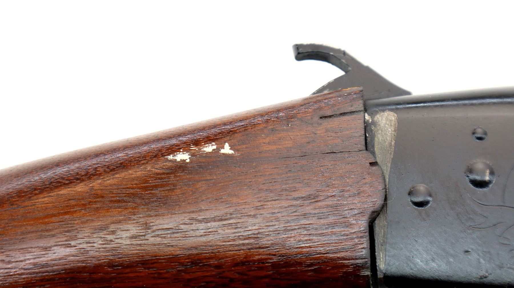 Main Description: Brass bead, round barrel, engraved receiver, grooved spur hammer, ejector, modified opening lever. Two piece wood stocks, forearm painted black, pistol grip, chipped cracked with a gap around the receiver, grooved black polymer butt plate, grip cap, sling swivels.