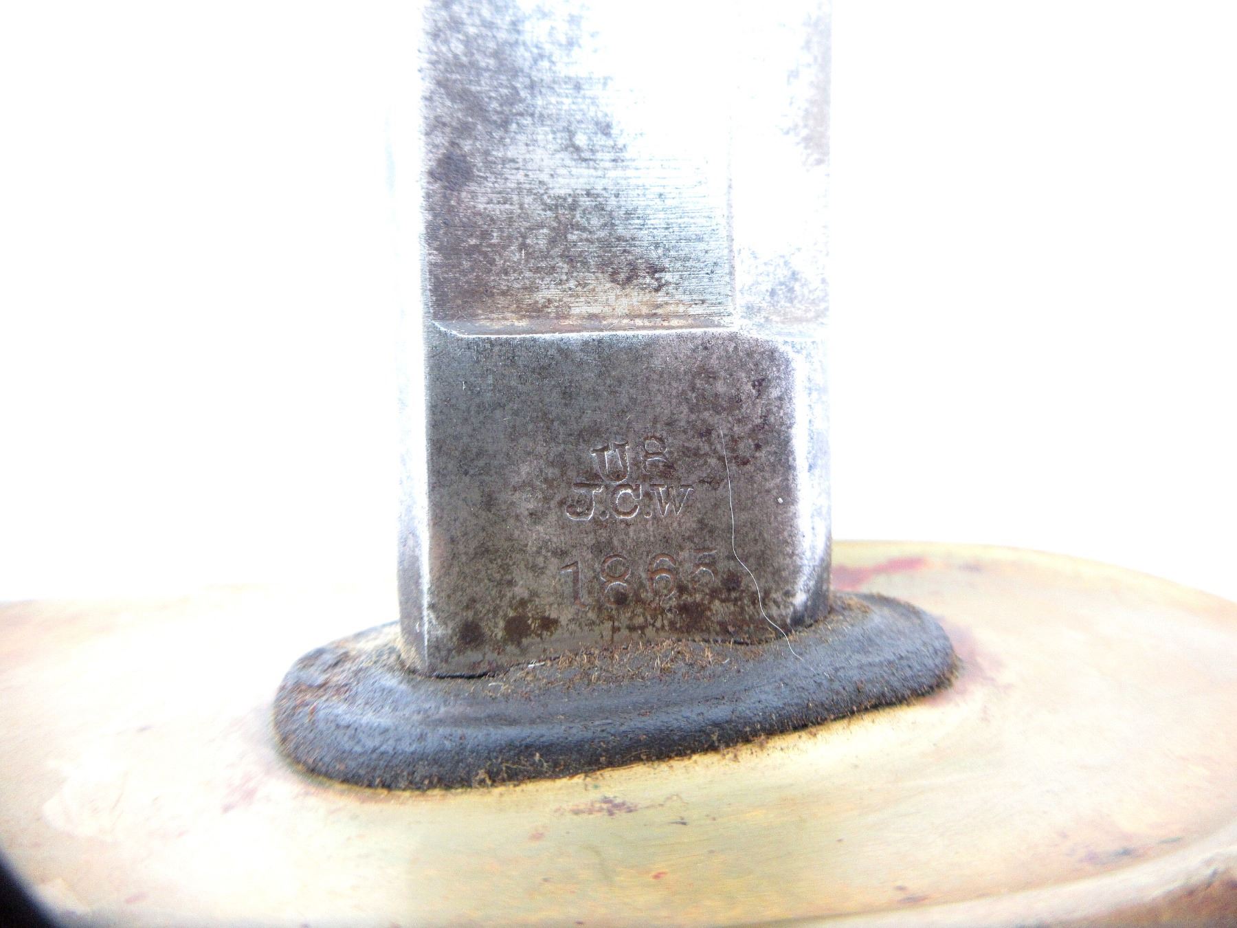 (1) CAVALRY SWORD, FULLERED CURVED BLADE, RICASSO MARKED: AMES SCROLL, "MADE BY, AMES MFG. CO., CHICOPEE", OTHER-SIDE MARKED: "U8, J.C.W., 1865", LEATHER WASHER, BRASS HAND-GUARD, LEATHER & BRASS WIRE WRAPPED GRIP, BRASS POMMEL, MARKED: "J?", METAL SCABBARD WITH TWO HANGERS, NO VISIBLE MARKINGS, BLADE APPROX. 35" & OAL APPROX. 40.75". SEE PHOTOS.