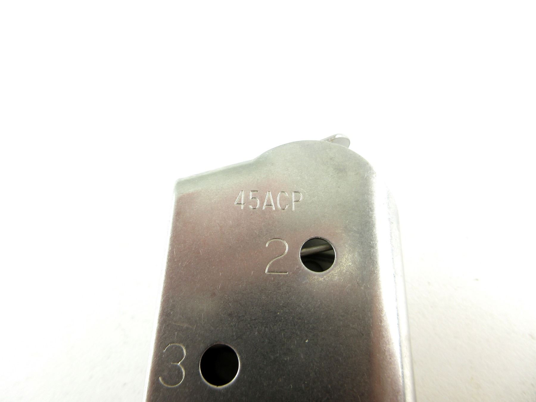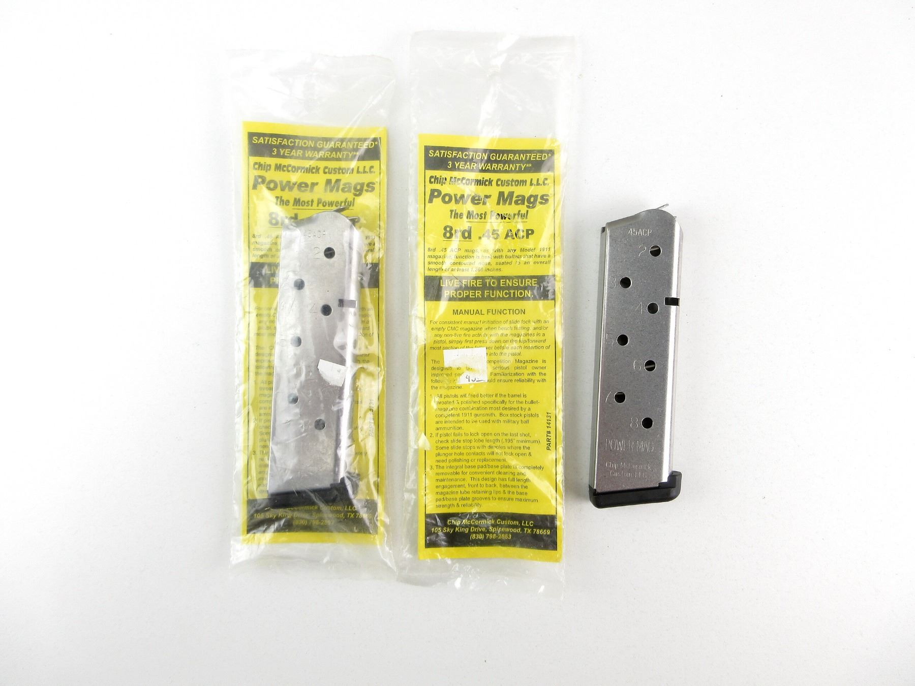 LOT INCLUDES; (2) .45 CAP, 8 ROUND MAGS, NICKEL FINISH, MAGS MARKED: "45 ACP" & "POWER MAG, CHIP MCCORMICK, CUSTOM LLC.", BLACK POLYMER BASE, NOS, ONE UNOPENED. SEE PHOTOS. PAL REQUIRED.