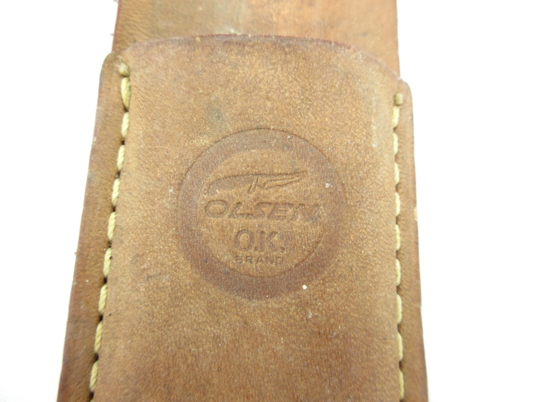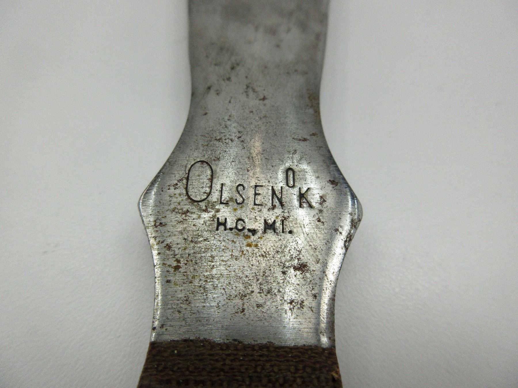 (1) RICASSO MARKED: "OLSEN OK, H.C., MI.", 2-PIECE GRIP, METAL POMMEL, NO VISIBLE MARKINGS, BROWN LEATHER SHEATH, MARKED: KNIFE SYMBOL OVER "OLSEN" OVER "O.K." OVER "BRAND" IN A CIRCLE, BLADE APPROX. 7 1/8" & OAL APPROX. 11 1/8". SEE PHOTOS.