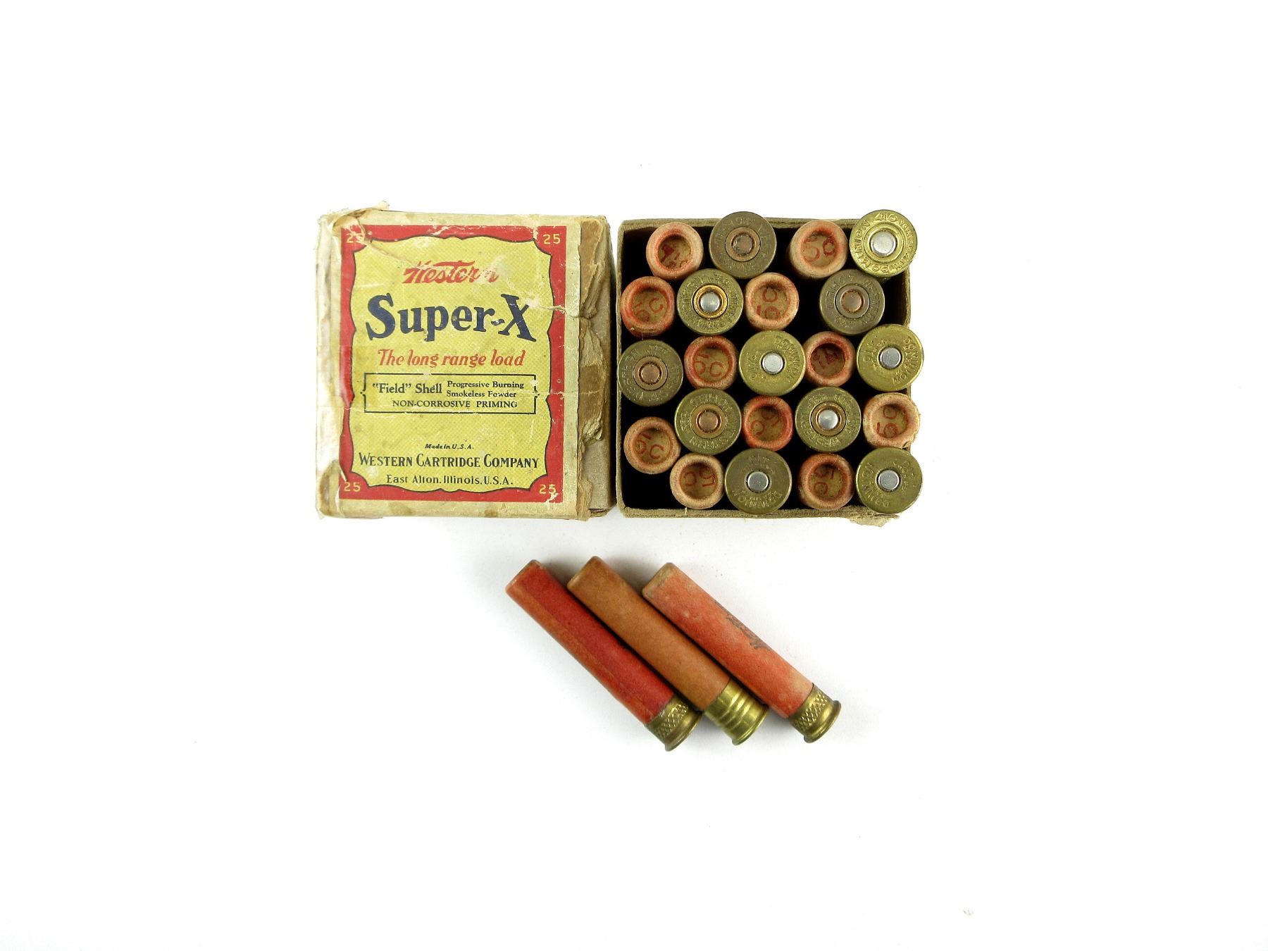 LOT INCLUDES; APPROX. (25) RNDS, VARIOUS MANUFACTURERS INCLUDING; WESTERN, DOMINION, ETC., ASSORTED SHOT SIZES; #5, #6, #7 1/2, ETC., IN ORIGINAL COLLECTIBLE BOX, SHOWS SOME WEAR, SEE PHOTOS.