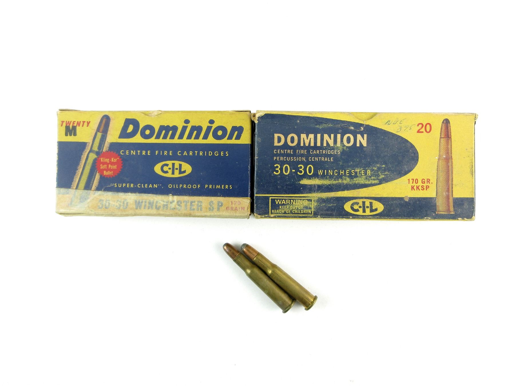 COLLECTIBLE ASSORTED DOMINION .30-30 WIN AMMO AND NON-PRIMED BRASS CASES LOT