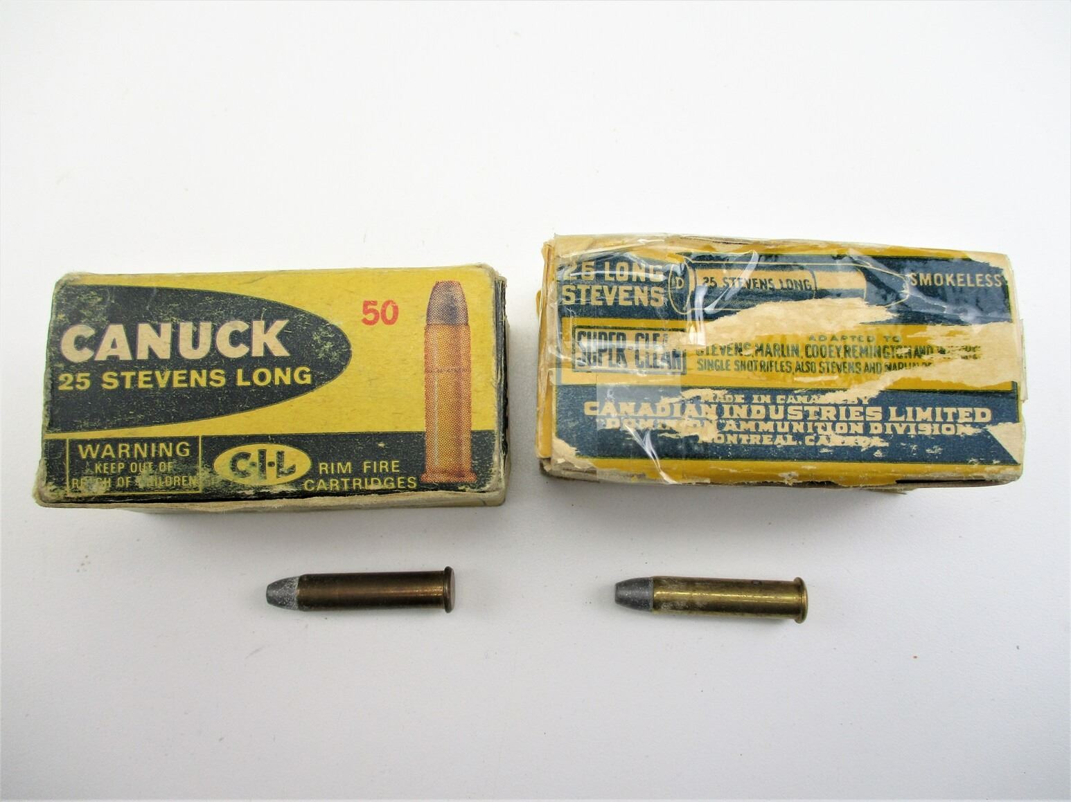 COLLECTIBLE CIL .25 STEVENS LONG , 56 RNDS, 65 GRNS (STATED ON BOX, NOT CONFIRMED), IN DAMAGED COLLECTIBLE AMMO BOX , THERE ARE NEW SHIPPING RESTRICTIONS, PLEASE MAKE SURE YOU HAVE READ AND CONFIRMED WE CAN SHIP TO YOU BEFORE BIDDING ON THIS LOT. PLEASE SEE LOT 0 IN THIS SESSION. NO REFUNDS WILL BE ISSUED, OR BIDS RETRACTED.