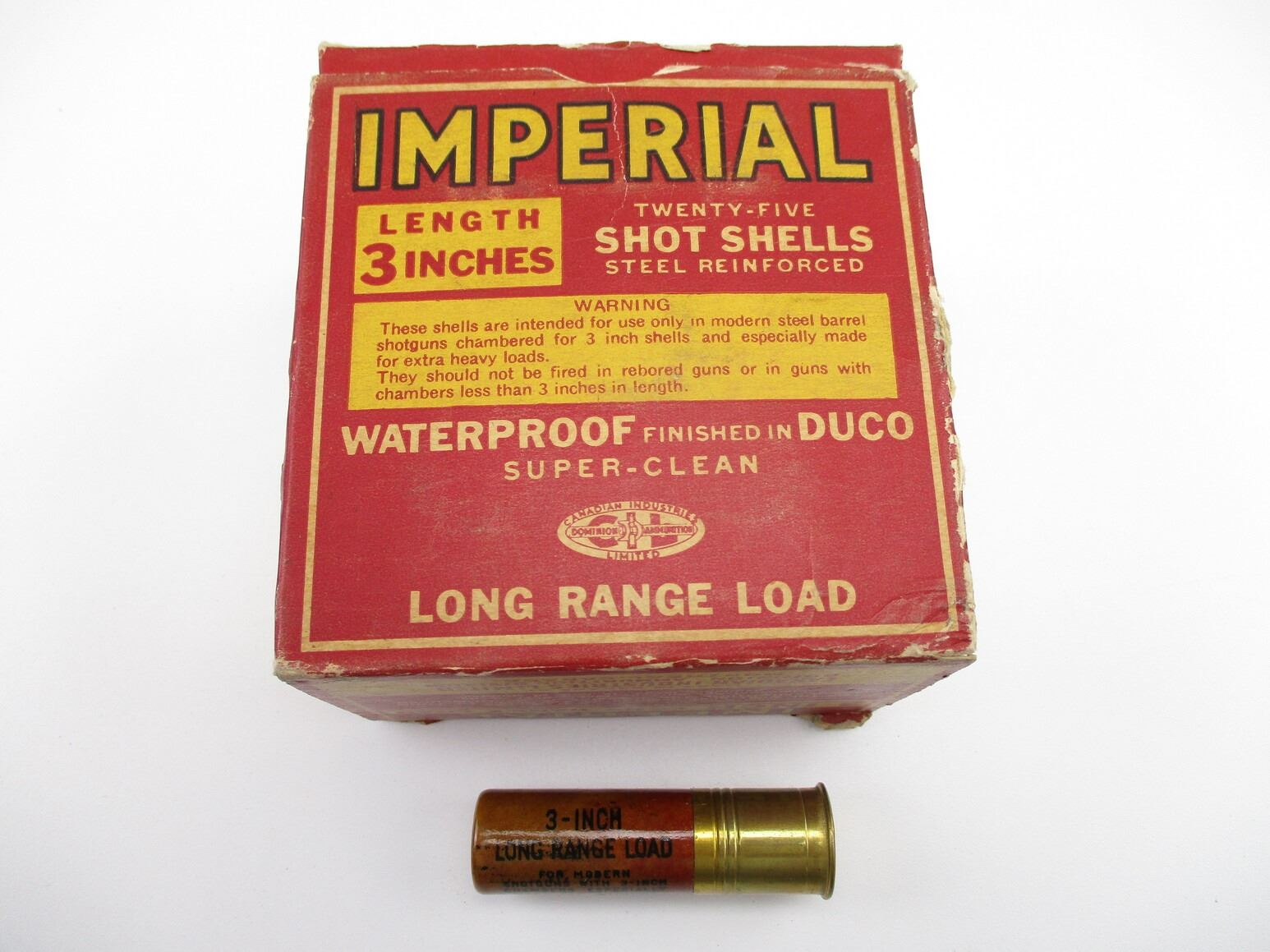 COLLECTIBLE CIL IMPERIAL 12 GAUGE SHOTSHELLS LOT, 25 RNDS, 3", #6 SHOT SIZE, IN COLLECTIBLE AMMO BOX, THERE ARE NEW SHIPPING RESTRICTIONS, PLEASE MAKE SURE YOU HAVE READ AND CONFIRMED WE CAN SHIP TO YOU BEFORE BIDDING ON THIS LOT. PLEASE SEE LOT 0 IN THIS SESSION. NO REFUNDS WILL BE ISSUED, OR BIDS RETRACTED