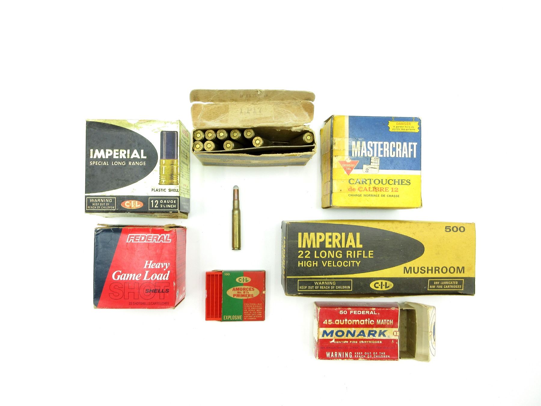 LOT INCLUDES; APPROX. (14) RNDS, 220 GRNS (STATED ON BOX NOT CONFIRMED), SP, (1) NON-PRIMED BRASS CASE, IN ORIGINAL COLLECTIBLE BOX, SHOWS SOME WEAR, SEE PHOTOS, (6) EMPTY BOXES, SEE PHOTOS.