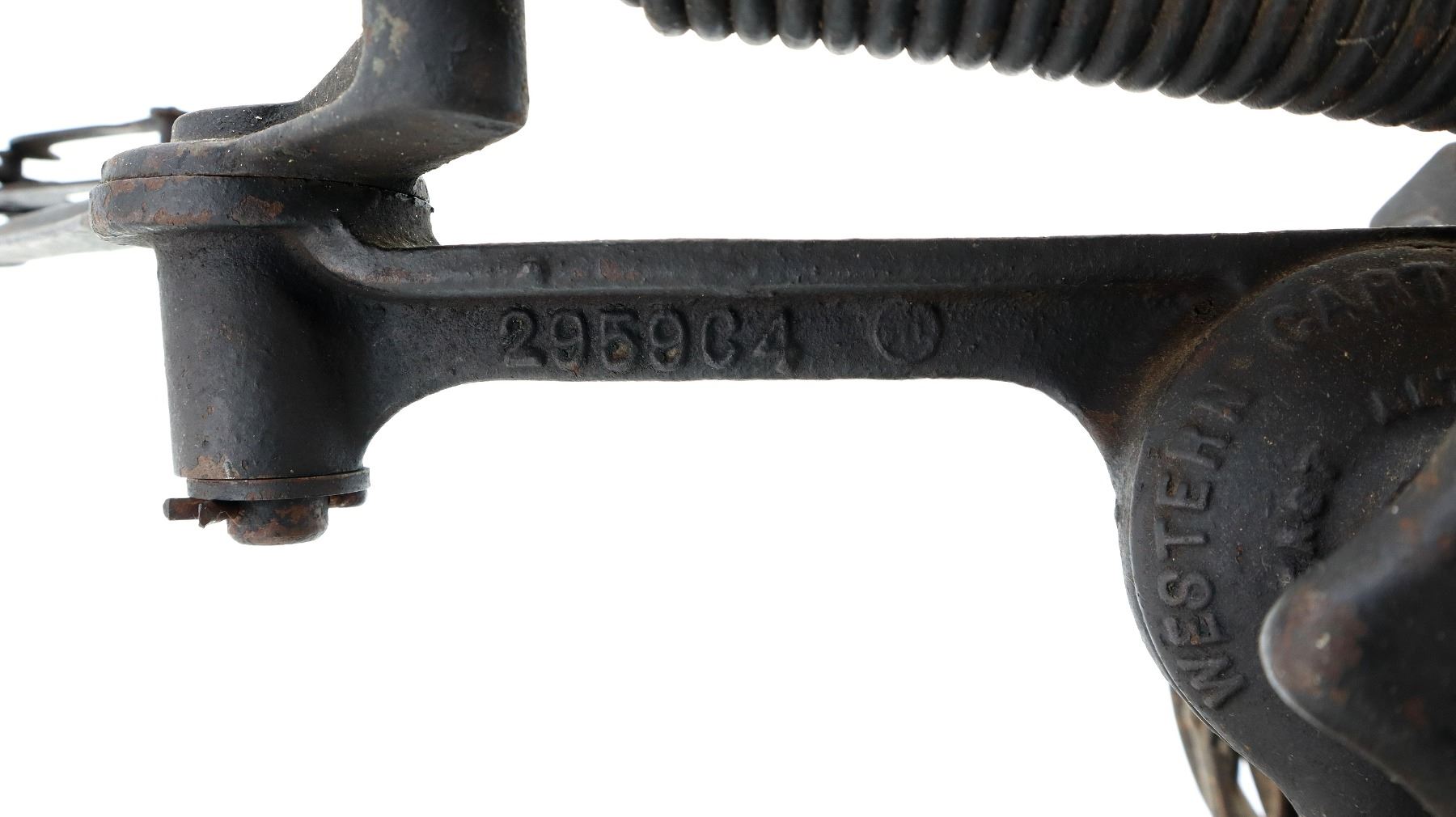 (1) CLAY TARGET / SKEET THROWER UNIT, BLACKENED STEEL, WITH PULLEY, MARKED: "WESTERN", "WESTERN CARTRIDGE CO.", "2959 D4", "2959 C4", ETC., MISSING CRANK BAND PIECE, CONSIGNOR STATES: "WORKS", ATTACHED TO WOODEN BASE, BASE APPROX. 13.25" X 9 5/8" X 2 3/8", THROWER APPROX. 7.5" X 6 7/8" X 15 5/8". SEE PHOTOS.