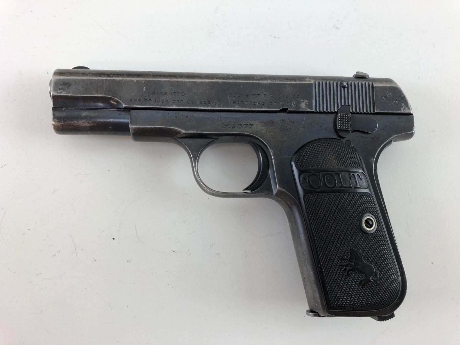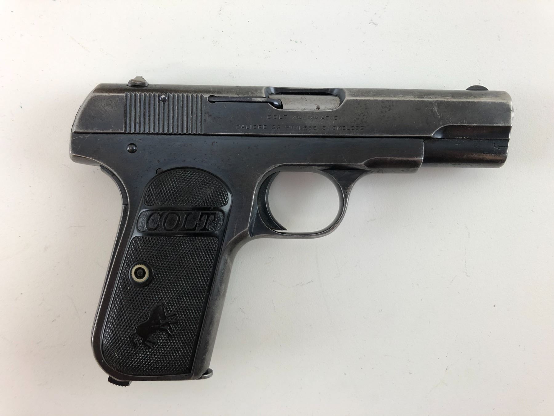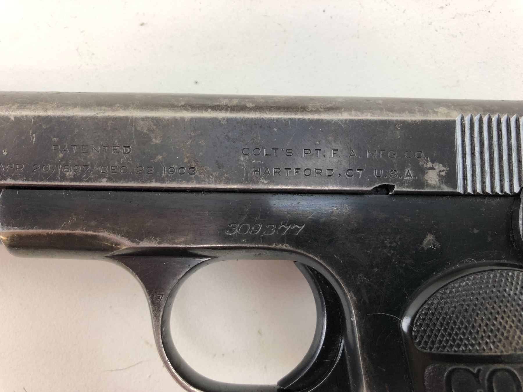 CONDITION: 6/10 , COLT , MODEL: 1903 VEST POCKET HAMMERLESS , CALIBER: 32 AUTO , COMES WITH MAGAZINE , BORE IS GOOD. BLADE FRONT SIGHT, RAISED NOTCH REAR SIGHT. CHECKERED BLACK PLASTIC GRIPS, WITH COLT LOGO. MODELED FINISH. SHOW SOME HANDLING MARKS. , ACTION: SEMI AUTOMATIC , BARREL LENGTH: 95MM , SERIAL # 309377 , CLASS: CANADIAN CLASS PROHIBITED 12-6