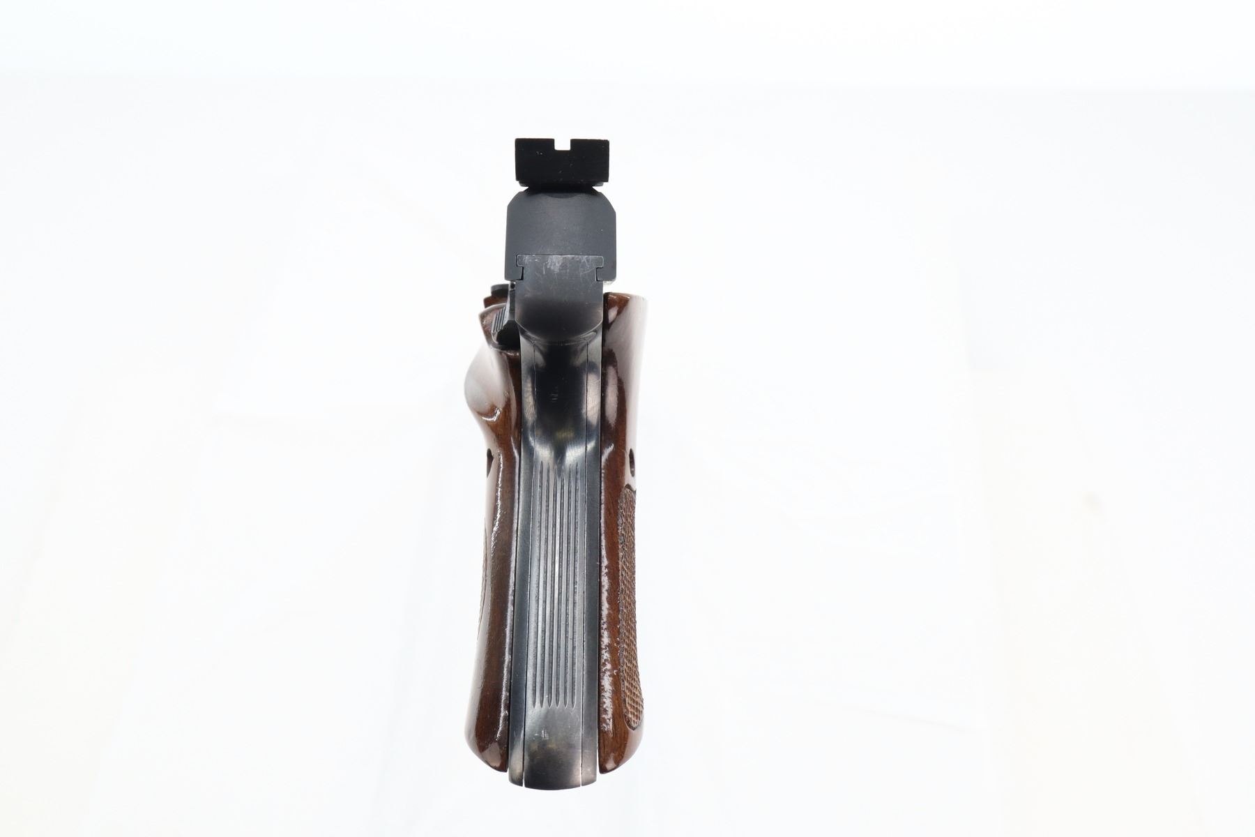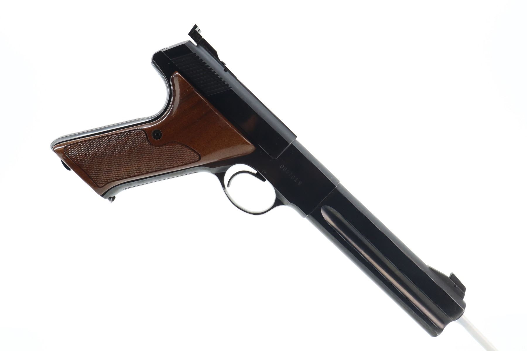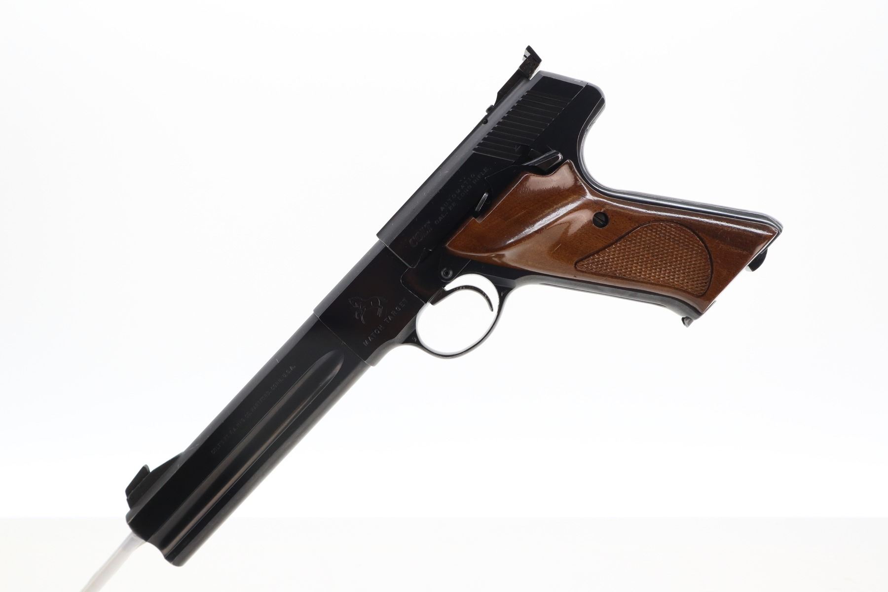 7+/10 , COLT , MODEL: WOODSMAN MATCH TARGET , CALIBER: 22 LR , COMES WITH MAGAZINE , BORE IS VERY GOOD. BLADE FRONT SIGHT, ADJUSTABLE REAR SIGHT, CHECKERED TWO PIECE WOOD GRIPS WITH THUMB REST, SHOWS SOME HANDLING MARKS , ACTION: SEMI AUTOMATIC , BARREL LENGTH: 152MM , CONDITION: 7+/10 , SERIAL # 065701S , CLASS: CANADIAN RESTRICTED CLASS