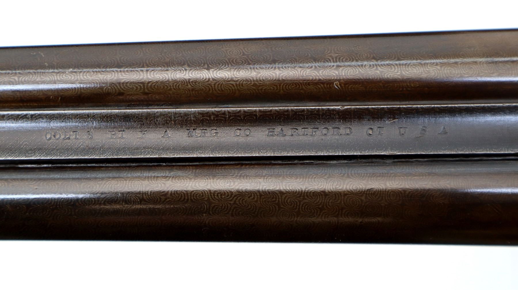 Main Description: Brass bead, Damascus barrels with raised rib marked Colts PT FA MFG Co Hartford CT USA that are slightly loose on face, engraved receiver, automatic safety, extractor, double triggers, Missing barrel tenon that retains forearm. Two piece wood stocks, black forend tip, checkered forearm and pistol grip, checkered Colt logo black polymer butt plate, vanity plate.
