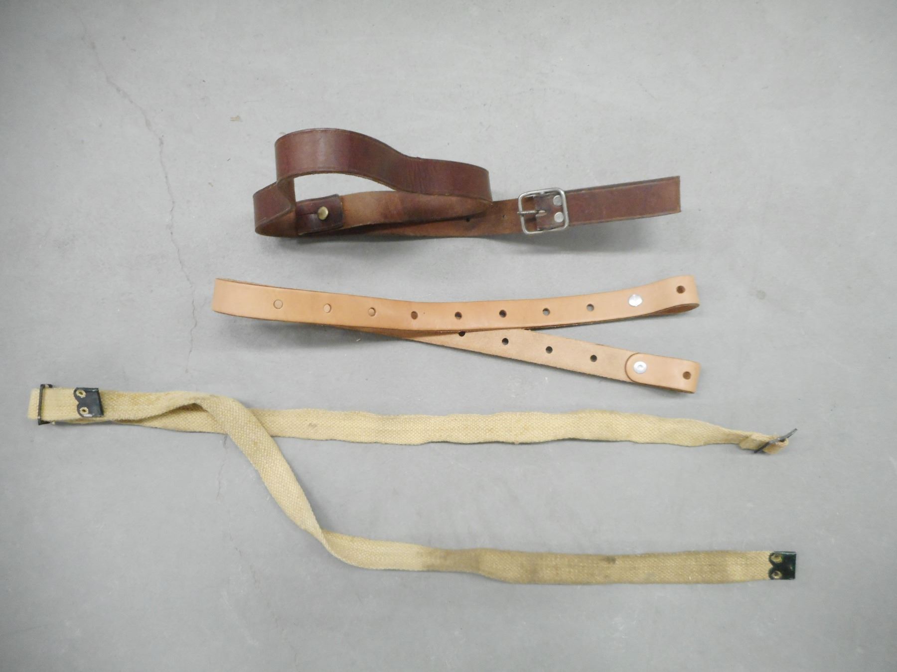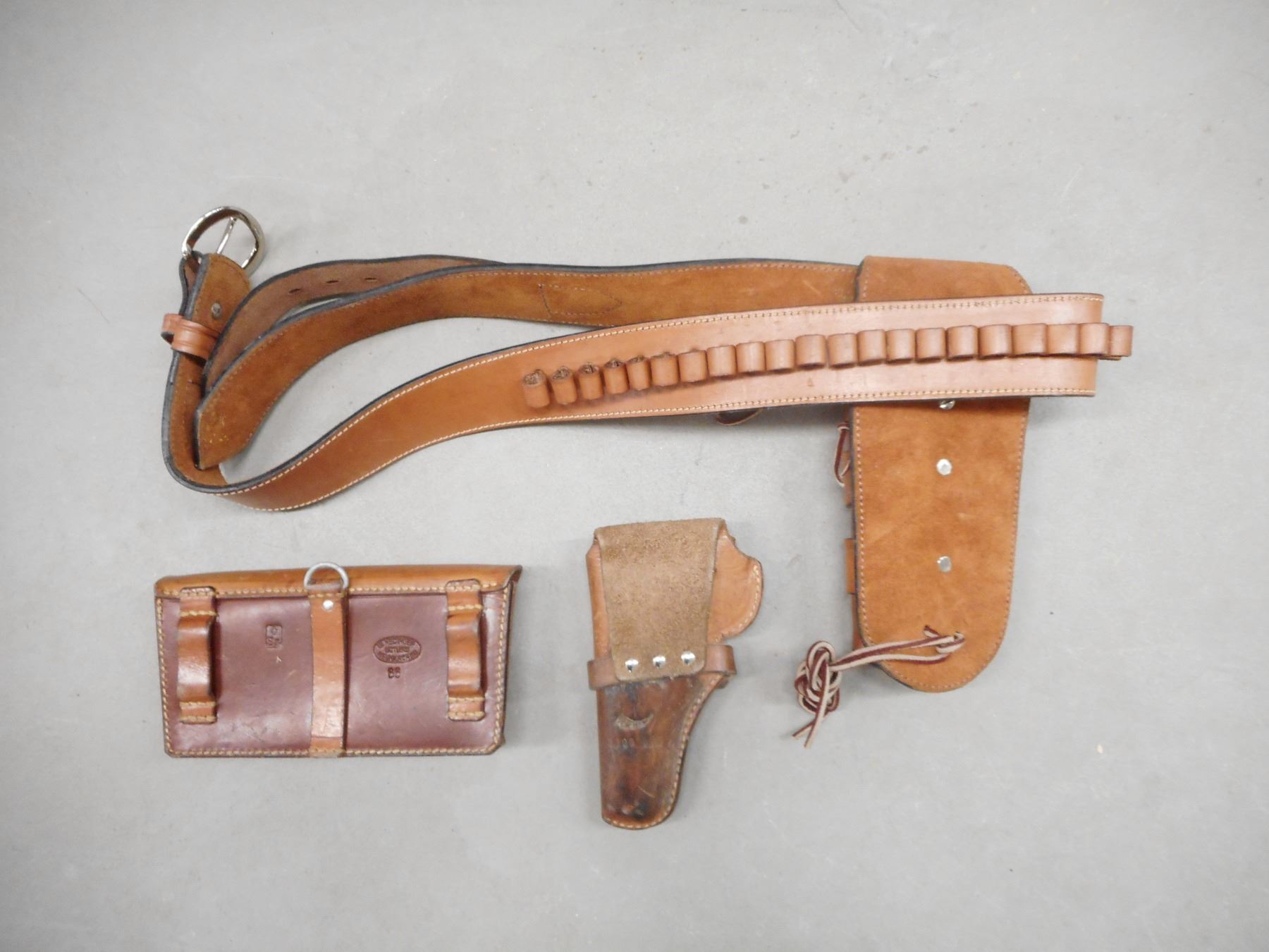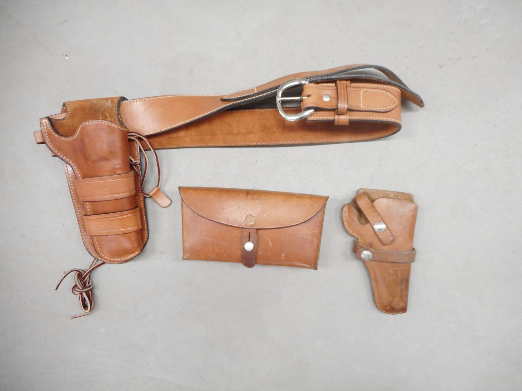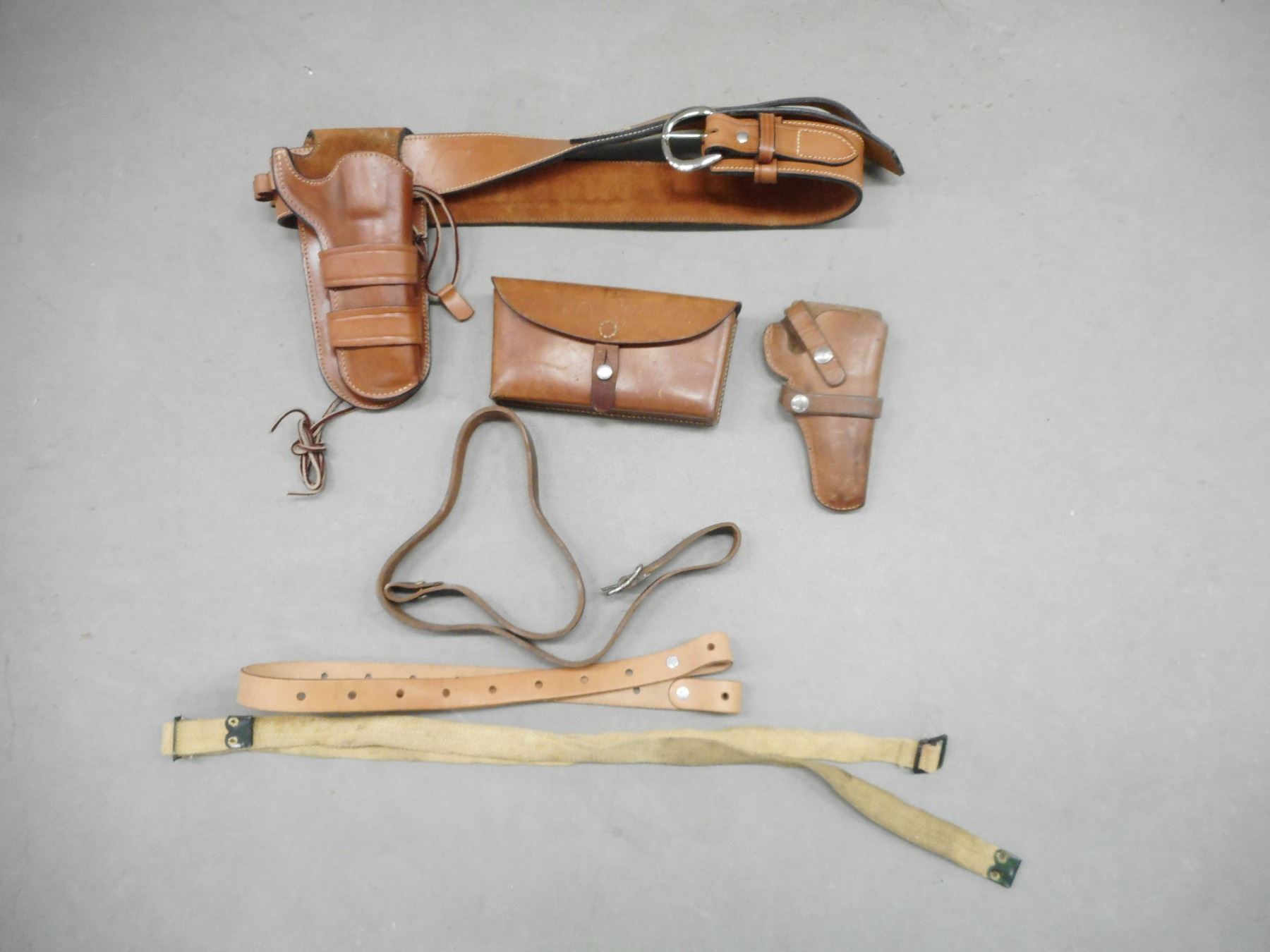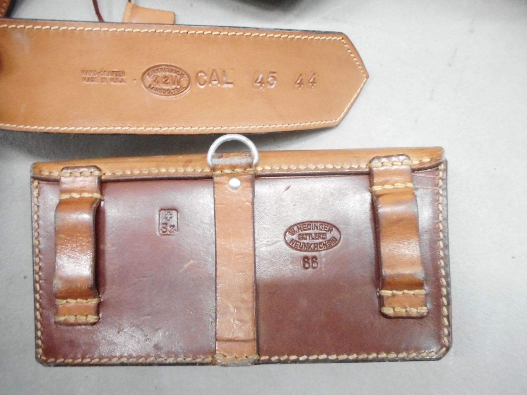 COLT TYPE SMALL FRAME HOLSTERS AND BELTS , (1) HOLSTER WITH BELT MARKED 42W CAL 45 44, BELT LENGTH APPROX. 45" (1) HUNTERS HOLSTER, APPROX. LENGTH 7.25" (1) SWISS AMMO POUCH, MARKED W.HEDINGER 66. (3) UNKNOWN SLINGS. LOT OF 6