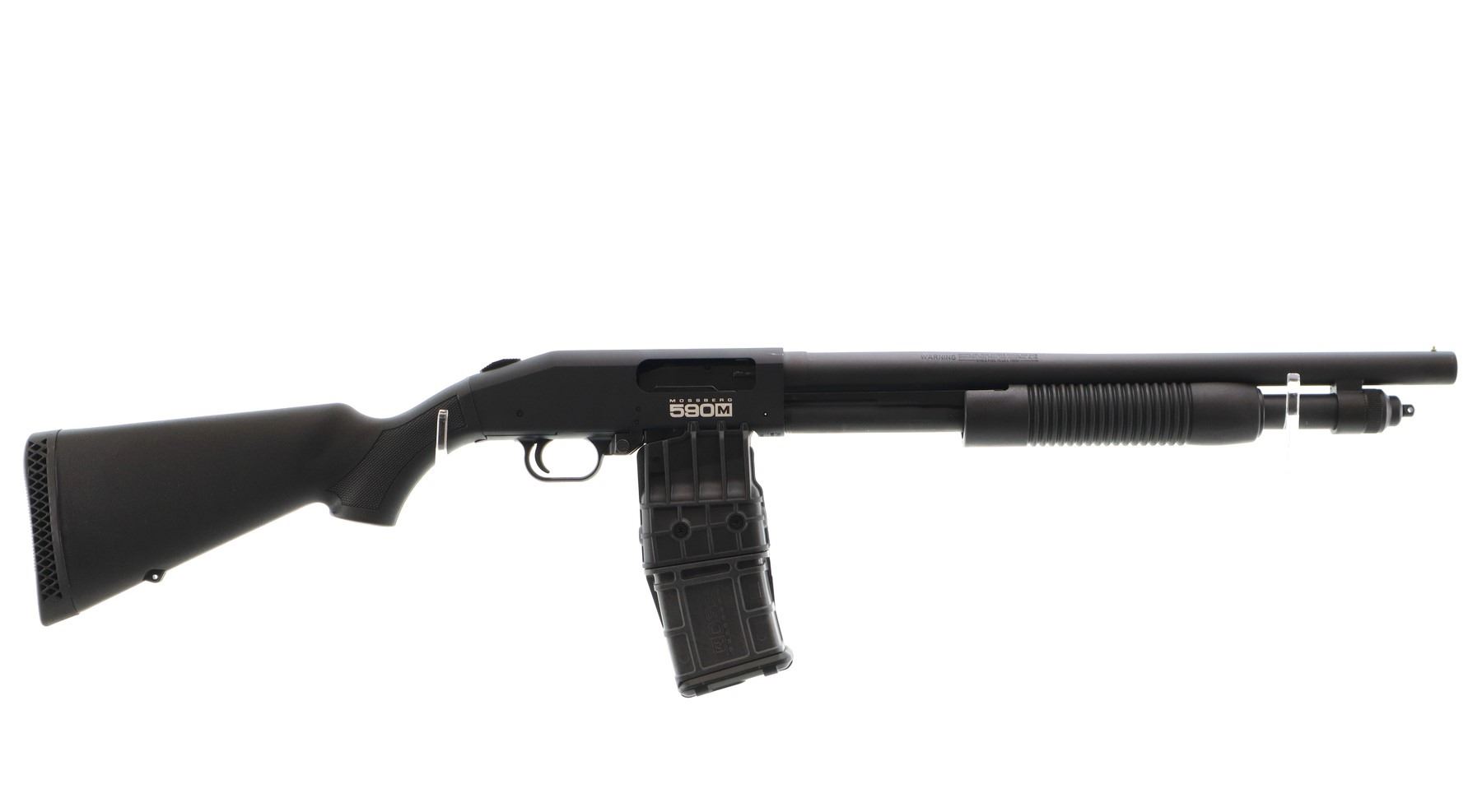 Raffle prize is an New in box, Mossberg, Model: 590 M Mag Fed, Caliber: 12 G x 2 3/4". Comes with Box, Manual, Magazine and Lock. Bore is excellent. Appears as new, may have been test fired in factory. This pump action shotgun has a fixed cylinder choke, brass bead, Parkerized round barrel and full length mag tube, black alloy receiver that is drilled and tapped with plug screws installed and tang safety. Two piece black synthetic stocks, grooved forearm, checkered pistol grip, black vented rubber recoil pad, grip cap and swivel studs. Action: Pump action shotgun, Barrel length: 18.5". Condition: New in Box, Class: Canadian Non Restricted.