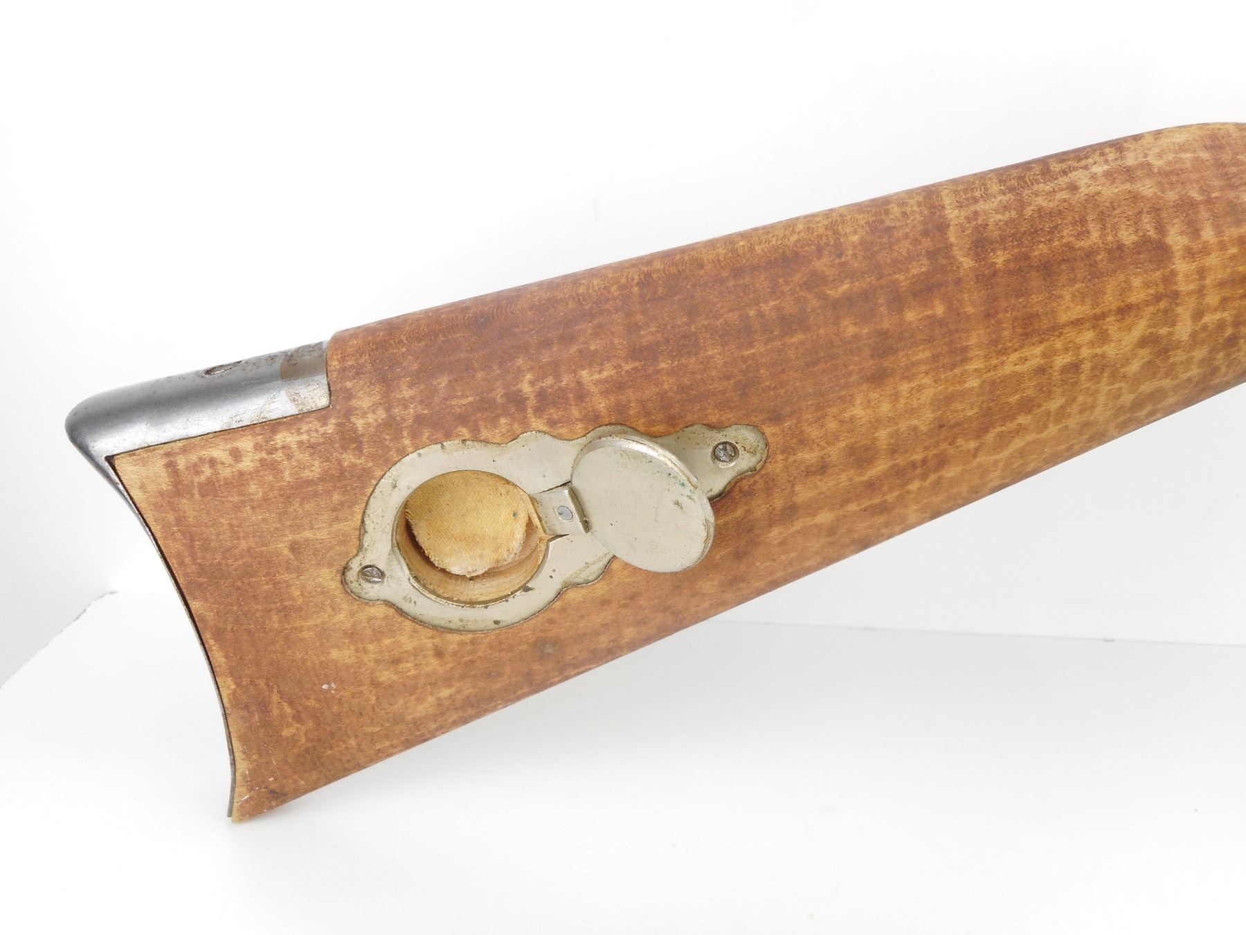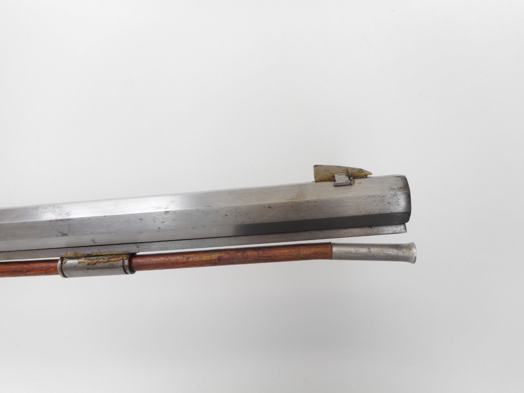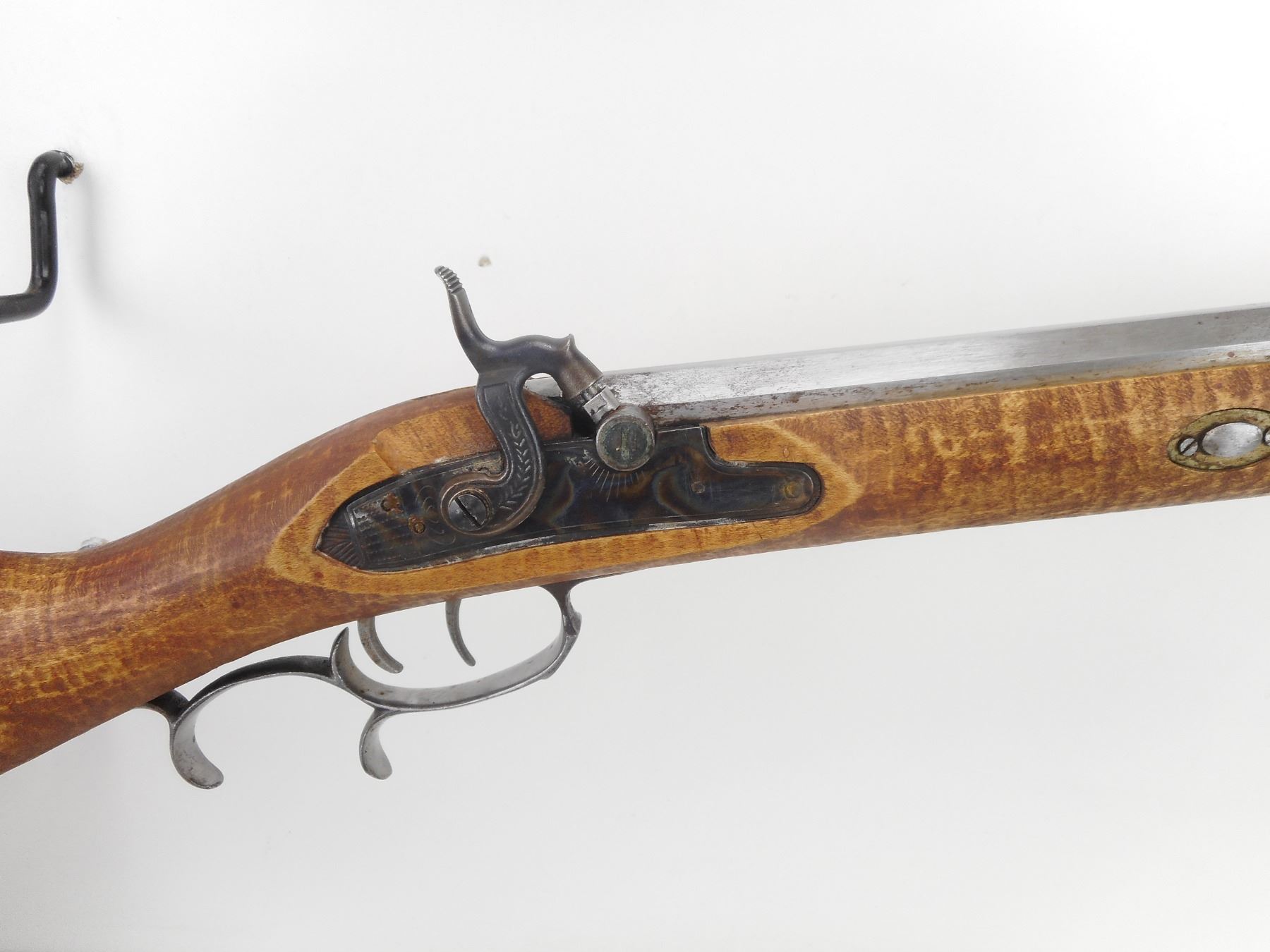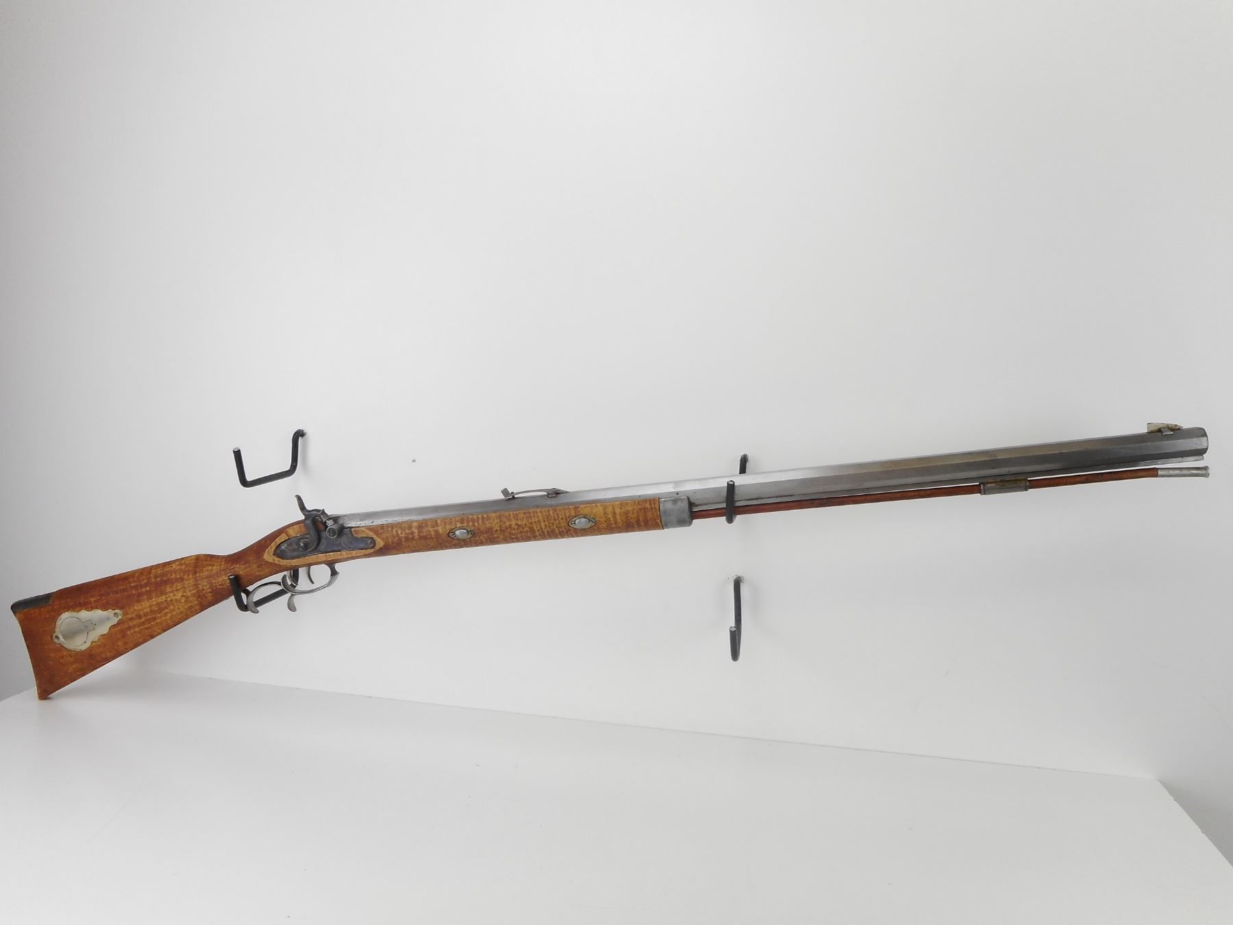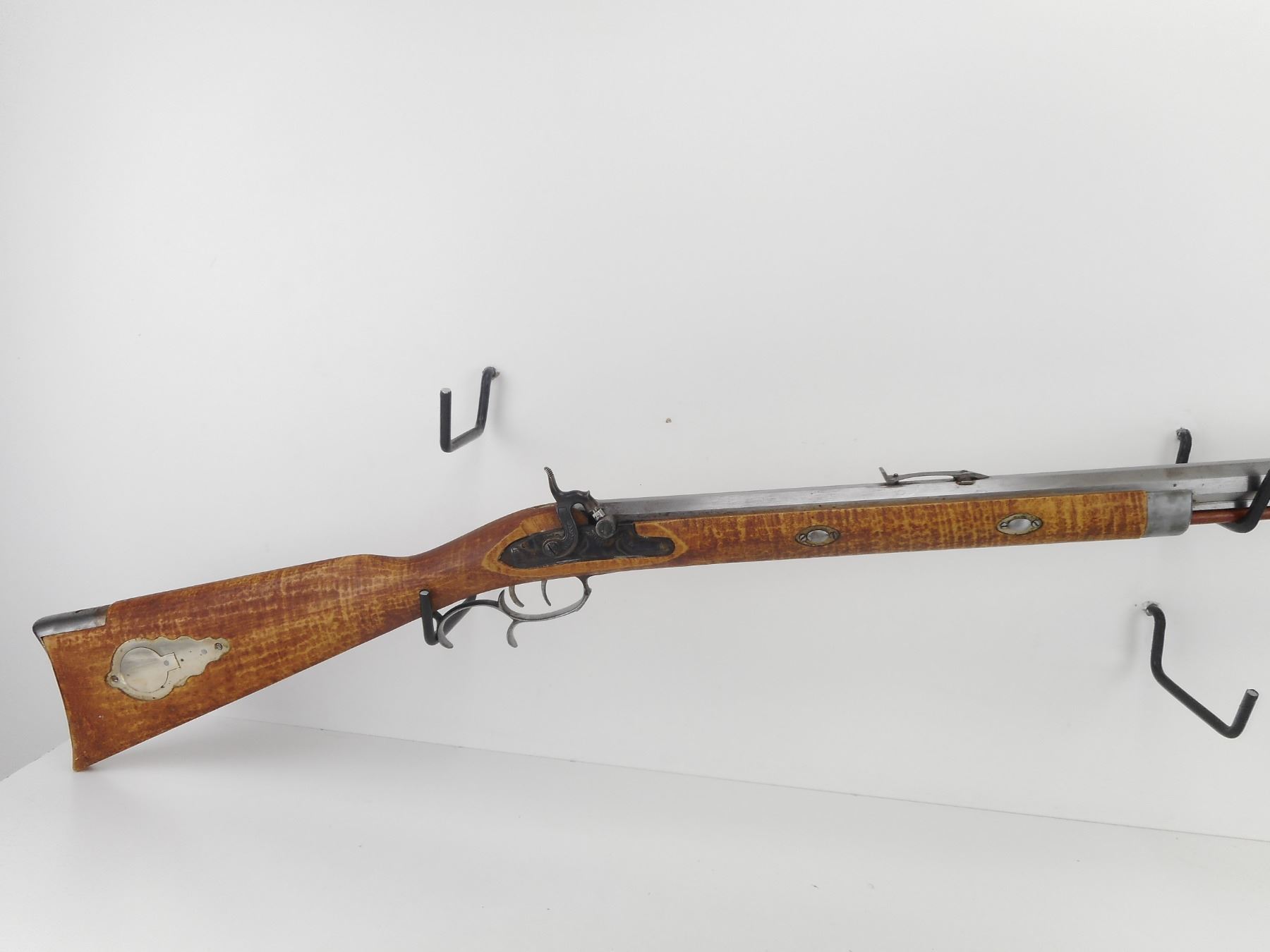 CONNETICUT VALLEY ARMS , MODEL: HAWKEN RIFLE REPRODUCTION. , CALIBER: 45 PERCUSSION , DARK BORE. BLADE FRONT AND ADJUSTABLE REAR SIGHTS. OCTAGONAL BARREL. ONE PIECE HARDWOOD STOCK WITH RAISED CHEEKPIECE. CRESCENT STEEL BUTTPLATE. FANCY TRIGGER GUARD WITH SET TRIGGERS. BRASS PATCHBOX. RIGHLY CASE HARDENED LOCK PLATE. SHOWS SOME HANDLING MARKS. COMES WITH RAM ROD WITH BROKEN TIP. BARREL LENGTH: 31" , CONDITION: 6/10 , STOCK # NR10647, SERIAL # 009230, CLASS: CANADIAN NON RESTRICTED CLASS