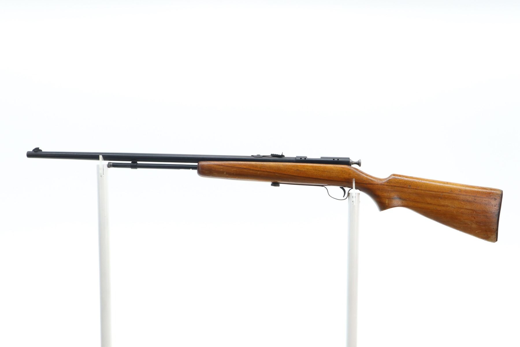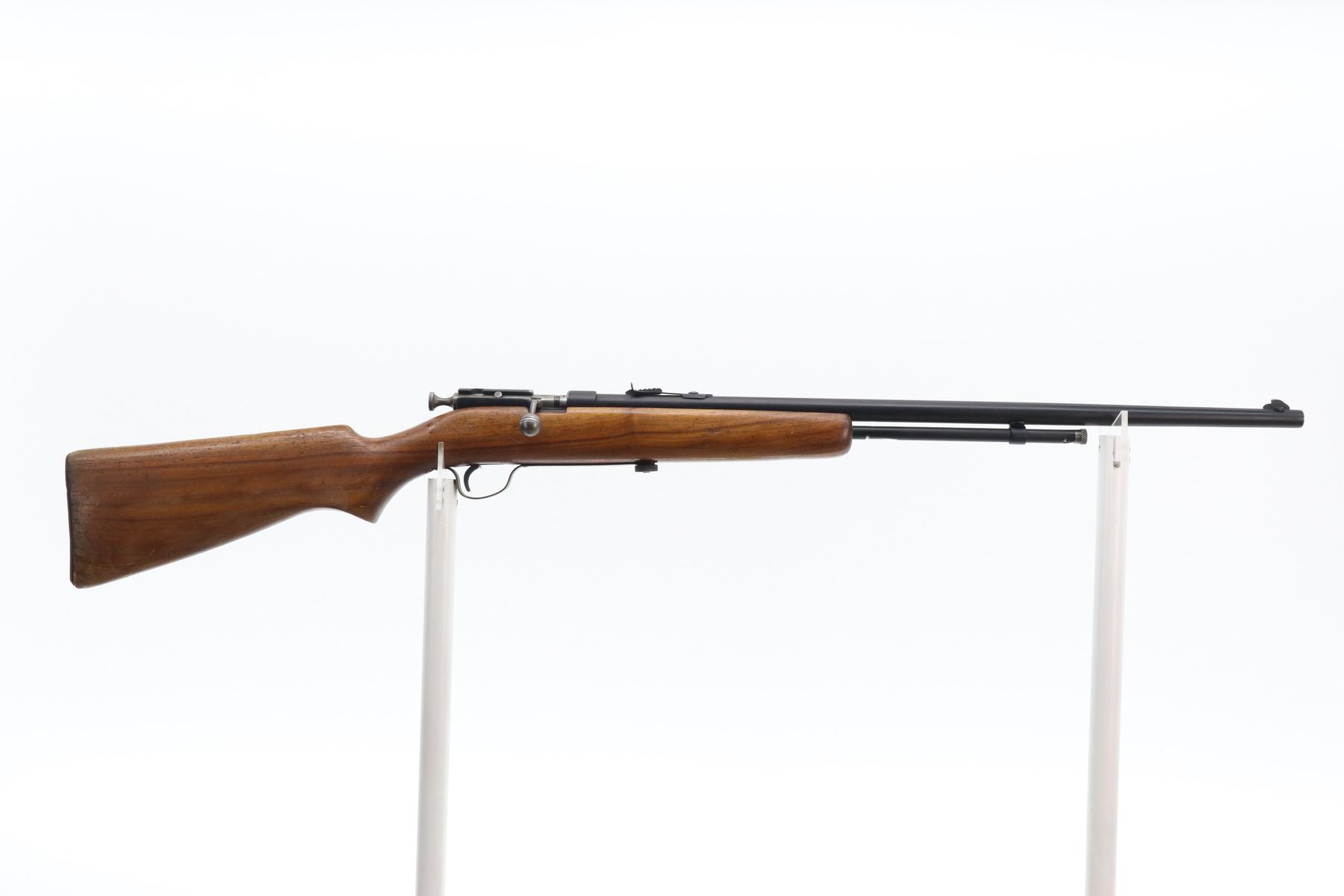 4/10 , COOEY , MODEL: 60 , CALIBER: 22 LR , BORE IS GOOD. BLADE FRONT SIGHT, ADJUSTABLE U NOTCH REAR SIGHT. ONE PIECE SMOOTH WOOD STOCK, PISTOL GRIP, SMOOTH COPPER BUTT PLATE. METAL FINISH PITTED PAINTED BLACK WITH HANDLING MARKS. STOCK SHOWS DINGS, SCRATCHES AND WEAR. , ACTION: BOLT ACTION RIFLE , BARREL LENGTH: 24" , SERIAL: N/A , CONDITION: 4/10 , CLASS: CANADIAN NON RESTRICTED