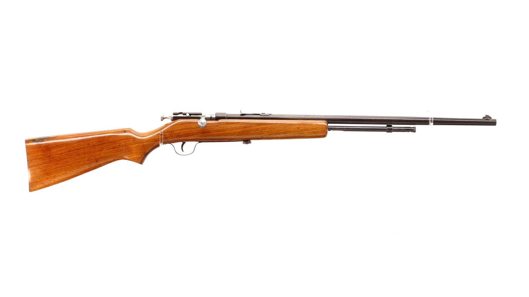 Main Description: Blade front sight, u notched rear sight missing elevator, grooved bolt knob. One piece wood stock, pistol grip cracked and repaired behind receiver, smooth steel butt plate