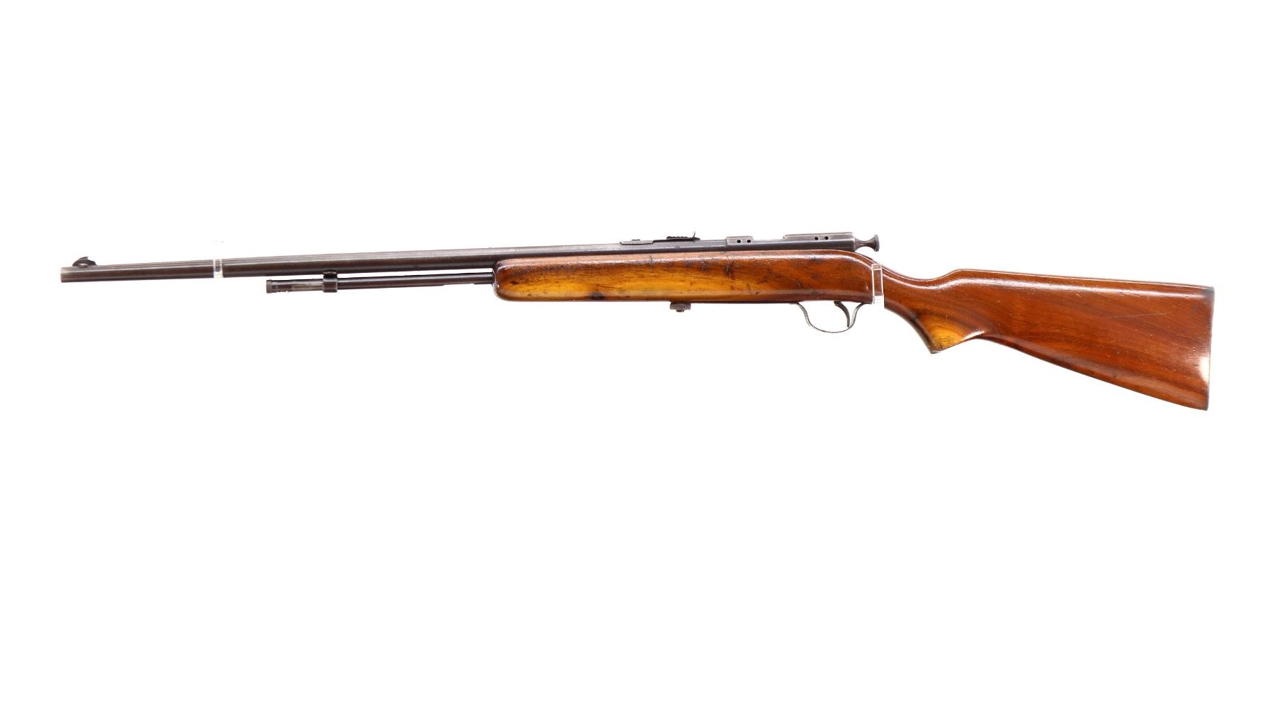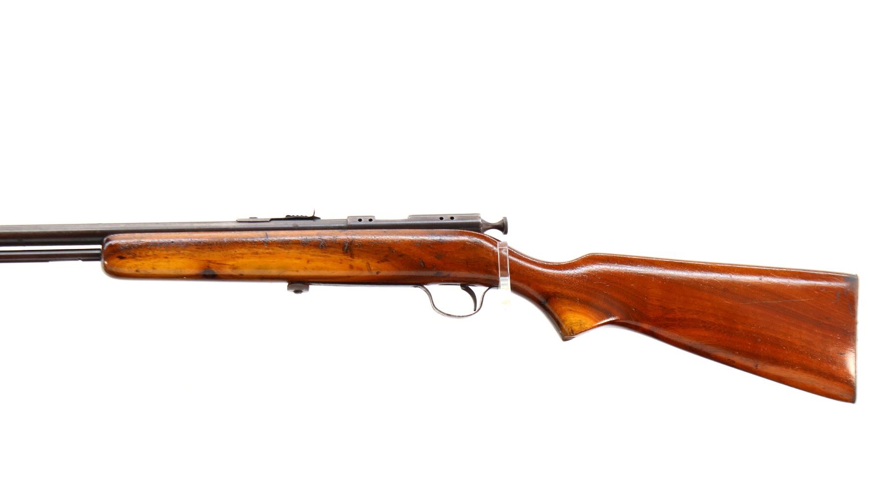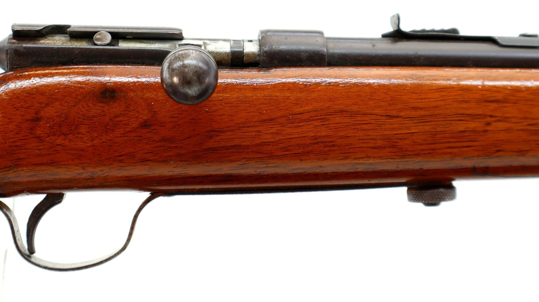 Main Description: Blade front sight, adjustable u notched rear sight, receiver drilled and tapped with no plug screws installed, and grooved bolt knob. One piece wood stock, pistol grip, smooth steel butt plate, pistol grip is chipped.