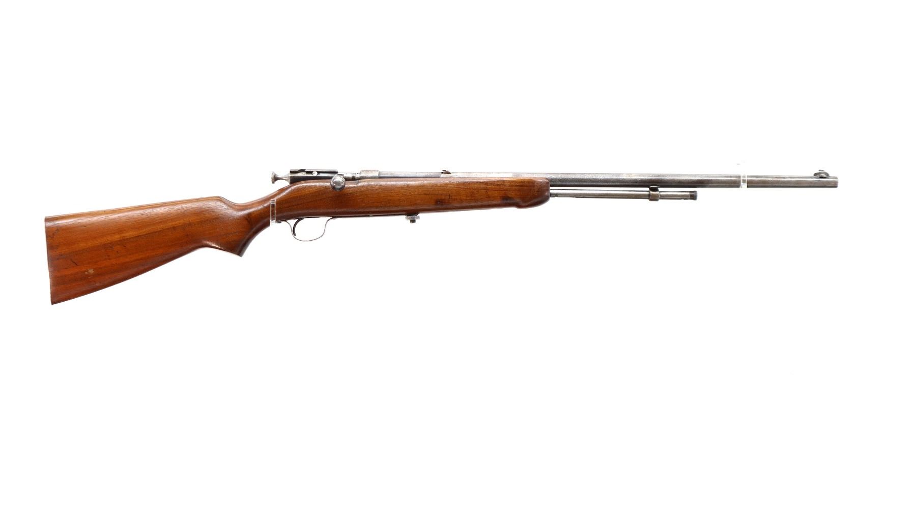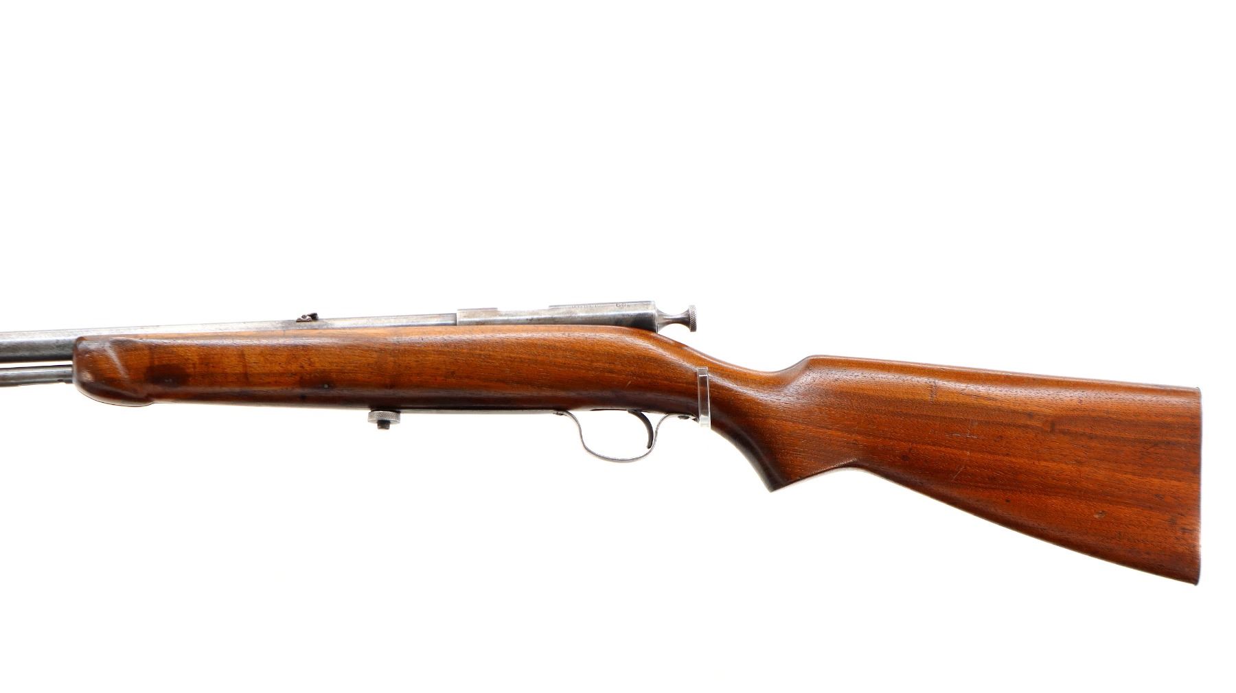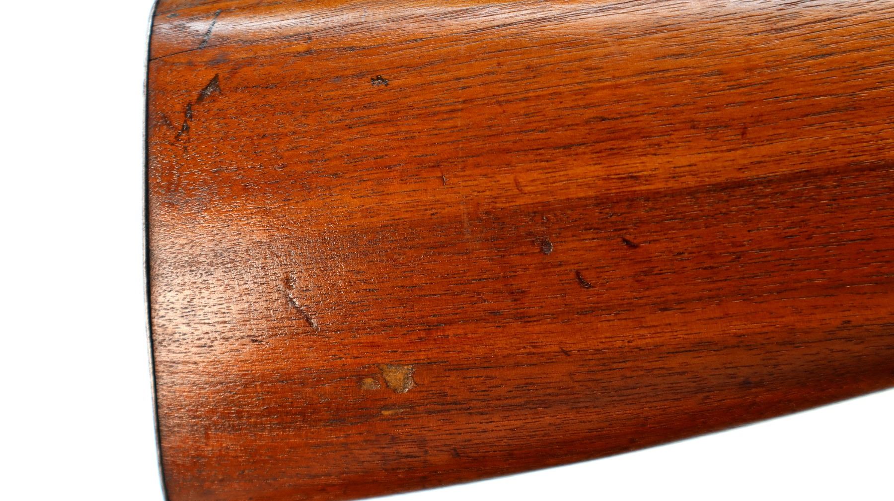 Main Description: Blade front sight, folding u notched rear sight, grooved bolt handle. One piece wood stock, forend is cracked, pistol grip cracked behind receiver, smooth steel butt plate, stock cracked at heel