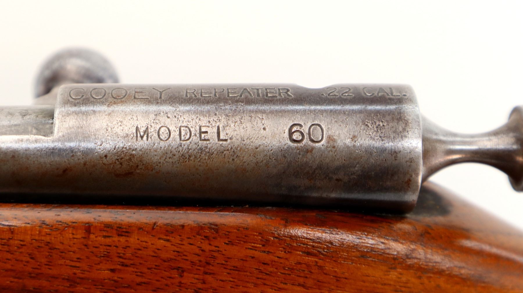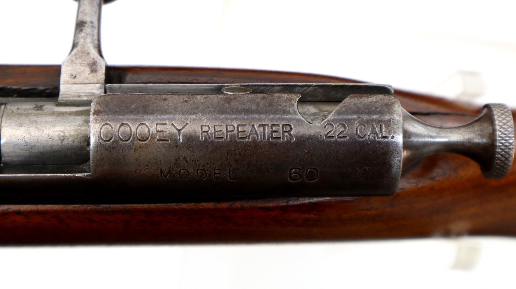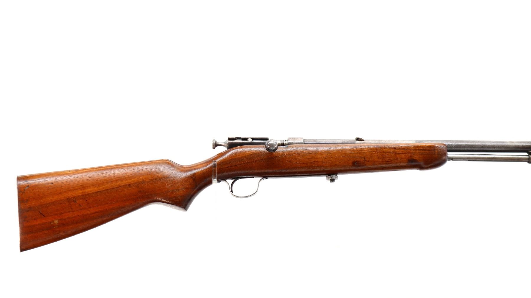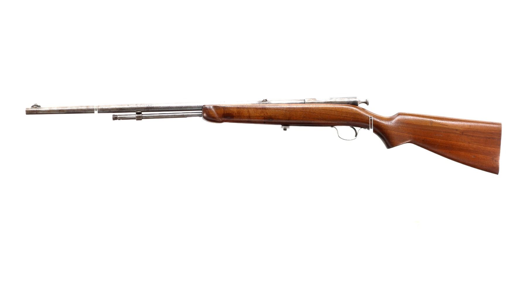 Main Description: Blade front sight, folding u notched rear sight, grooved bolt handle. One piece wood stock, forend is cracked, pistol grip cracked behind receiver, smooth steel butt plate, stock cracked at heel