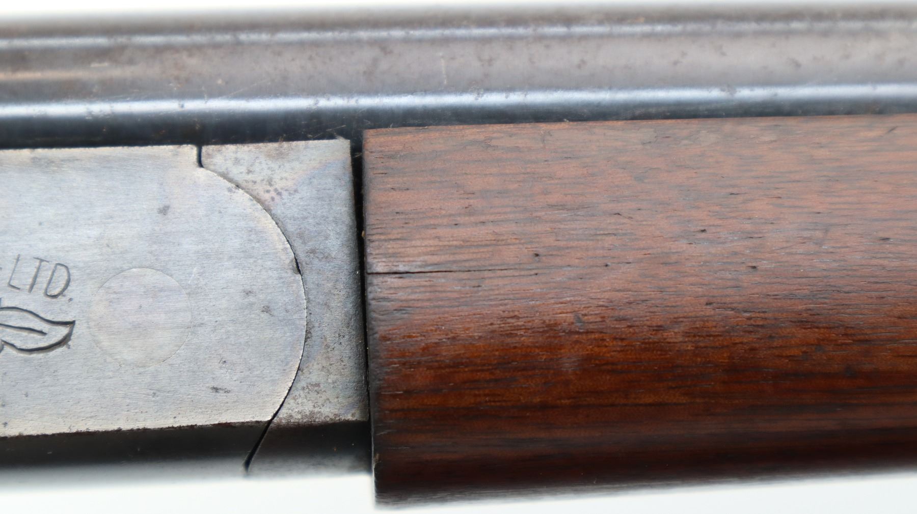 Main Description: Broken brass bead, round barrel, grooved spur hammer, ejector. Two piece wood stocks, forearm is cracked, pistol grip cracked behind upper and lower tangs, grooved black polymer butt plate, stock chipped at toe and cracked on both sides in front of butt plate