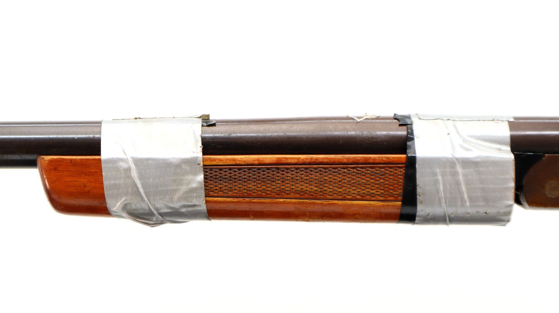 Main Description: Brass bead, round barrel, grooved spur hammer, ejector. Two piece wood stocks, forearm spacer is broken, checkered forearm retained with silver duct tape requires repair. Checkered pistol grip cracked behind upper and lower tangs, grooved black polymer butt plate, stock cracked at heel damaged spot at toe.