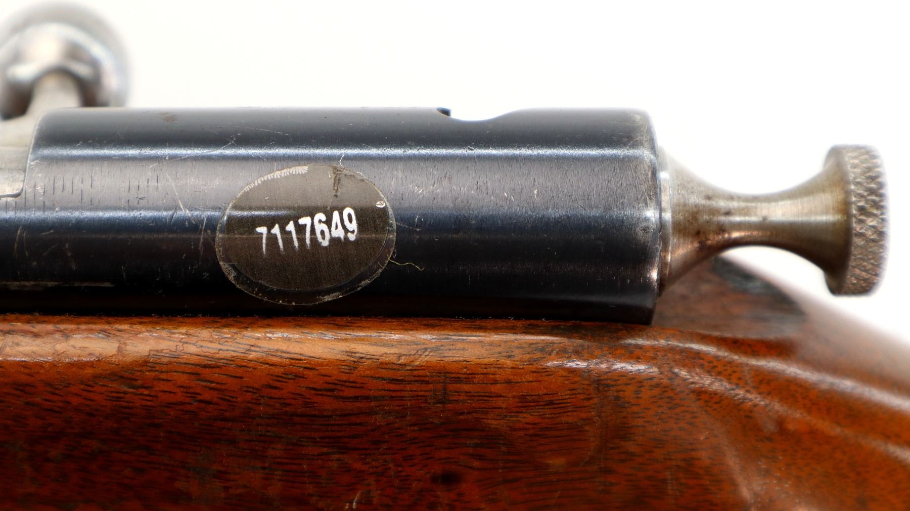 Main Description: Blade front sight, adjustable u notched rear sight, blued finish, grooved bolt knob. One piece wood stock, pistol grip, smooth steel butt plate.