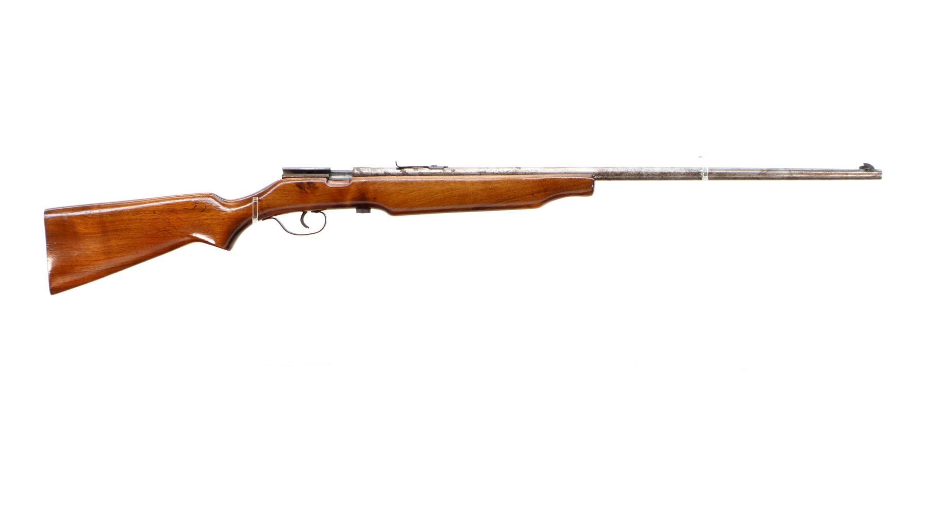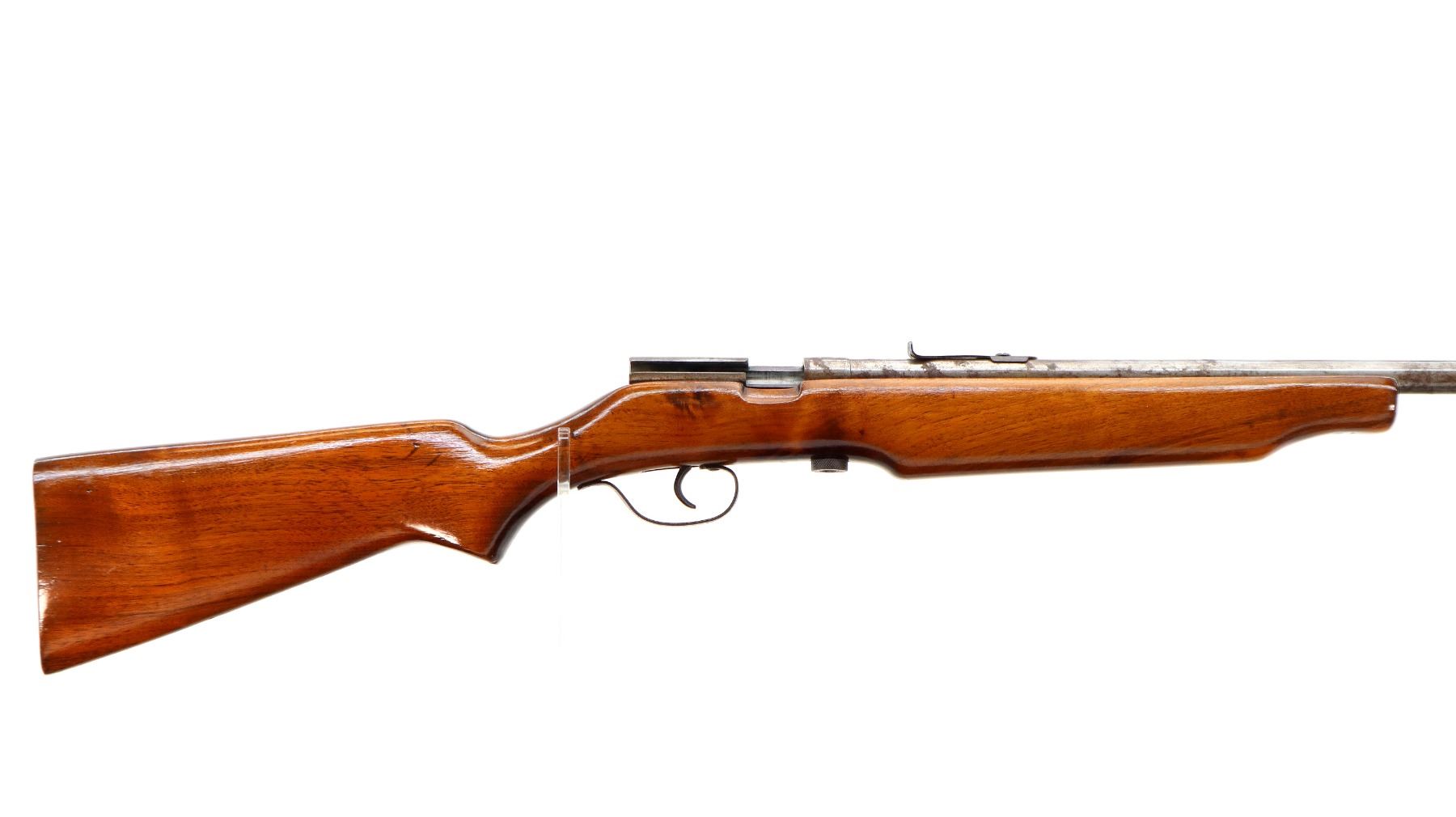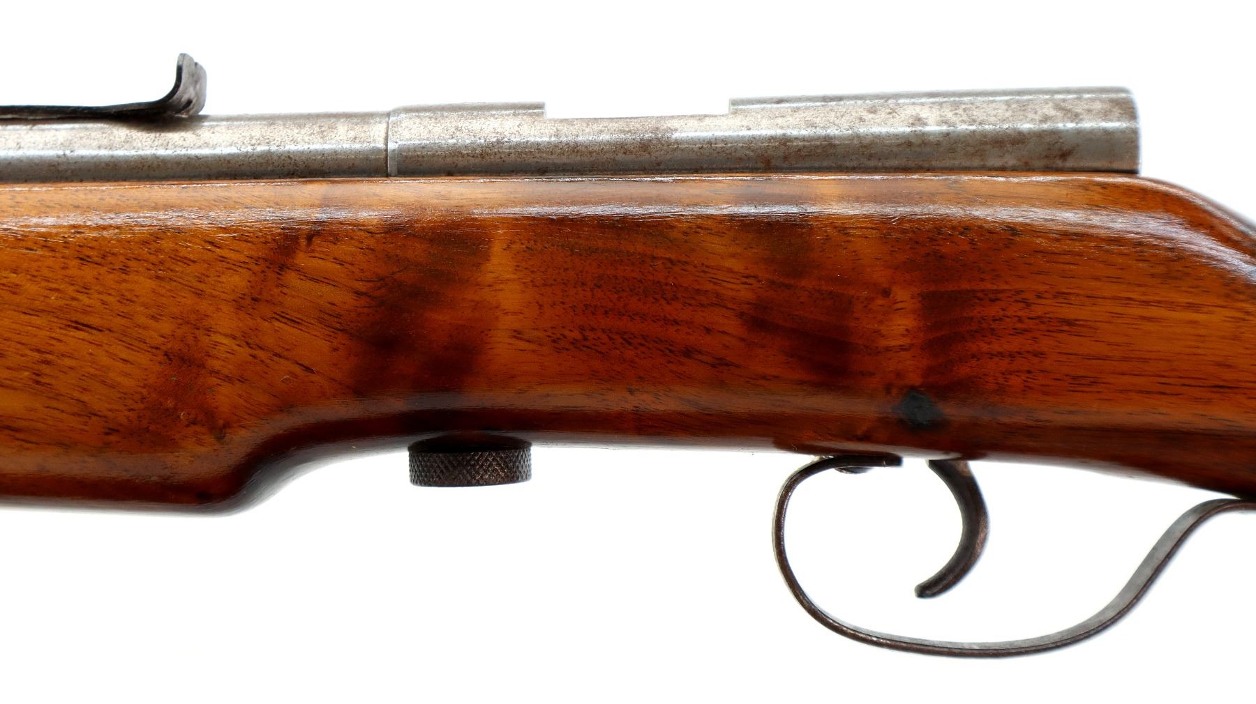 Main Description: Blade front sight, u notched rear sight missing elevator, missing complete bolt butt plate, screws and swivels. One piece wood stock, pistol grip, stock cracked at the rear.