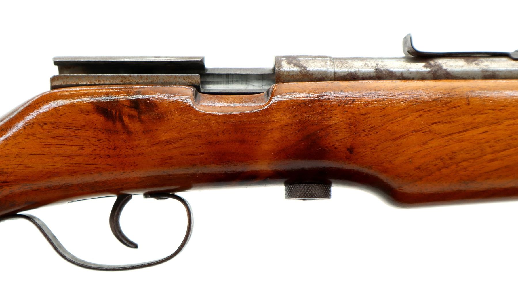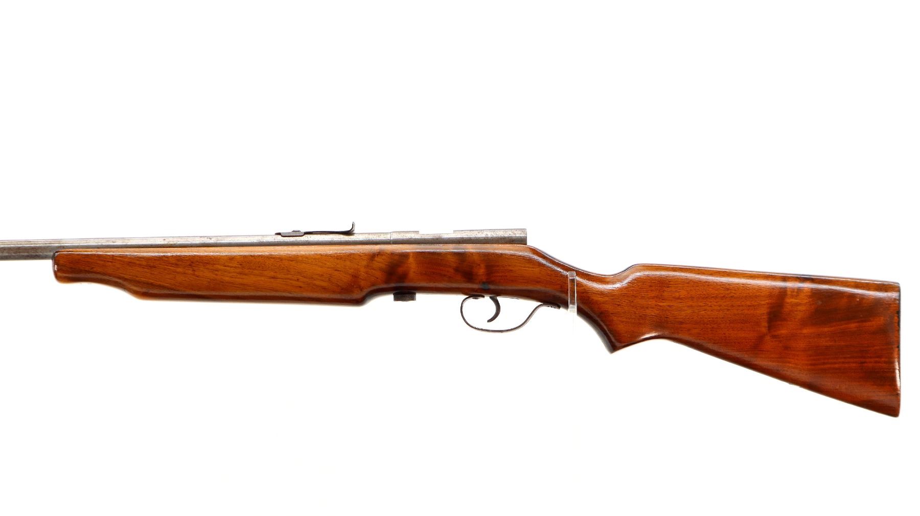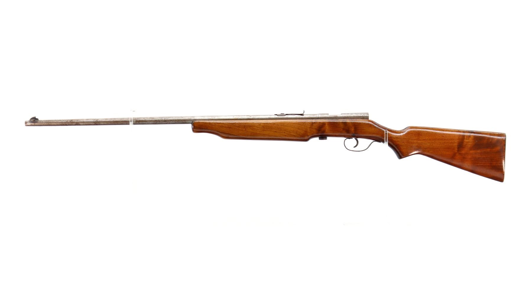Main Description: Blade front sight, u notched rear sight missing elevator, missing complete bolt butt plate, screws and swivels. One piece wood stock, pistol grip, stock cracked at the rear.