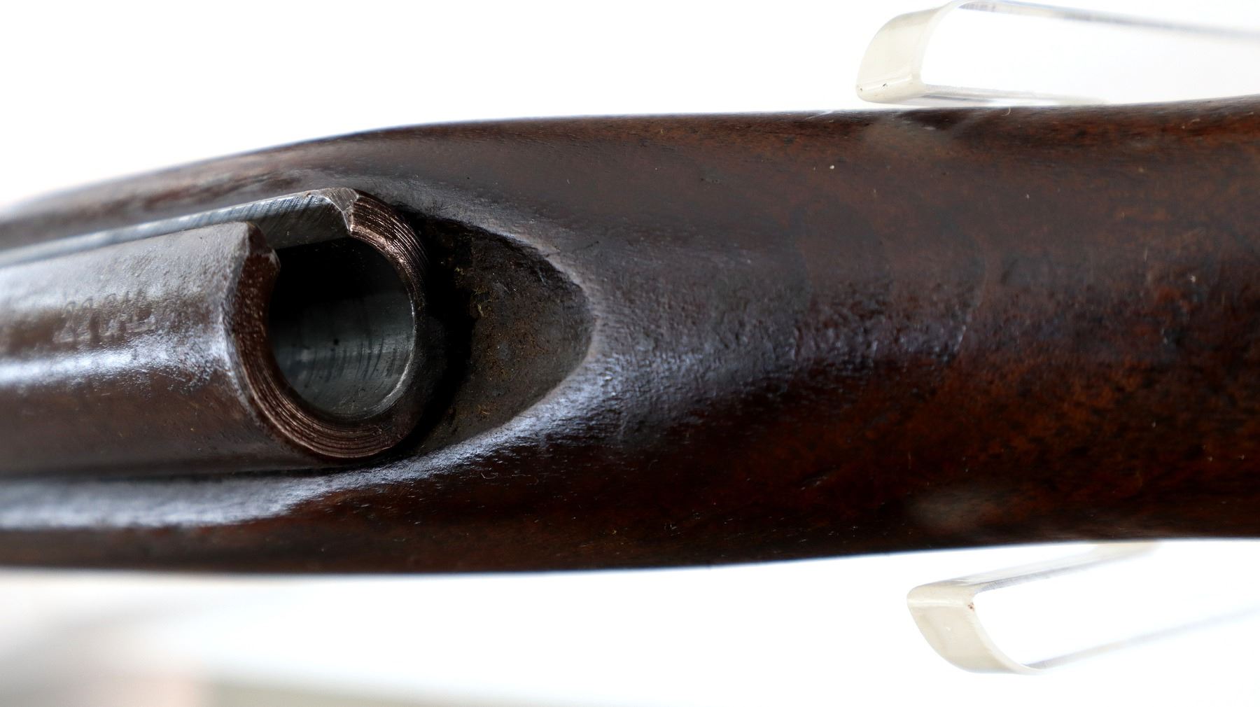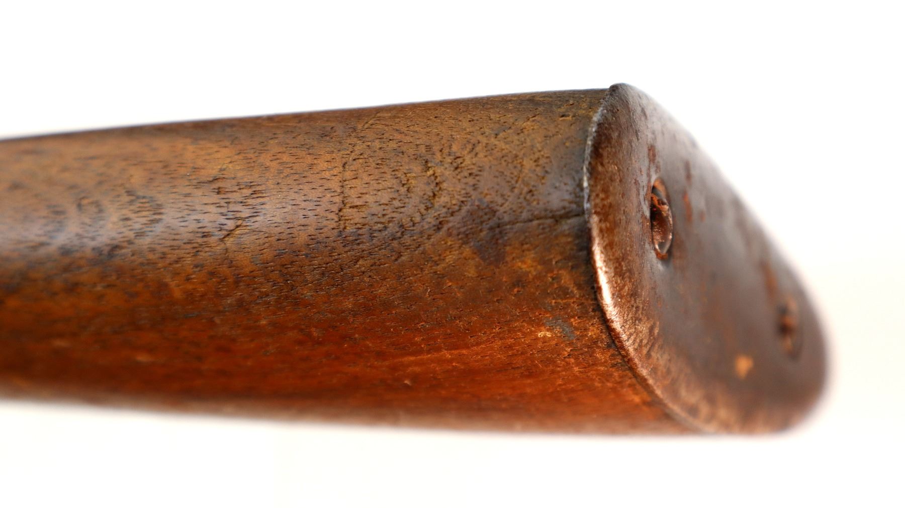 Wear: Metal finish turning brown with pitting, rust, scratches, handling marks and wear. Stock shows marks, scratches and wear.