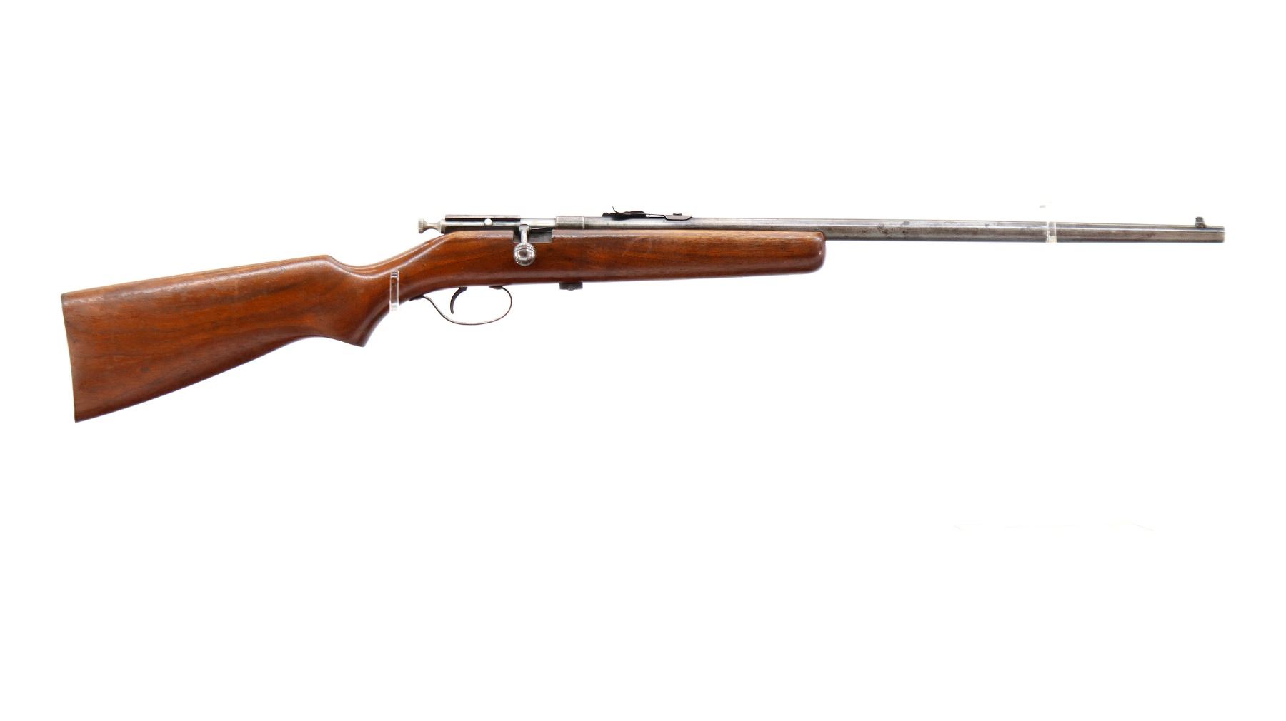 Main Description: Blade front sight, adjustable u notched rear sight, grooved bolt knob, extractor is present. One piece wood stock, pistol grip, smooth steel butt plate.