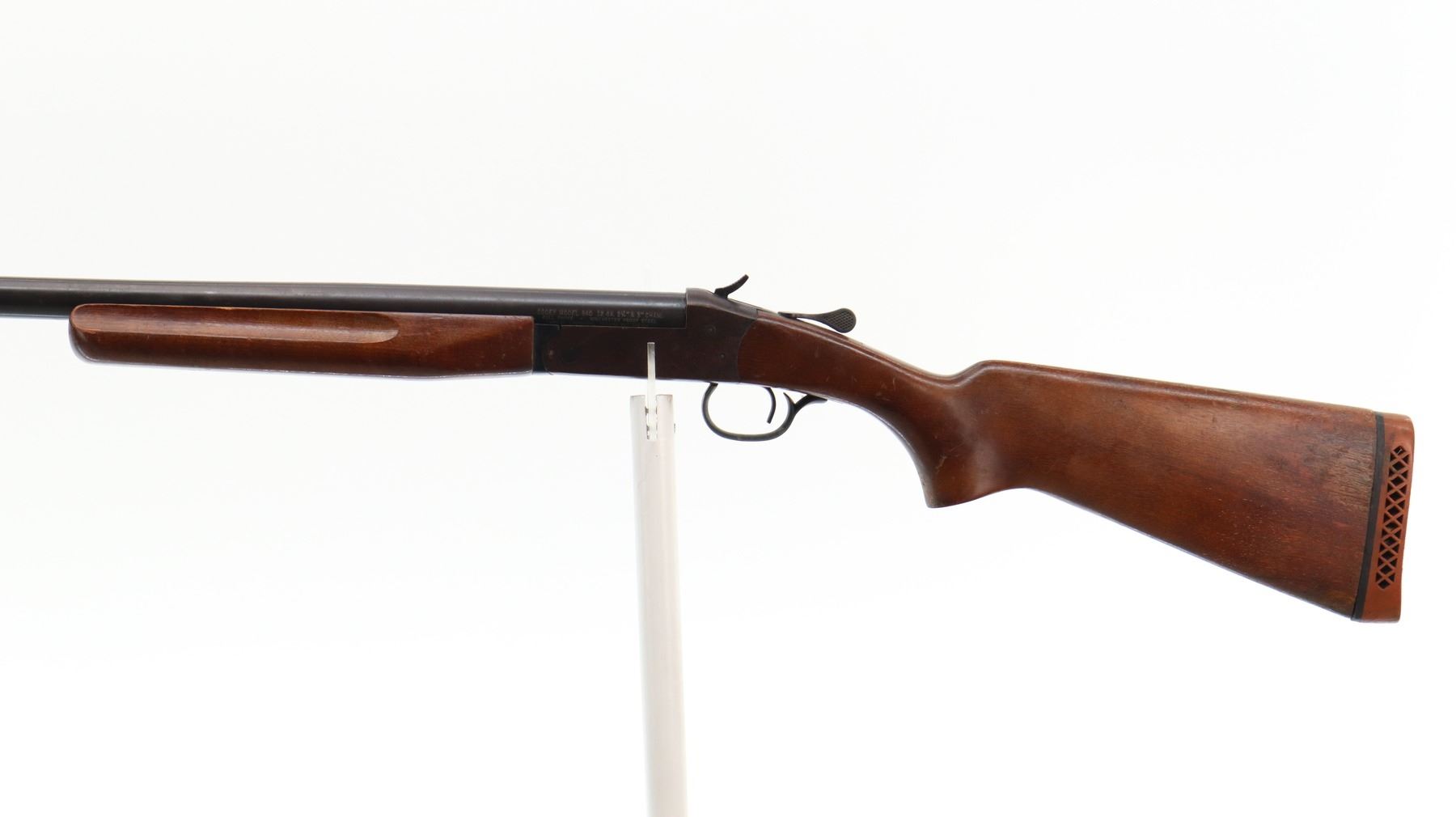 7/10 , COOEY/WINCHESTER , MODEL: 840 GOOSE GUN , CALIBER: 12GA X 3" , BORE IS VERY GOOD. FIXED FULL CHOKE. BRASS BEAD, ROUND BARREL. TWO PIECE SMOOTH WOOD STOCKS, FINGER GROOVED FOREND, PISTOL GRIP, RED VENTED RUBBER RECOIL PAD. METAL FINISH SHOWS LIGHT RUST SPECKLES, HANDLING MARKS AND WEAR. STOCKS SHOW DINGS, SCRATCHES AND WEAR. , ACTION: HINGE SINGLE SHOT SHOTGUN , BARREL LENGTH: 36" , CONDITION: 7/10 , SERIAL # 473665 , CLASS: CANADIAN NON RESTRICTED