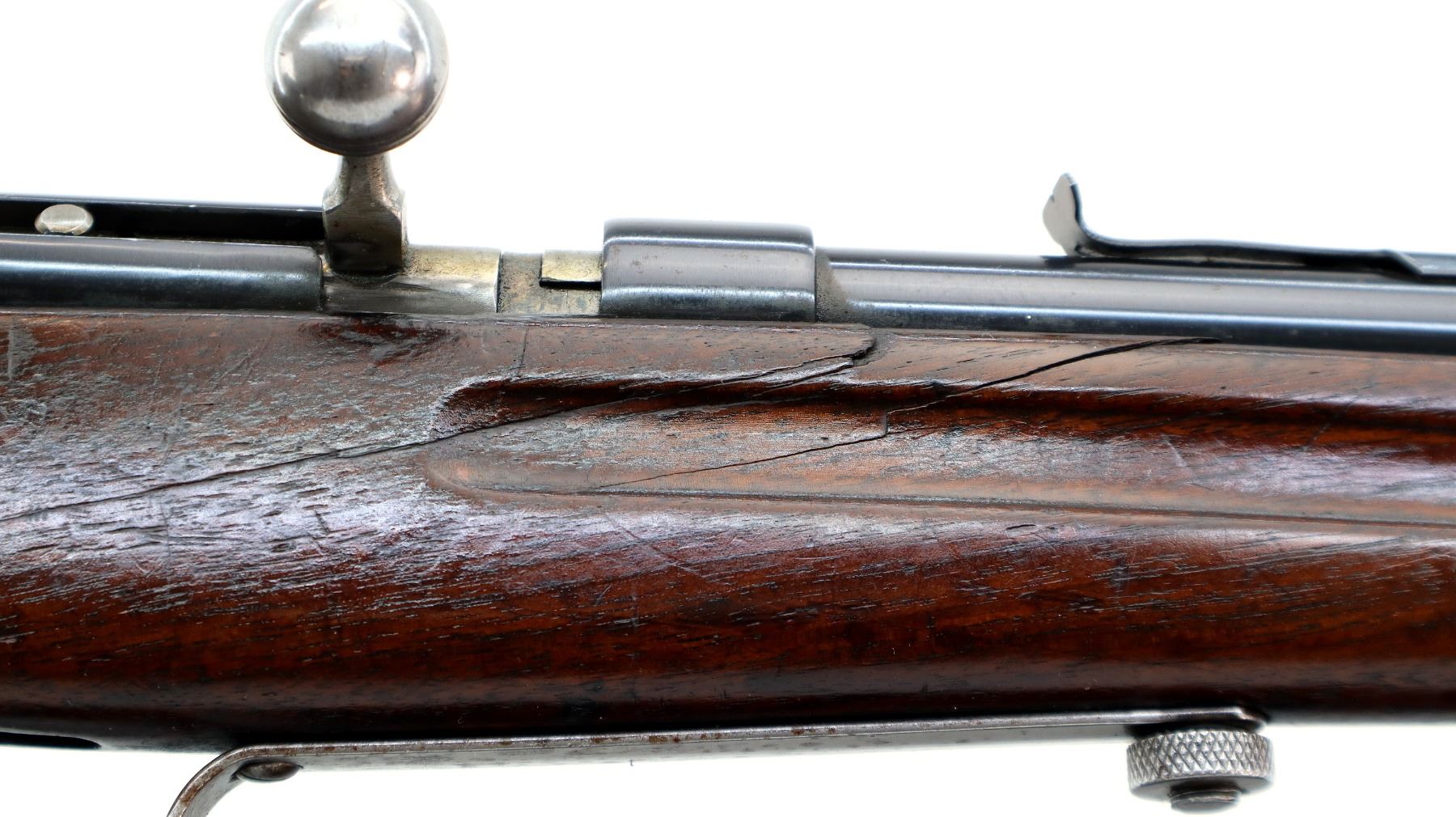 Main Description: Blade front sight, u notched rear sight missing elevator, blued finish, receiver drilled and tapped with no plug screws installed. One piece wood stock, finger grooved forearm which is cracked on right side, pistol grip, smooth steel butt plate