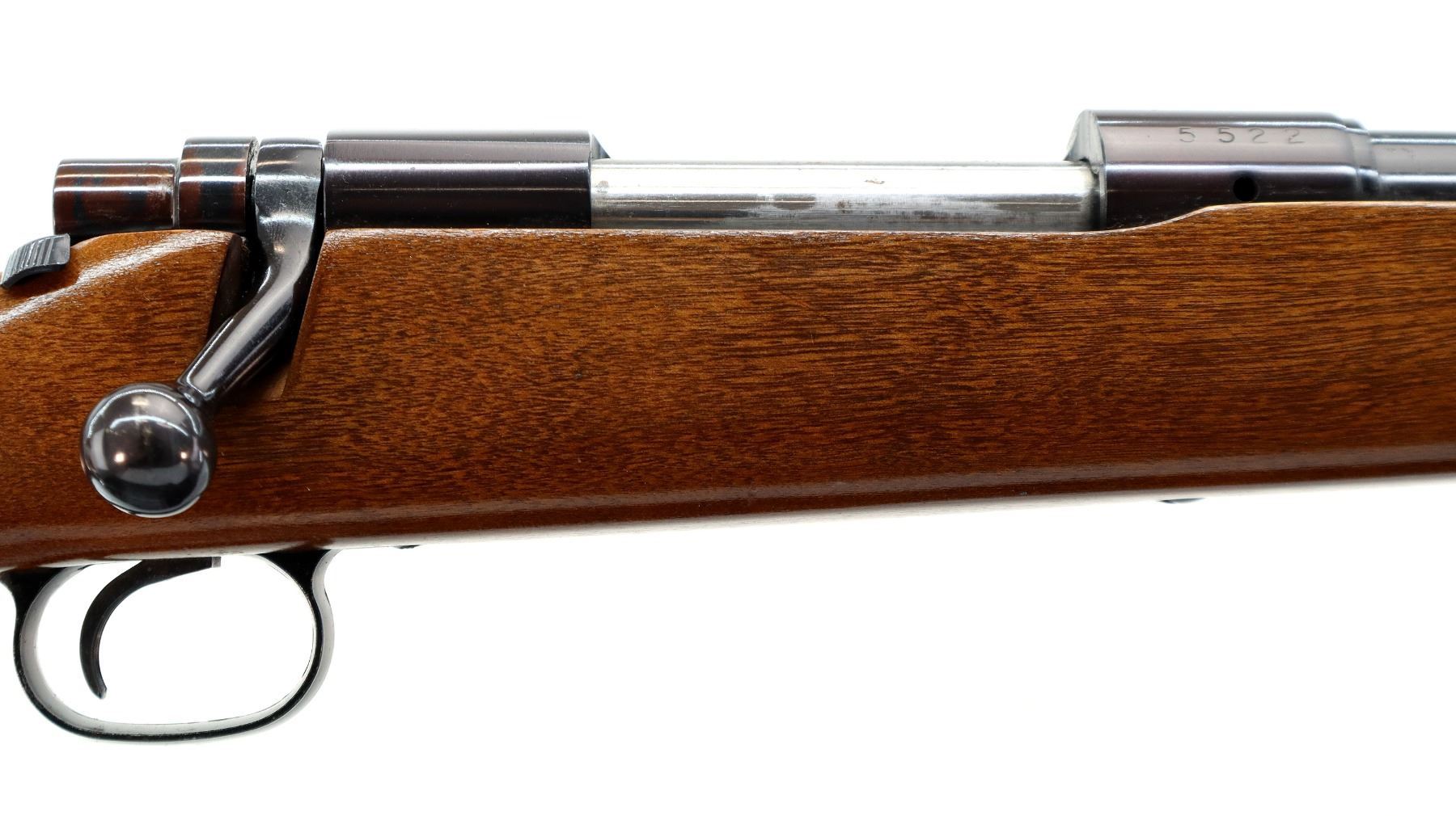 Main Description: Blade front sight with ramp, adjustable folding u notched rear sight, blued finish, receiver drilled and tapped with plug screws installed, smooth bolt knob. One piece wood stock, pistol grip, raised comb, grooved black polymer butt plate, blind magazine, sling swivels.