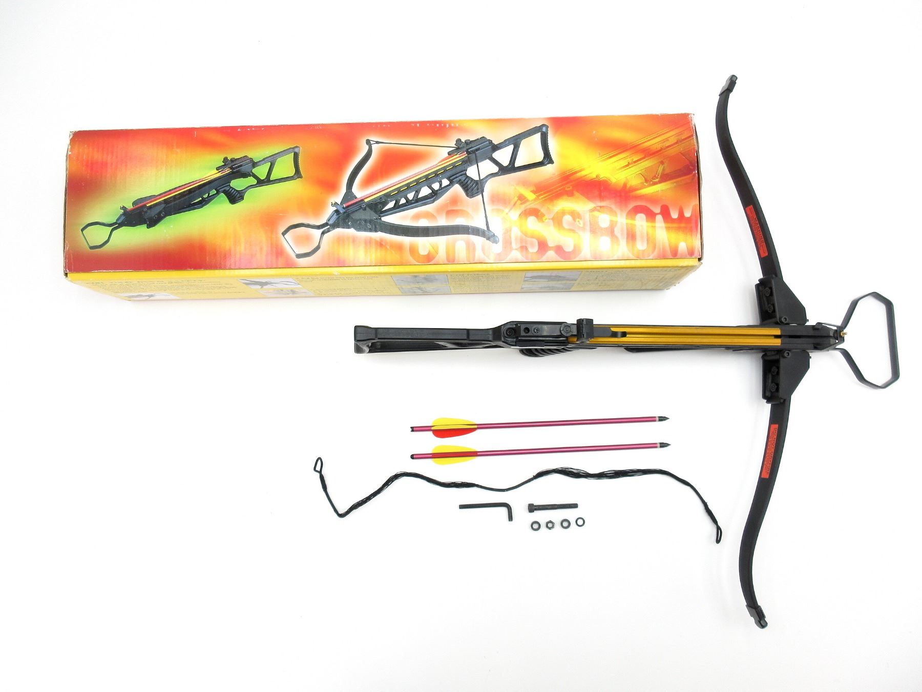 LOT INCLUDES; (1) RECURVE CROSS BOW, UNKNOWN SPEED OR DRAW WEIGHT, FIBERGLASS LIMBS, (1) STRING, (2) ALUMINUM ARROWS WITH FIELD TIPS, ADJUSTABLE SIGHTS, AUTO SAFETY WHEN COCKING, FOOT STURUP, NOS, SEE PHOTOS.