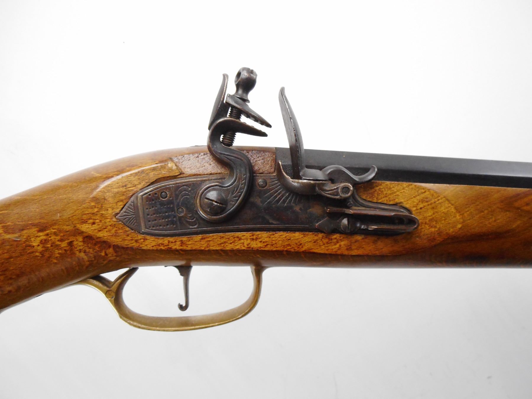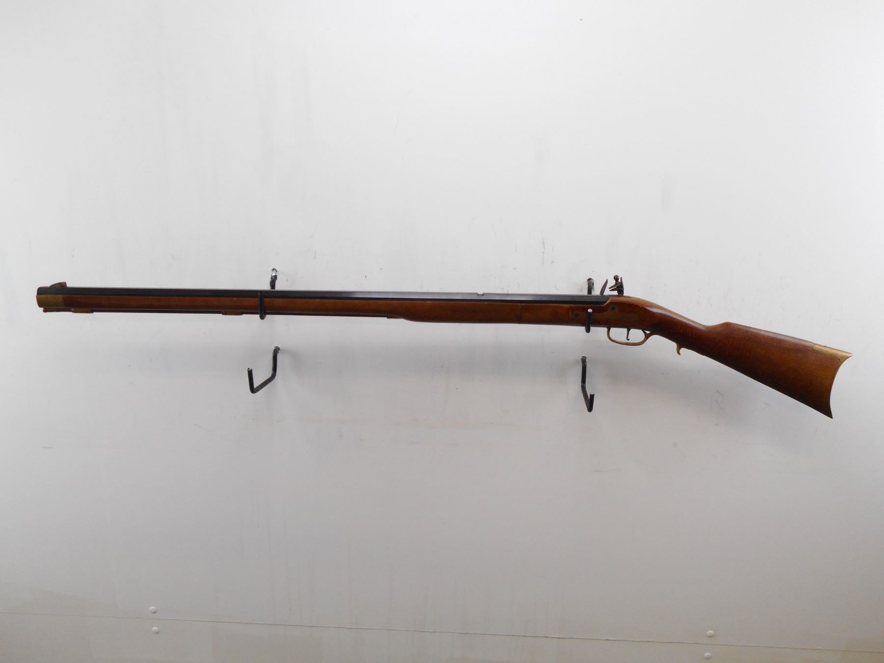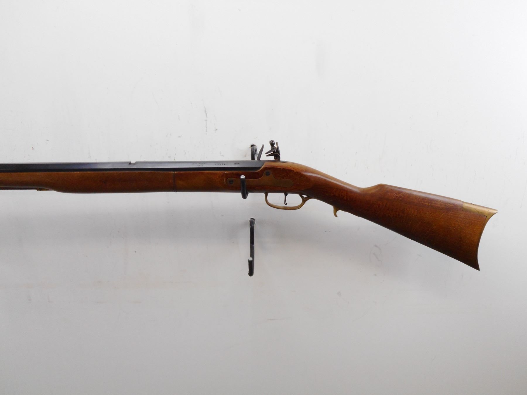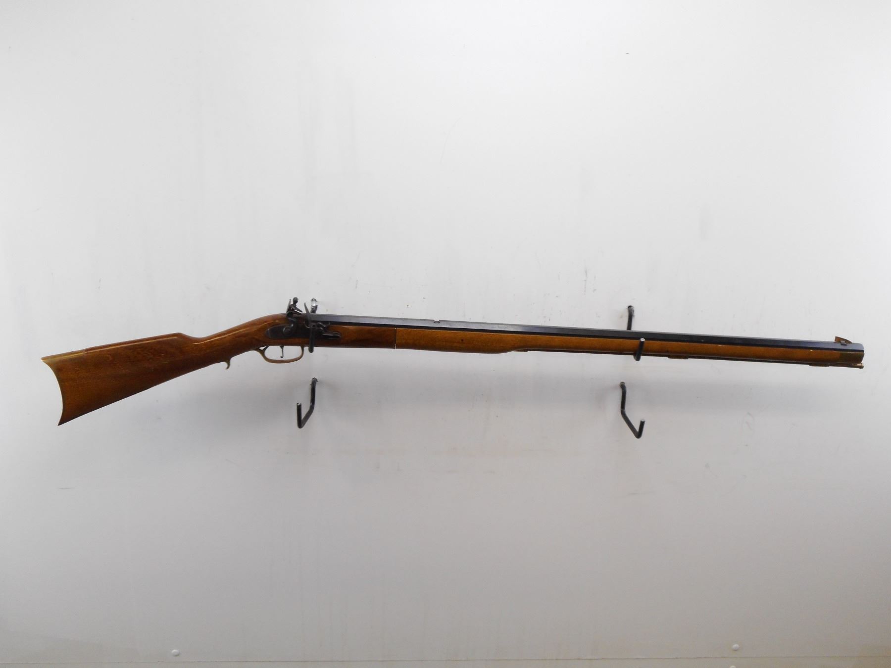 7/10 ANTIQUE , CVA JUKAR , MODEL: KENTUCKY RIFLE REPRODUCTION , CALIBER: 45 CAL FLINTLOCK , BORE IS VERY GOOD. BLADE FRONT SIGHT, MISSING THE REAR SIGHT. TWO PIECE WOOD STOCK WITH BRASS BUTT PLATE, TRIGGER GUARD, AND BRASS TIPPED RAM ROD. ETCHED LOCK PLATE. SHOWS VERY LITTLE HANDLING MARKS. , ACTION: SINGLE SHOT FLINTLOCK , BARREL LENGTH: 35" , SERIAL # 19804 , CLASS: CANADIAN ANTIQUE CLASS NO LICENSE REQUIRED