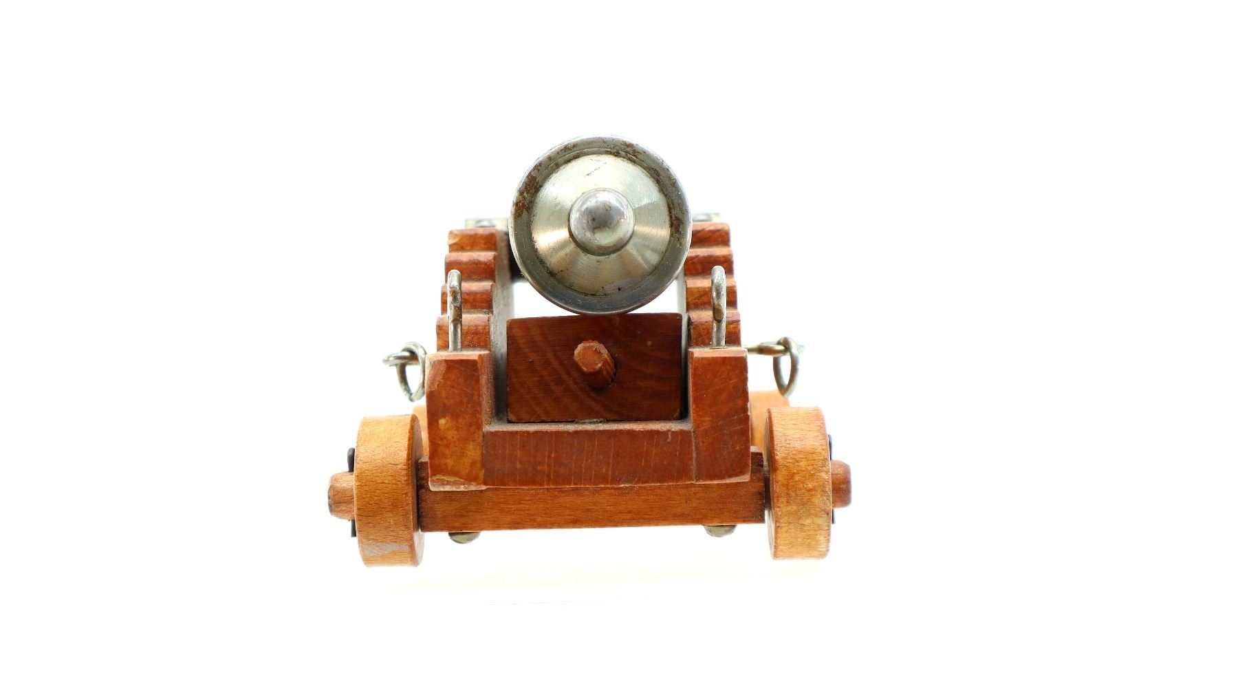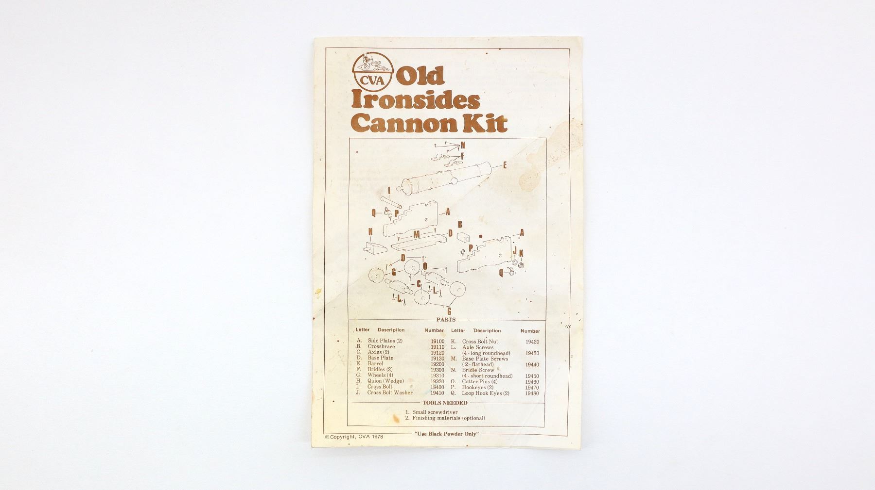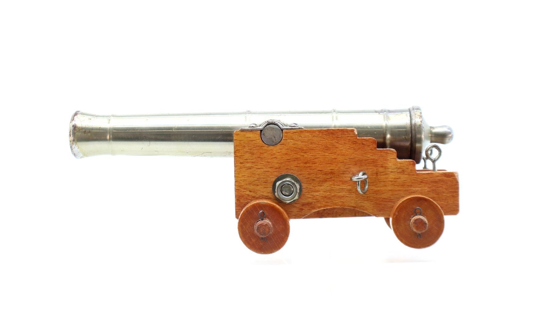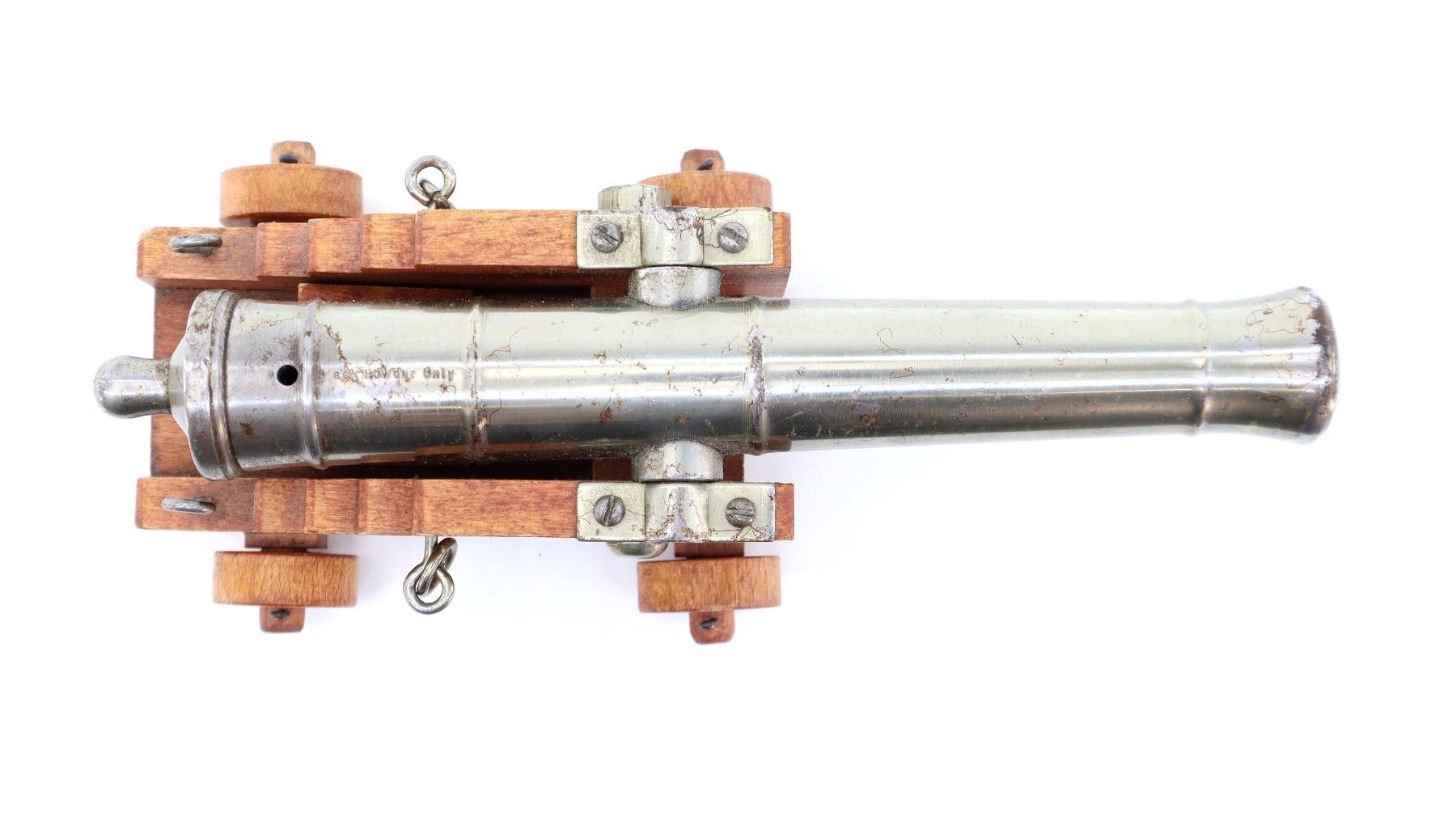 Main Description: This Cannon made in Spain and has been assembled from a kit. No sights, steel barrel with flashole, has a wood carriage with four wood wheels, various small steel eyelets, elevation block. OAL Length Approx. 7.5", OAL Height Length Approx. 3", OAL Width Approx. 3.5"