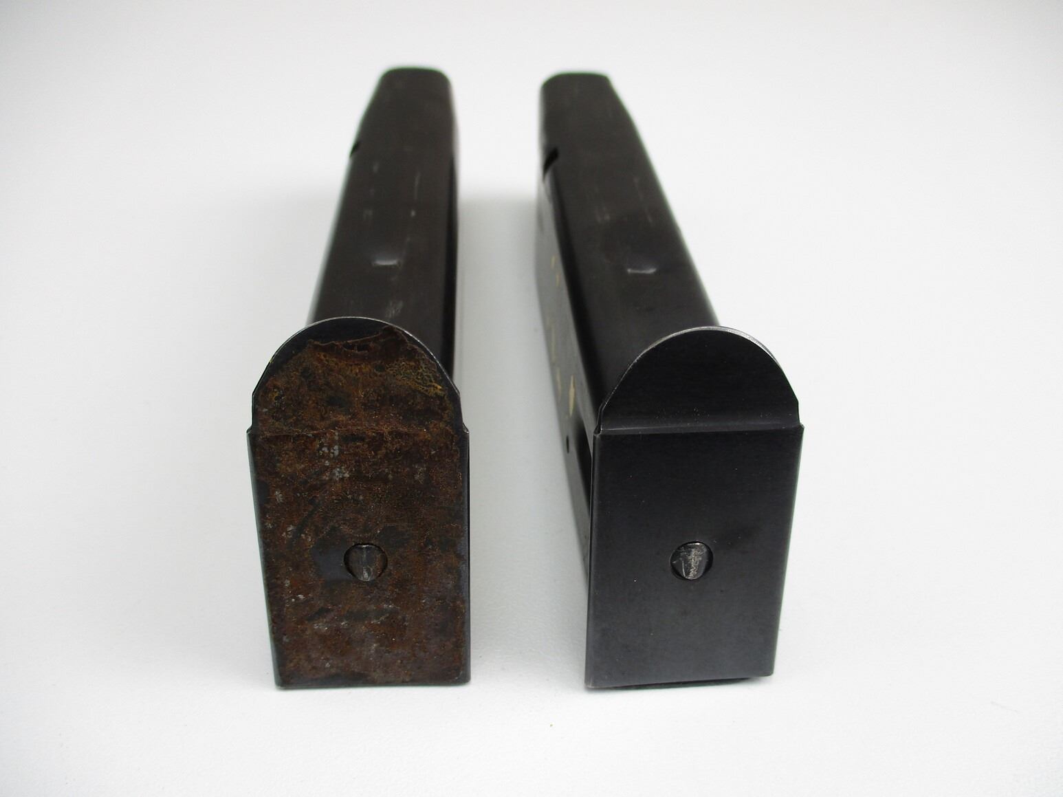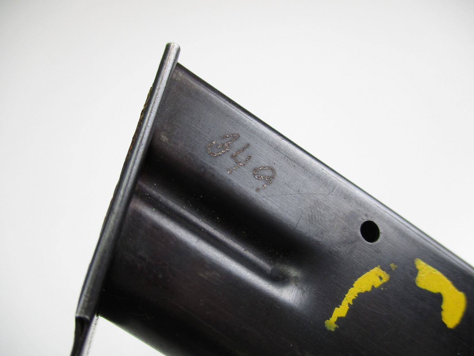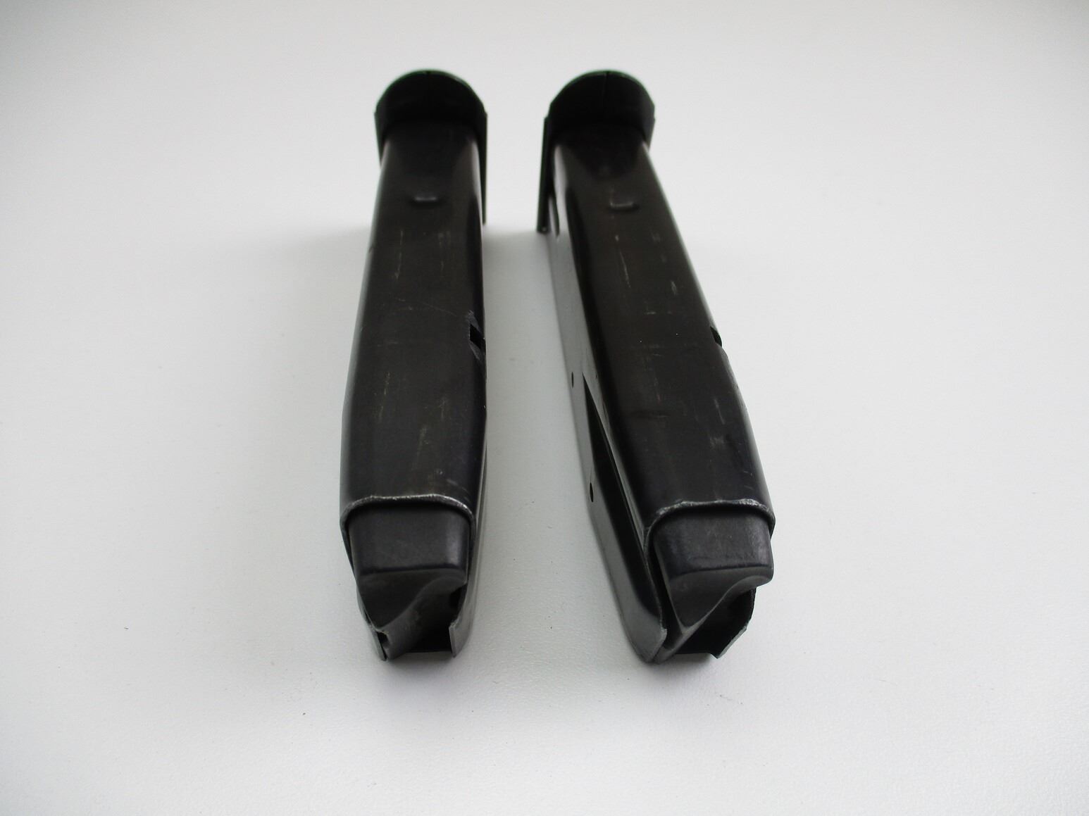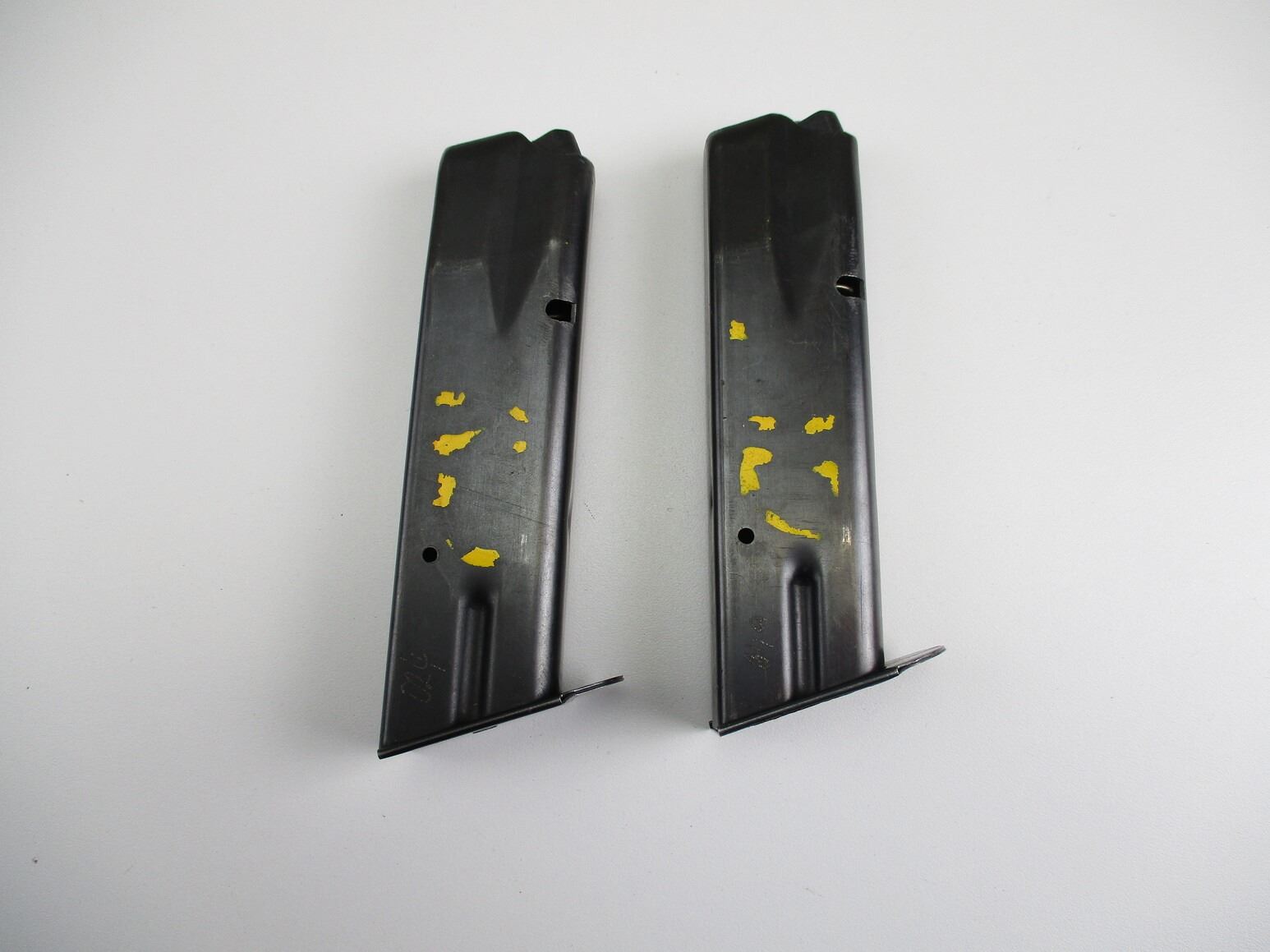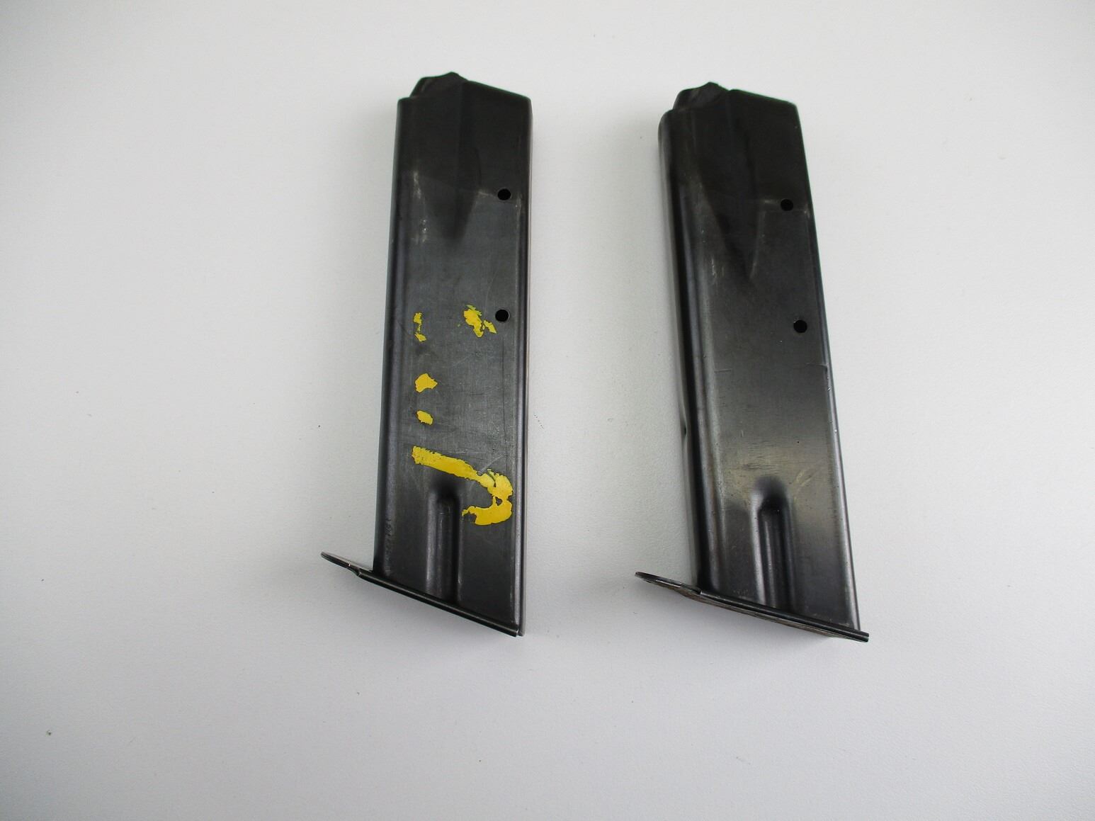 CZ 75 / 85 PISTOL MAGAZINES , LOT OF 2. 9MM, 10 / 13 ROUND MAGS, BLUED STEEL, POLYMER FOLLOWERS, MAGS MARKED WITH YELLOW PAINT. 1 MAG #'D 349, 1 #'D 024.