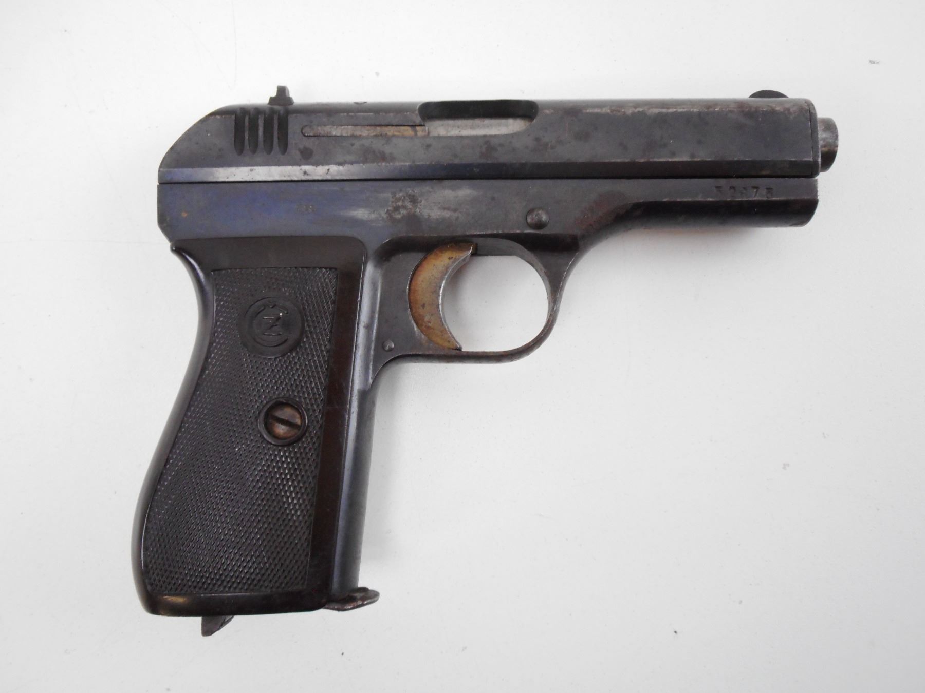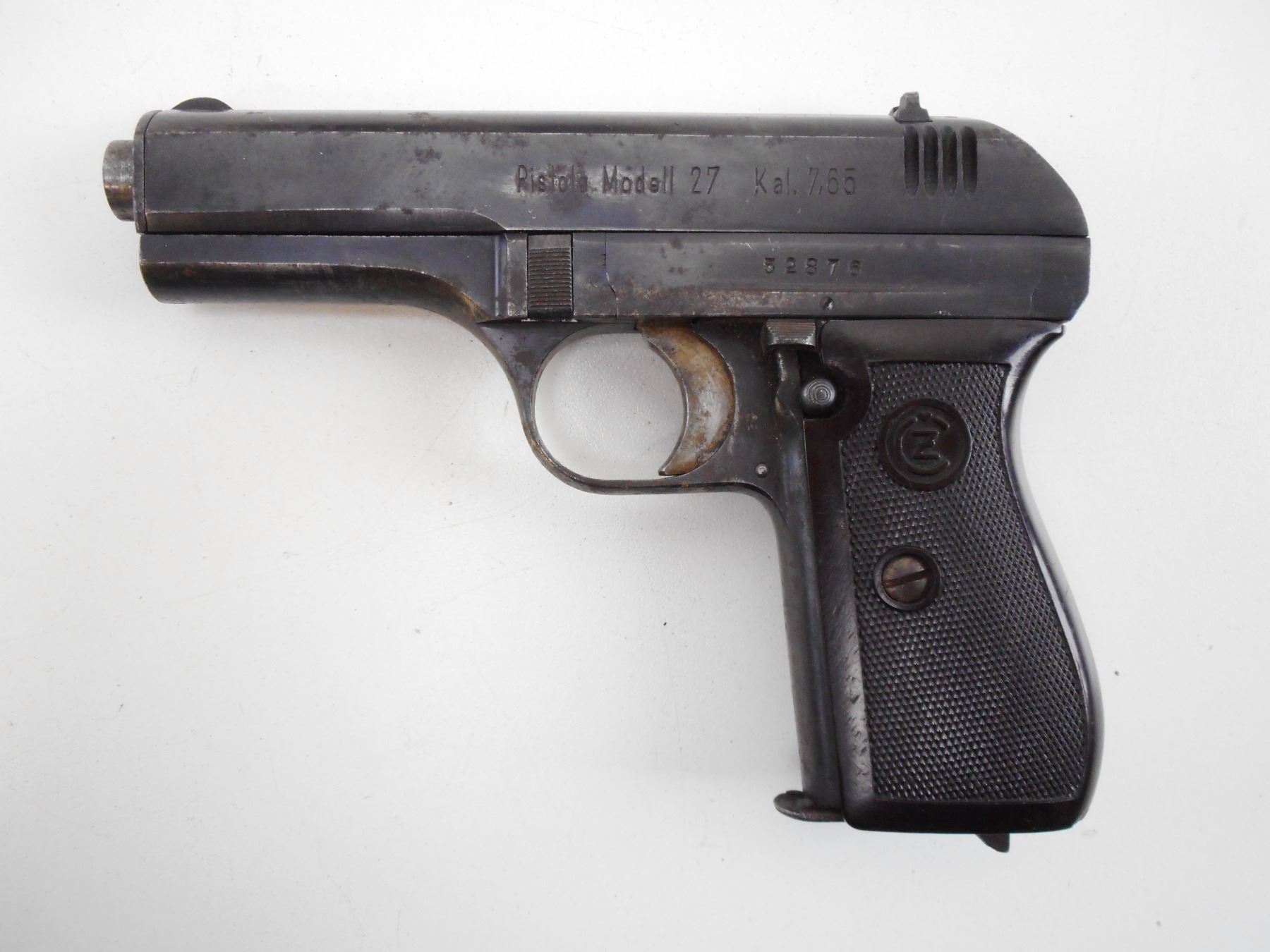 6/10 , CZ , MODEL: 27 , CALIBER: 7.65MM , COMES WITH MAGAZINE , BORE IS FAIR. BLADE FRONT AND RAISED NOTCH REAR SIGHT. CHECKERED BROWN WRAP AROUND PLASTIC GRIP WITH CZ LOGO. SOME LIGHT SURFACE PITTING ON ALL METAL PARTS. SHOWS SOME HANDLING MARKS. , ACTION: SEMI AUTOMATIC , BARREL LENGTH: 98MM , SERIAL# 52876 , CLASS: CANADIAN PROHIBITED CLASS